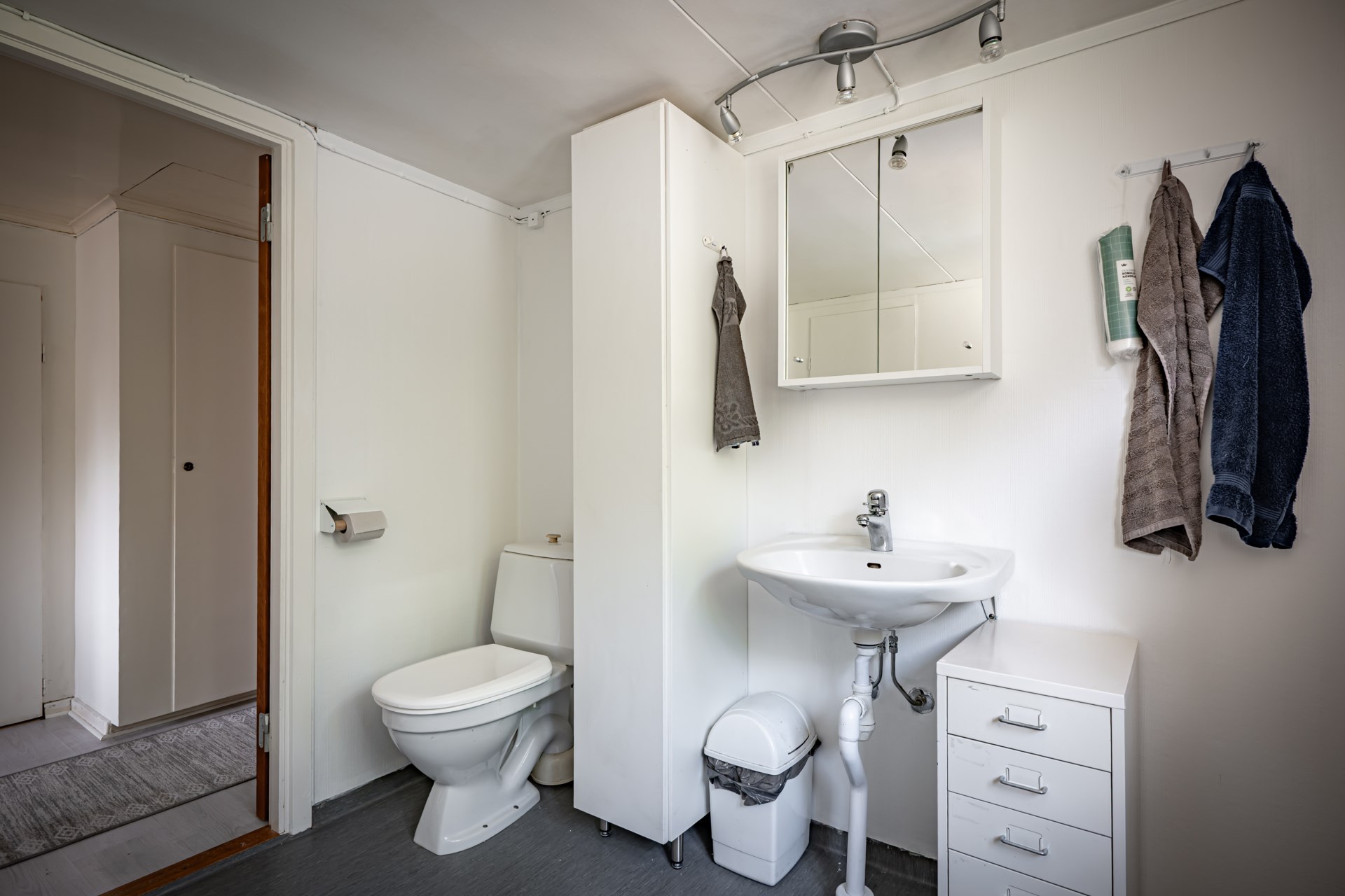 - Badrum: Badrummet är beläget på övre plan och har våtrumsmatta på golvet och ljusa väggar. Här har ni toalett och handfat.