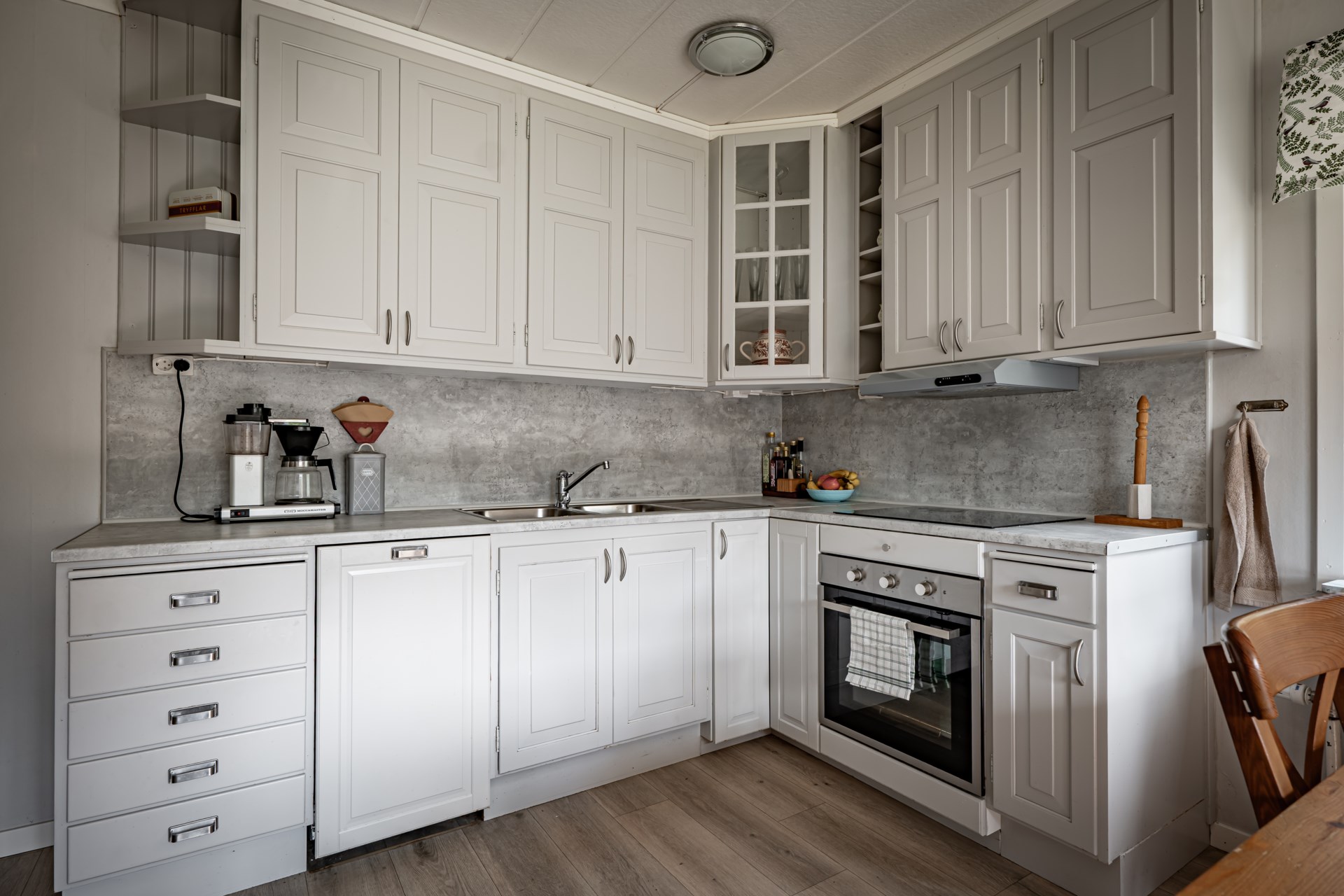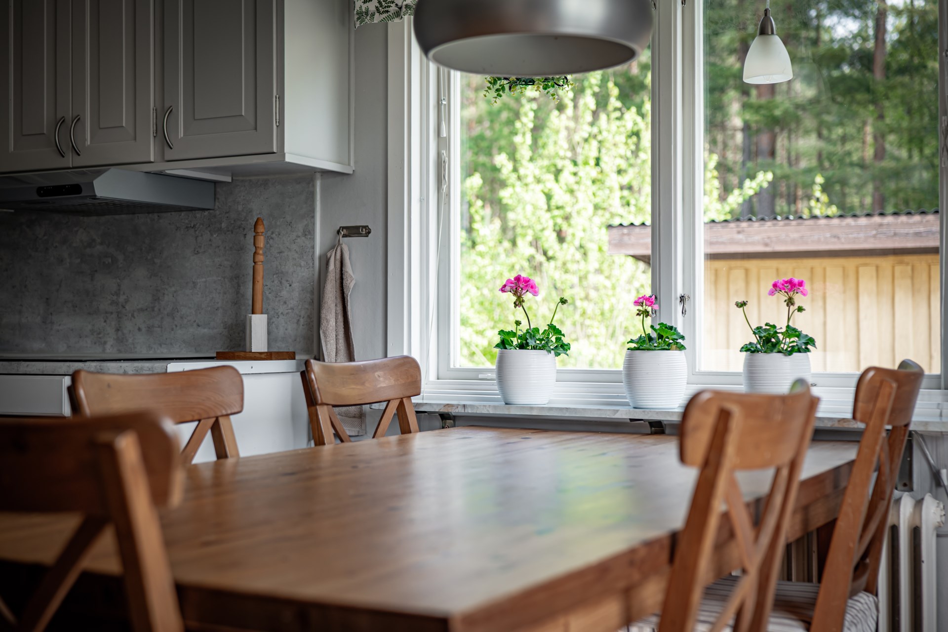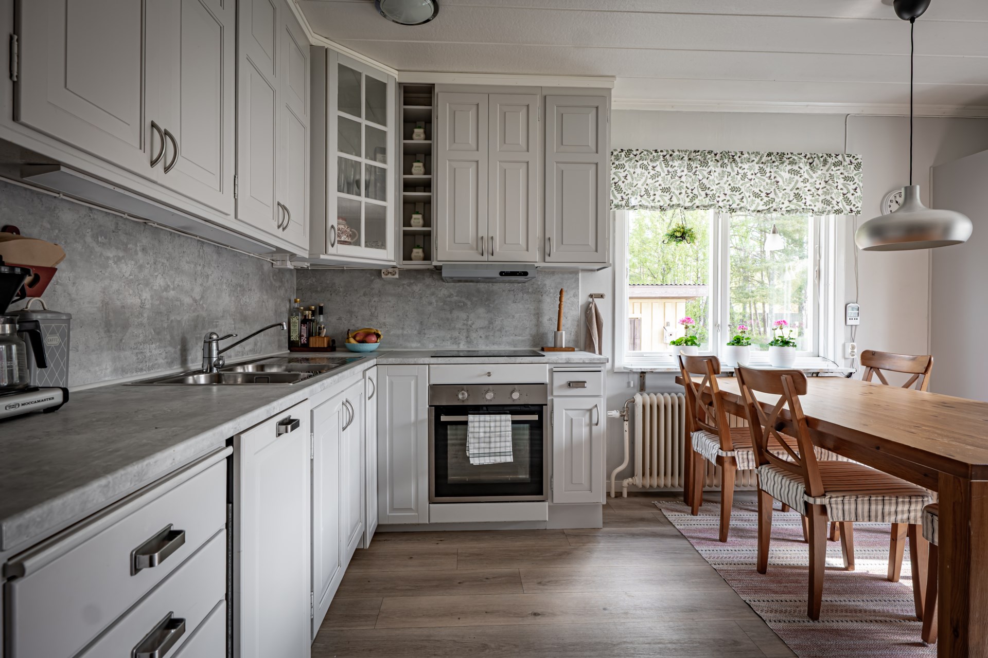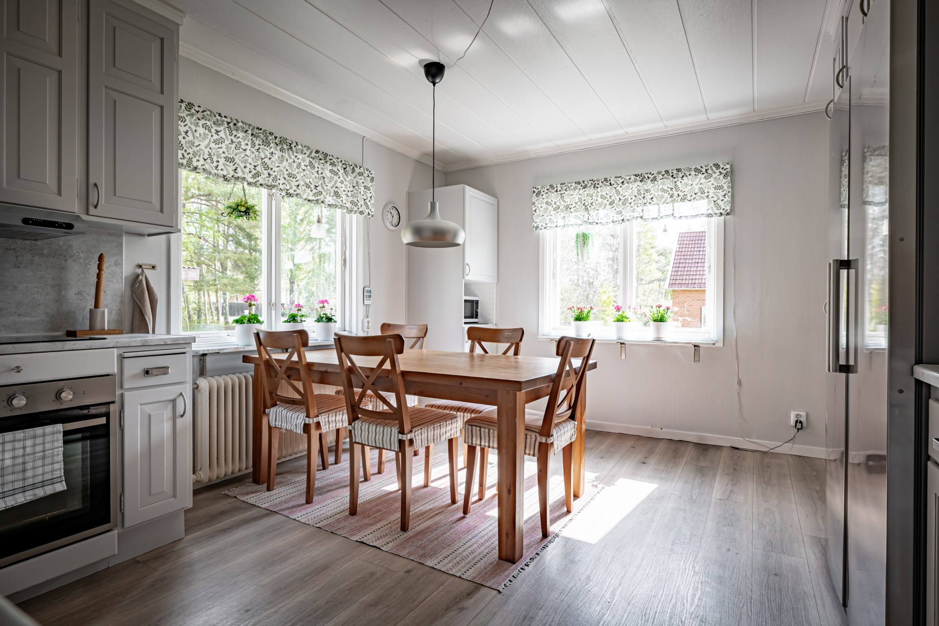 I källaren har ni bra med förvaringsutrymmen, tvättstuga och möjlighet till ett extra allrum, kontor eller kanske ett gästrum? - Kök: Fint kök i gråa toner, köket är utrustat med spishäll, fläkt, ugn, integrerad diskmaskin samt kyl och frys. I köket finns det plats för ett större matbord.