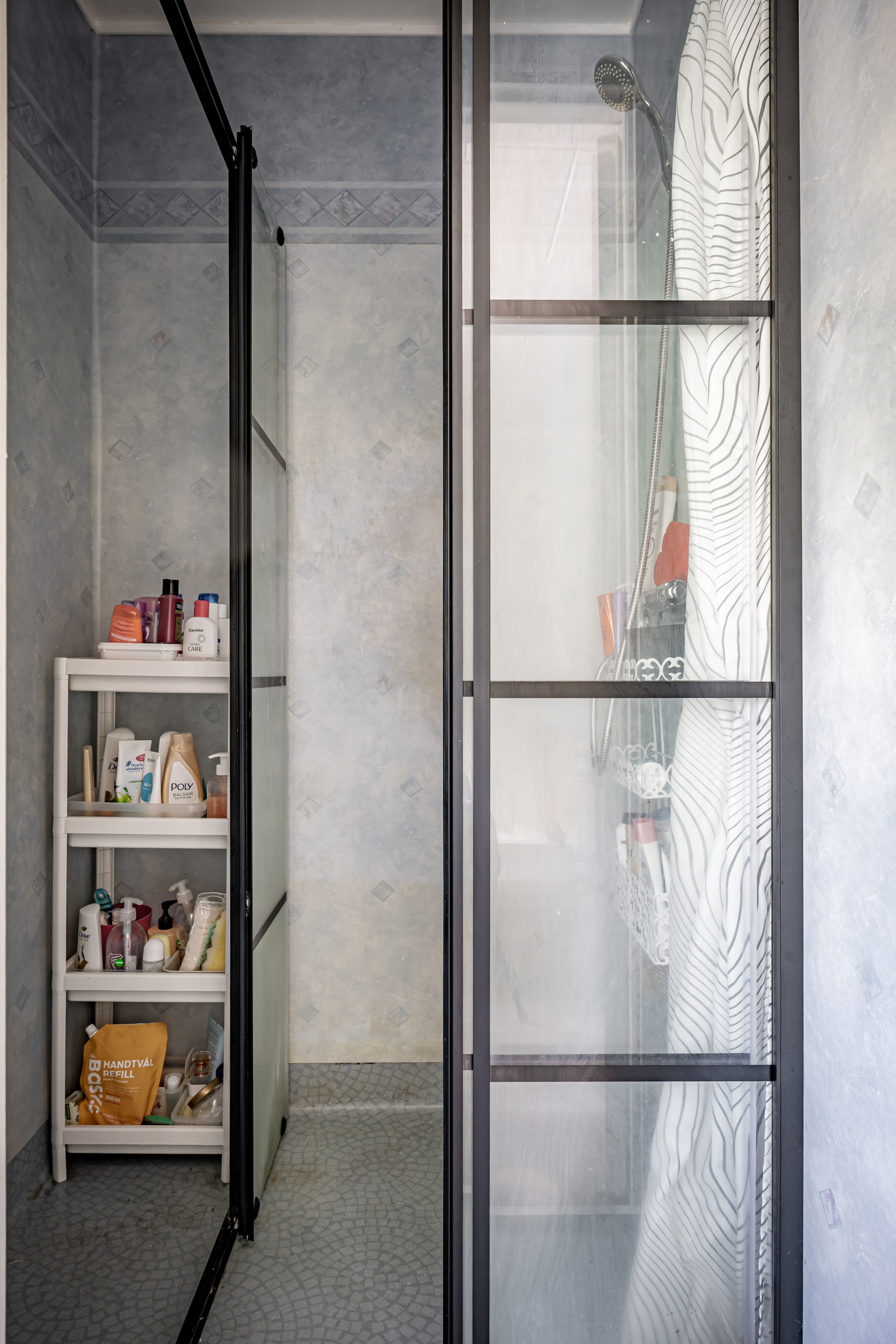 - Duschutrymme: Duschutrymme med våtrumsmatta på väggar och golv.