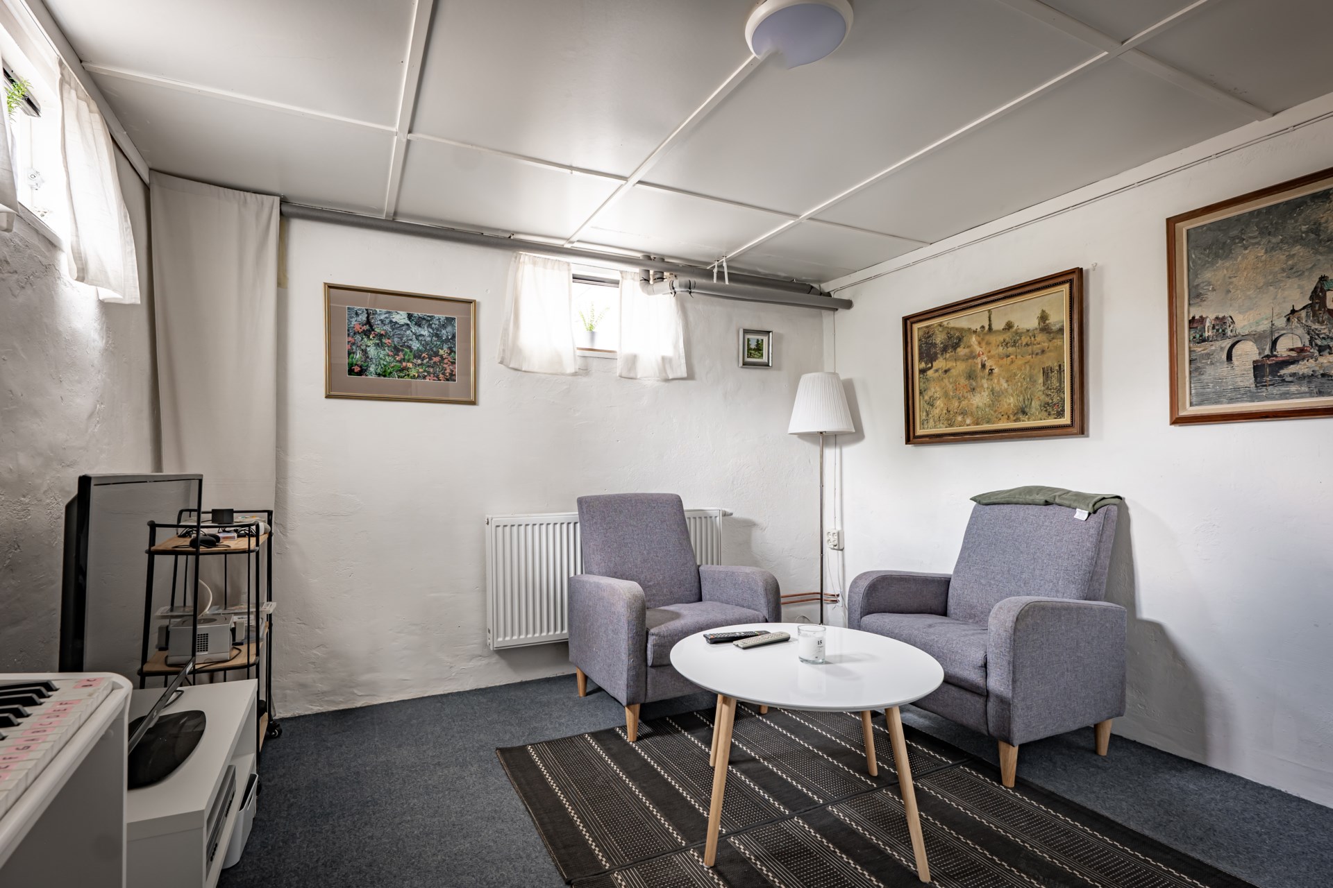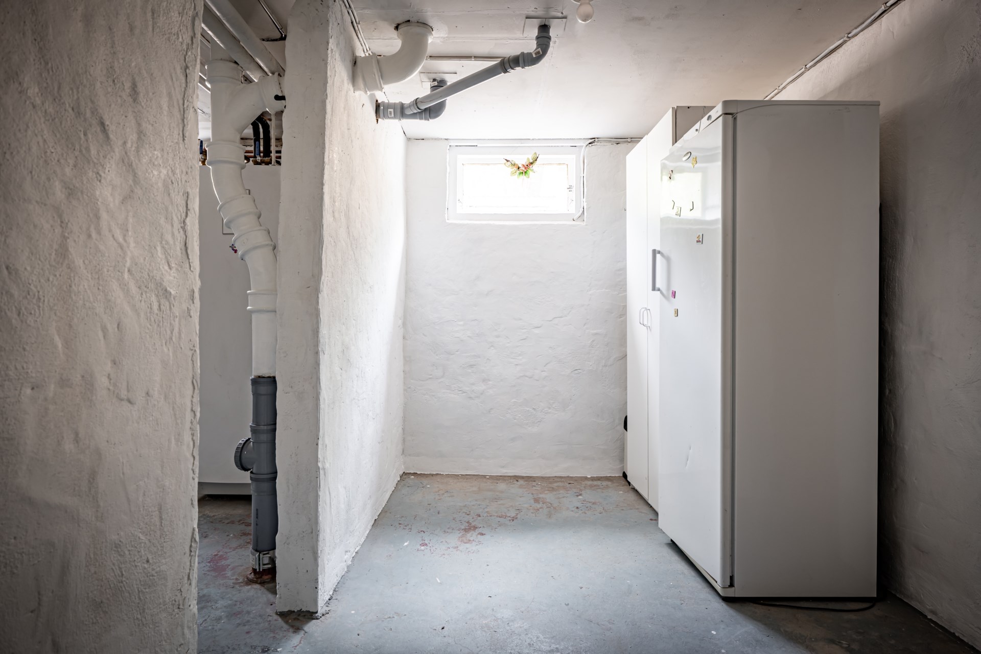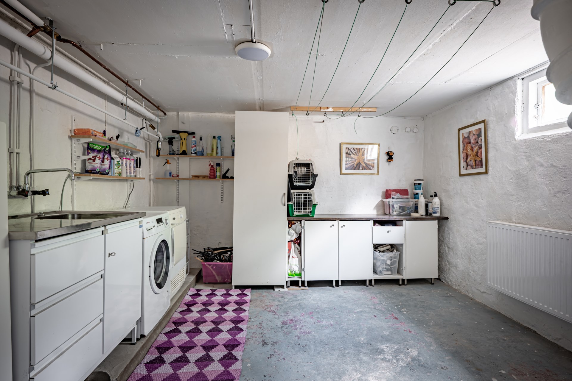 - Tvättstuga: Tvättstugan är belägen i källaren och här ar ni tvättmaskin, tvätthos samt skåp för förvaring. I tvättstugan finns även gott om plats att hänga upp tvätt.