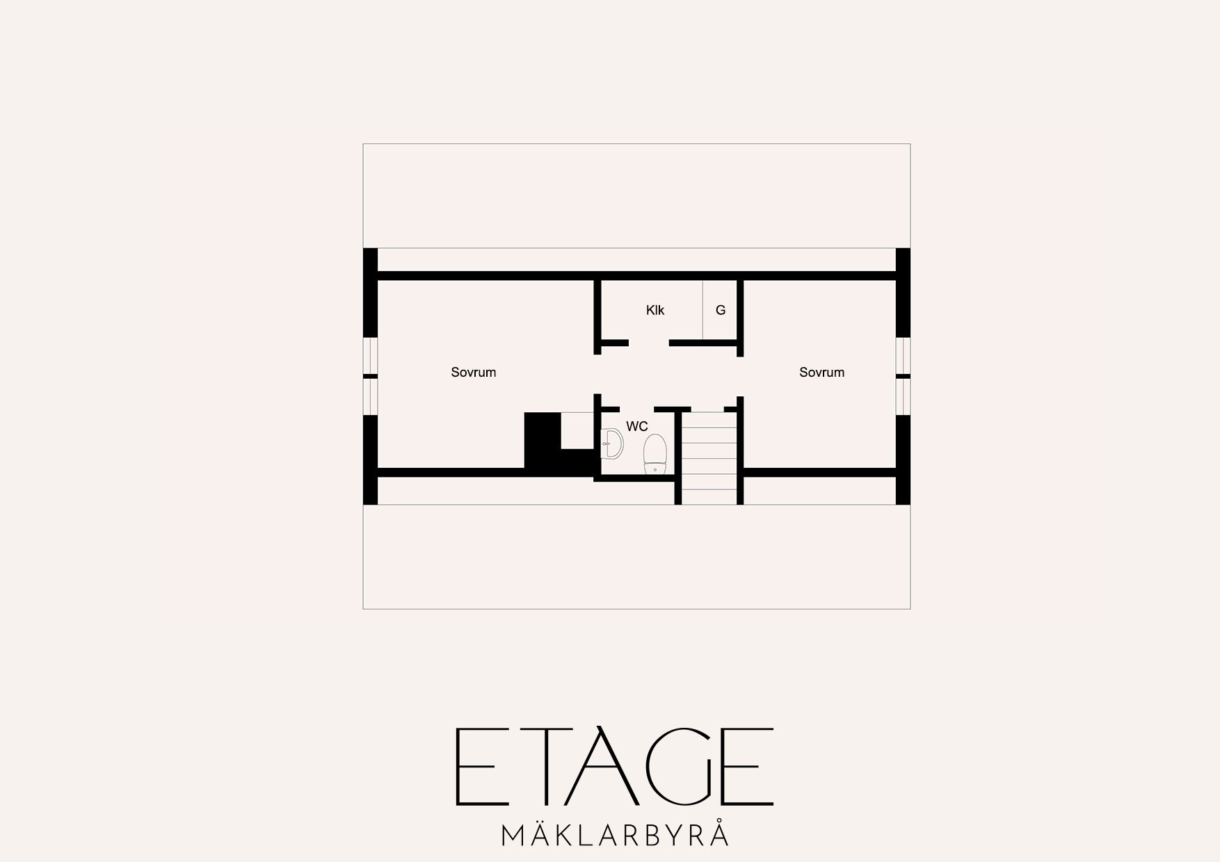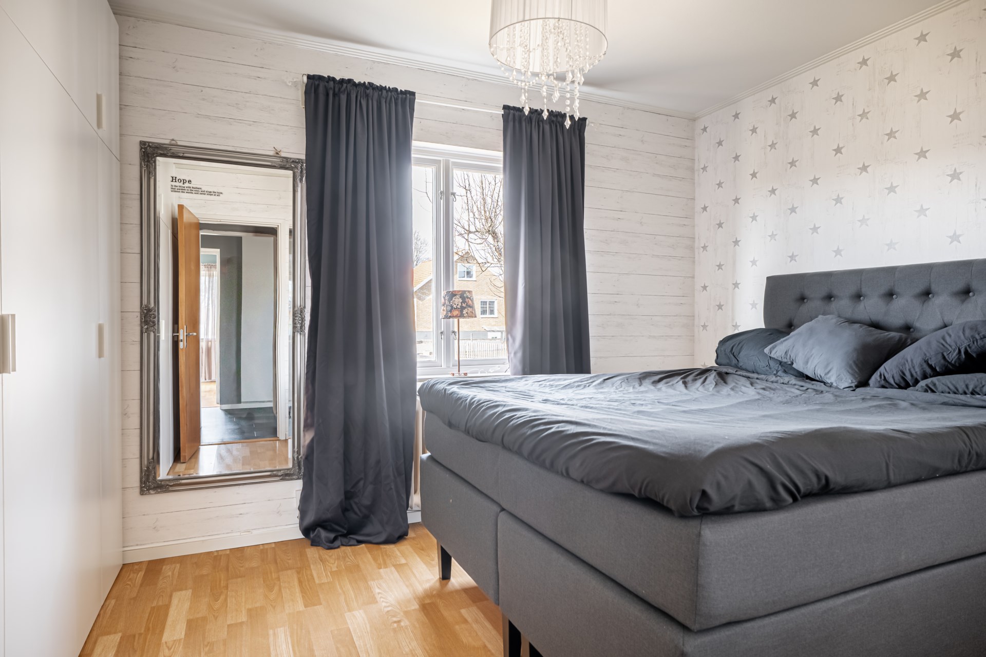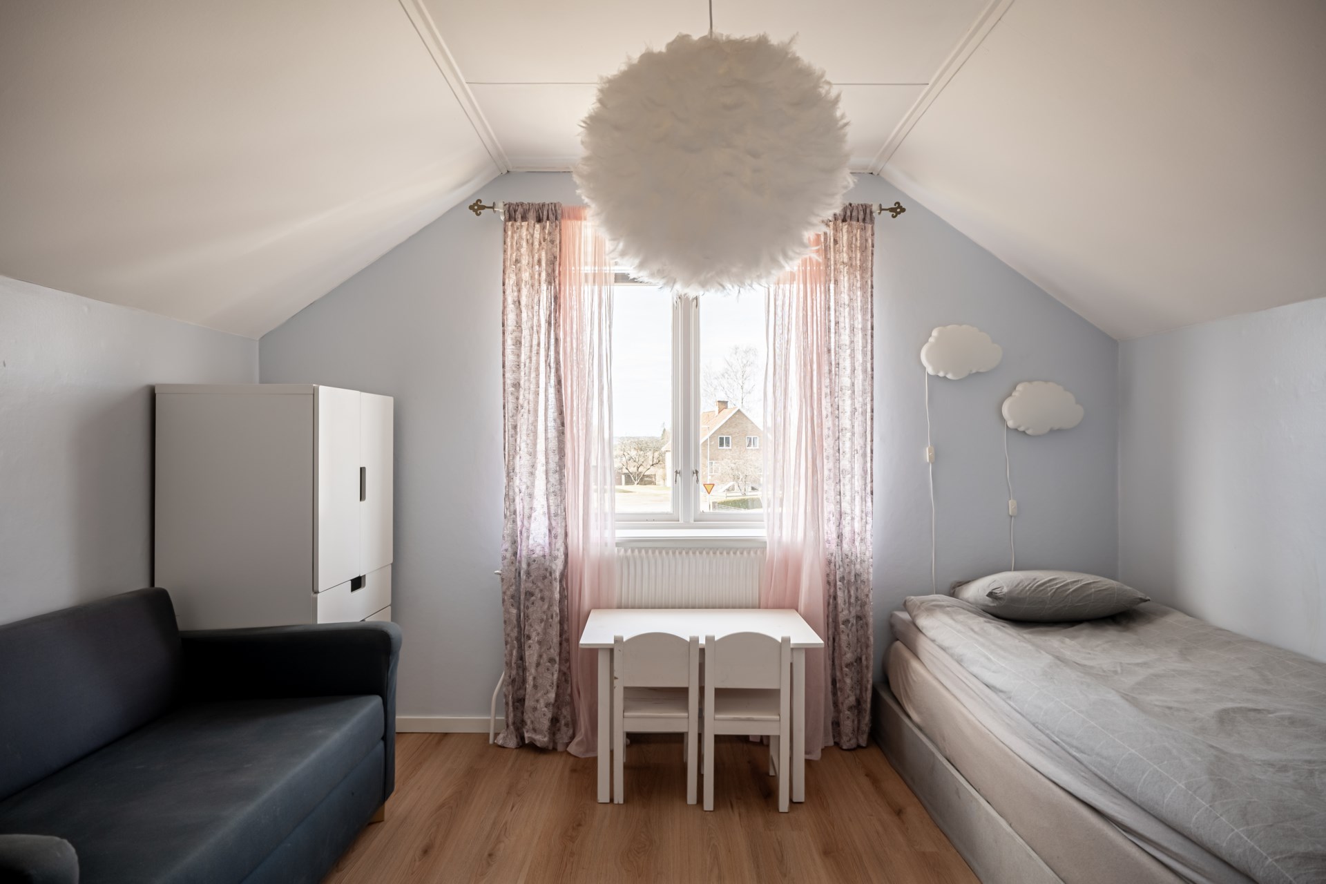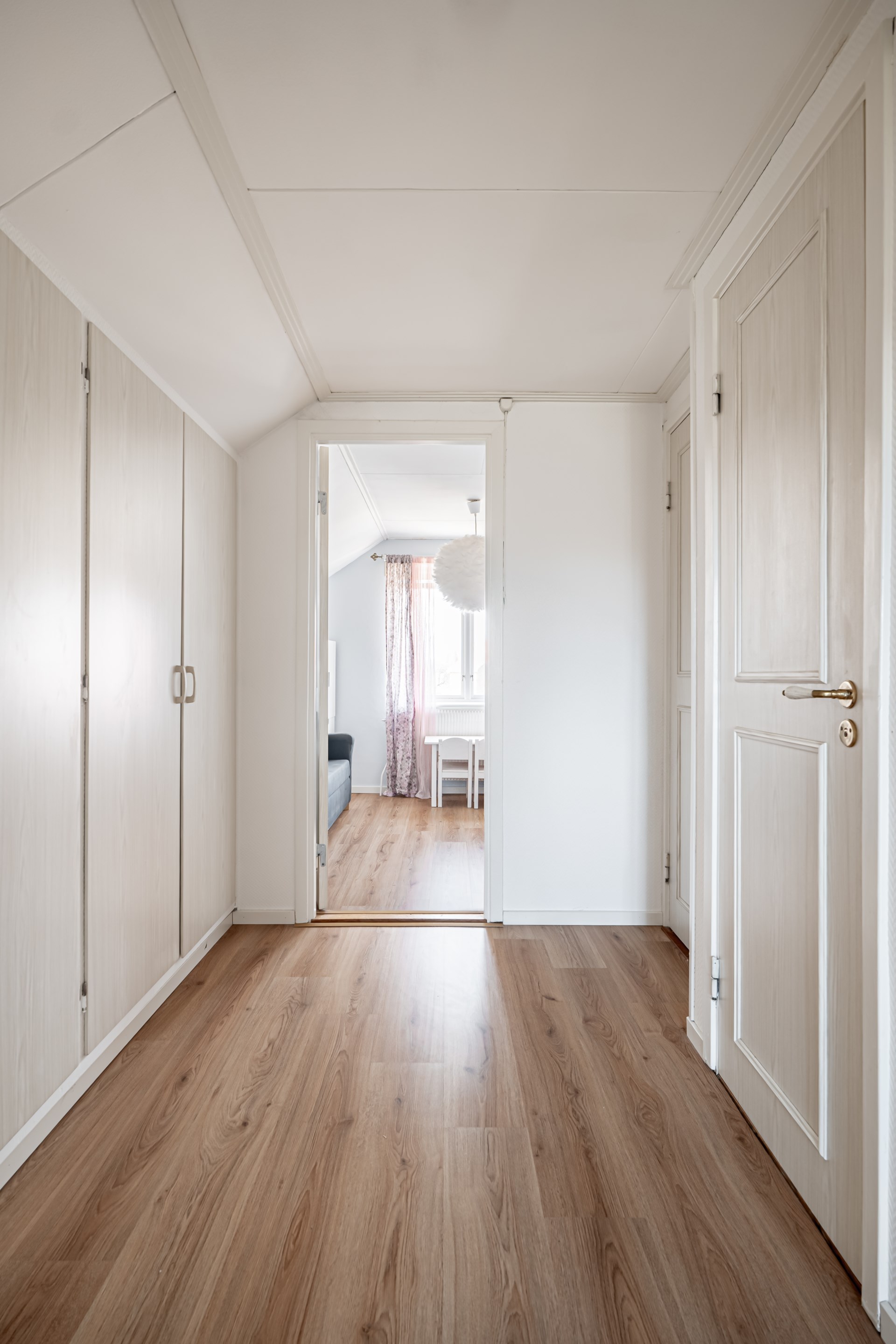 En trappa upp möts du av en hall med tillgång till praktisk klädkammare samt ytterligare förvaring. Här finns två rymliga sovrum med plats för säng, skrivbord och förvaring, perfekta som barnrum, gästrum eller hemmakontor. På detta plan finns även en WC.