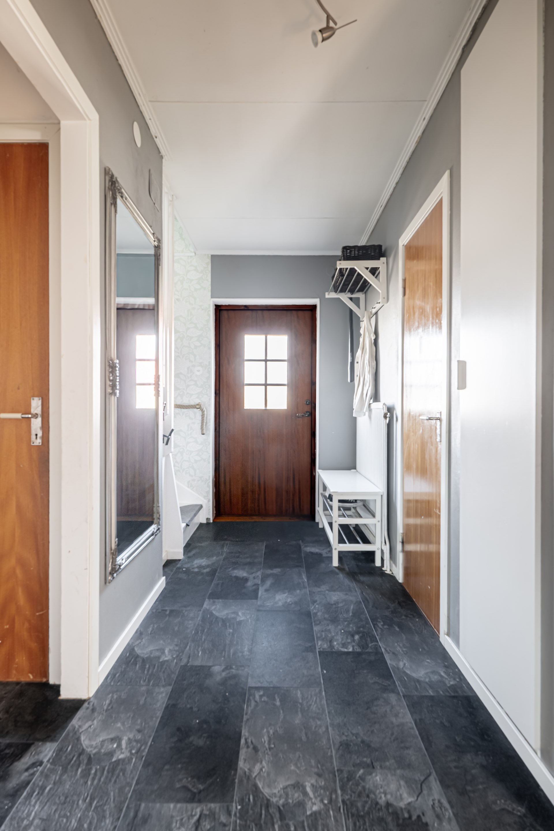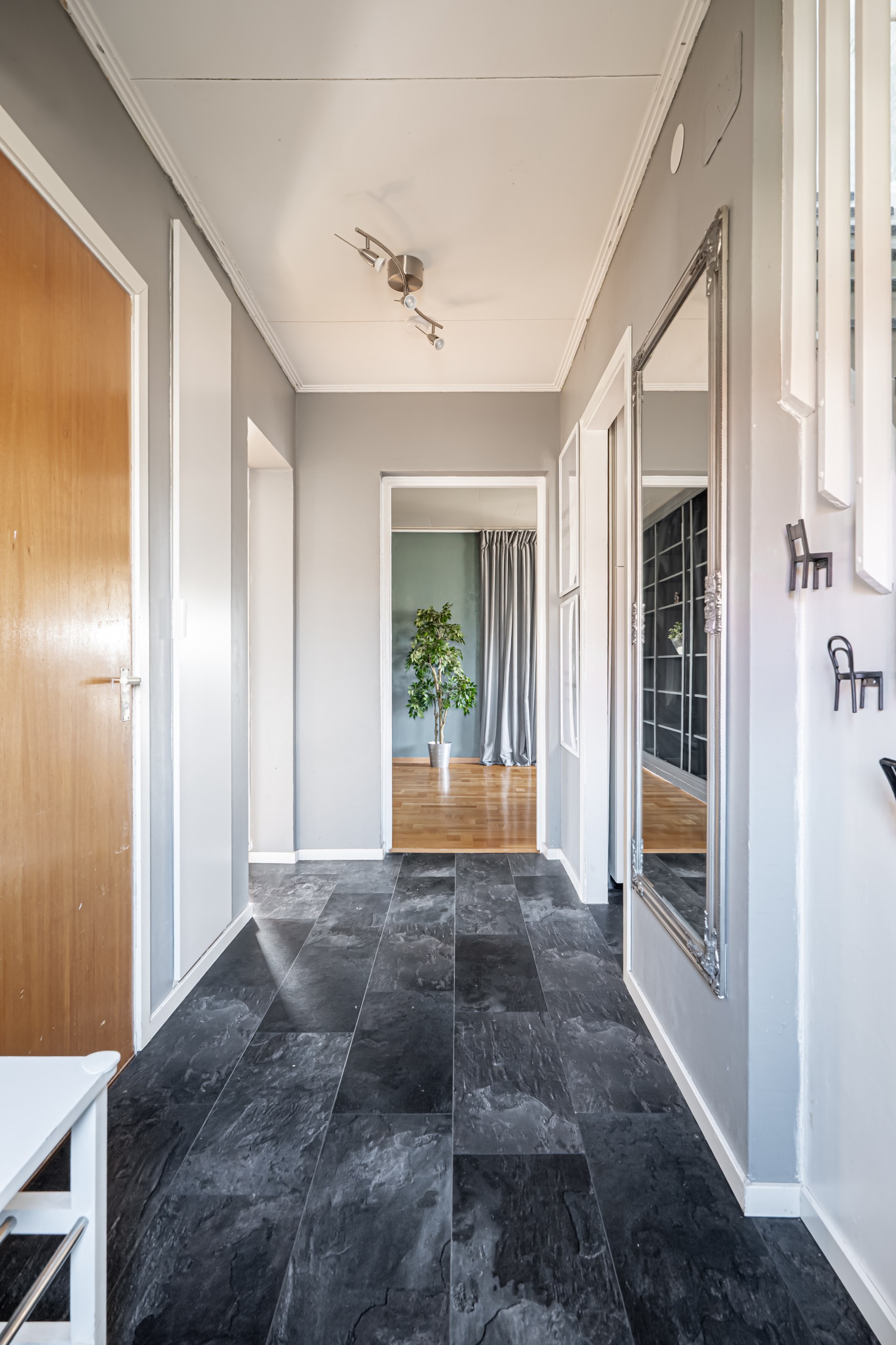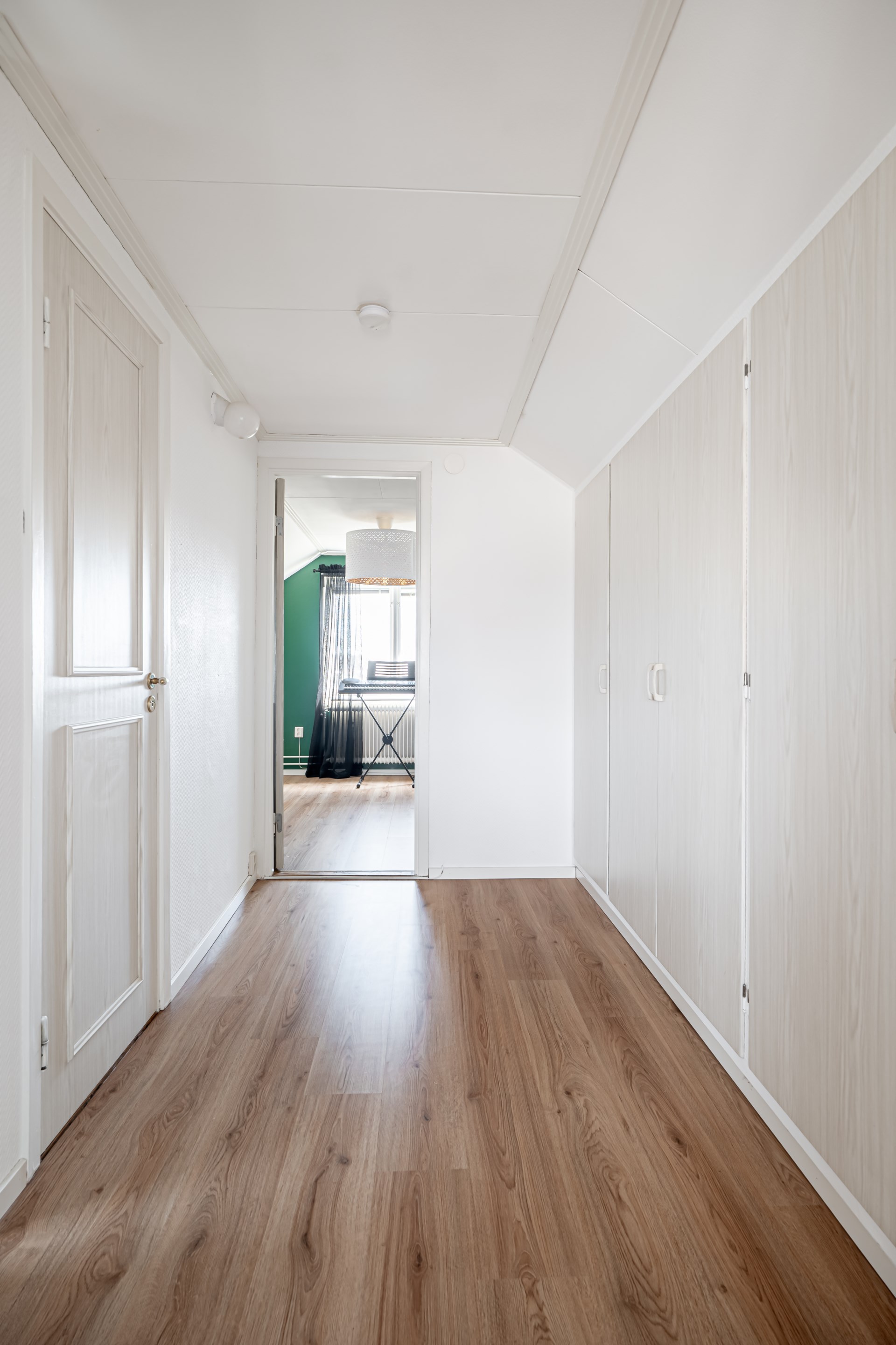 - Allmän beskrivning: Välkomnande hall med plats för avhängning och förvaring i garderober. Härifrån nås bostadens samtliga rum på planet samt trappan upp till övre plan.
