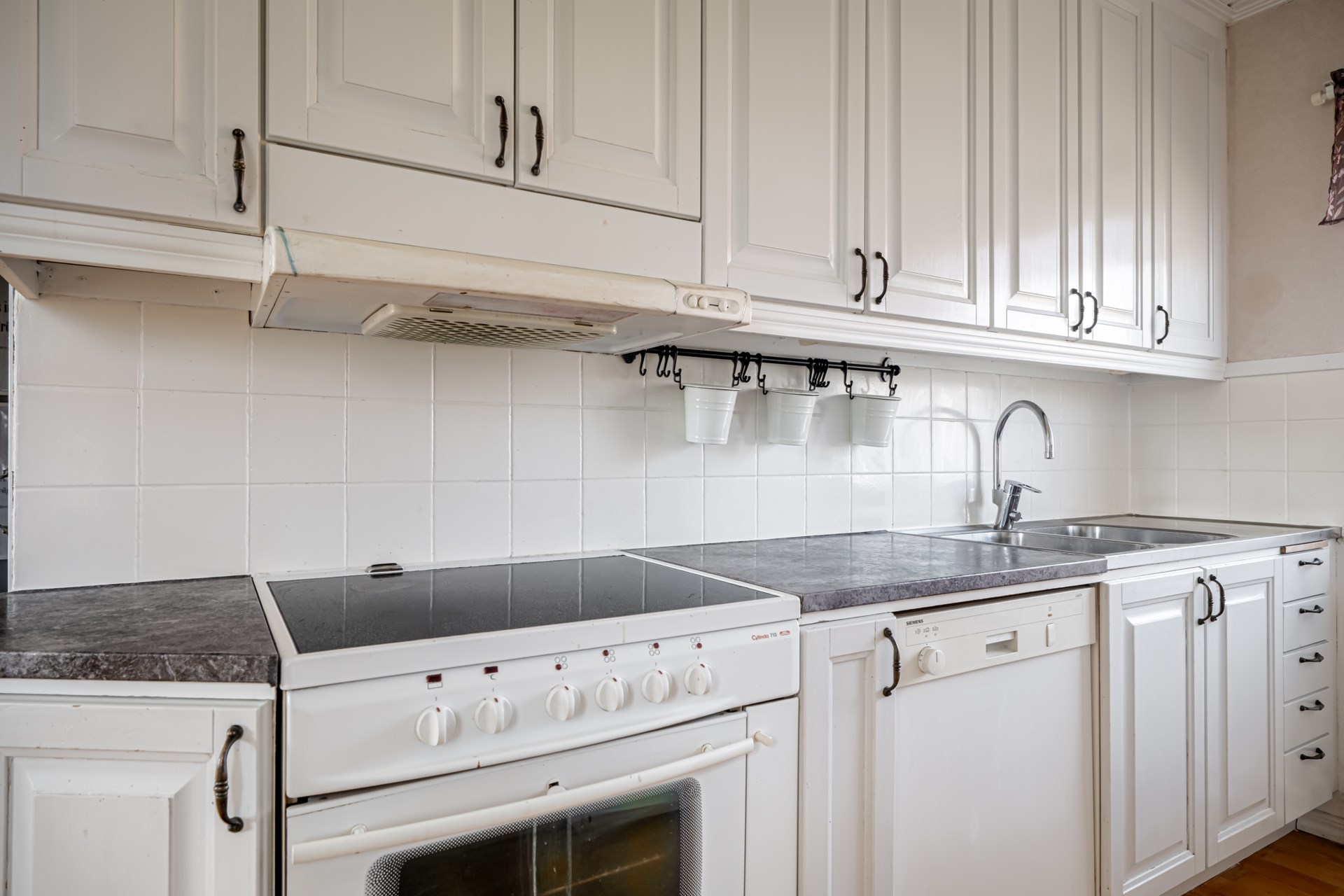 - Kök: Kök med skåpsinrede i vitt och gott om skåp och lådor för förvaring av köksredskap och porslin. Köket är utrustat med spis, ugn, fläkt, diskmaskin samt kyl/frys. I köket finns det plats för matbord.