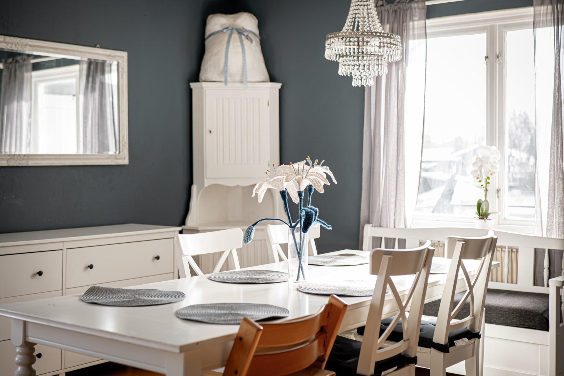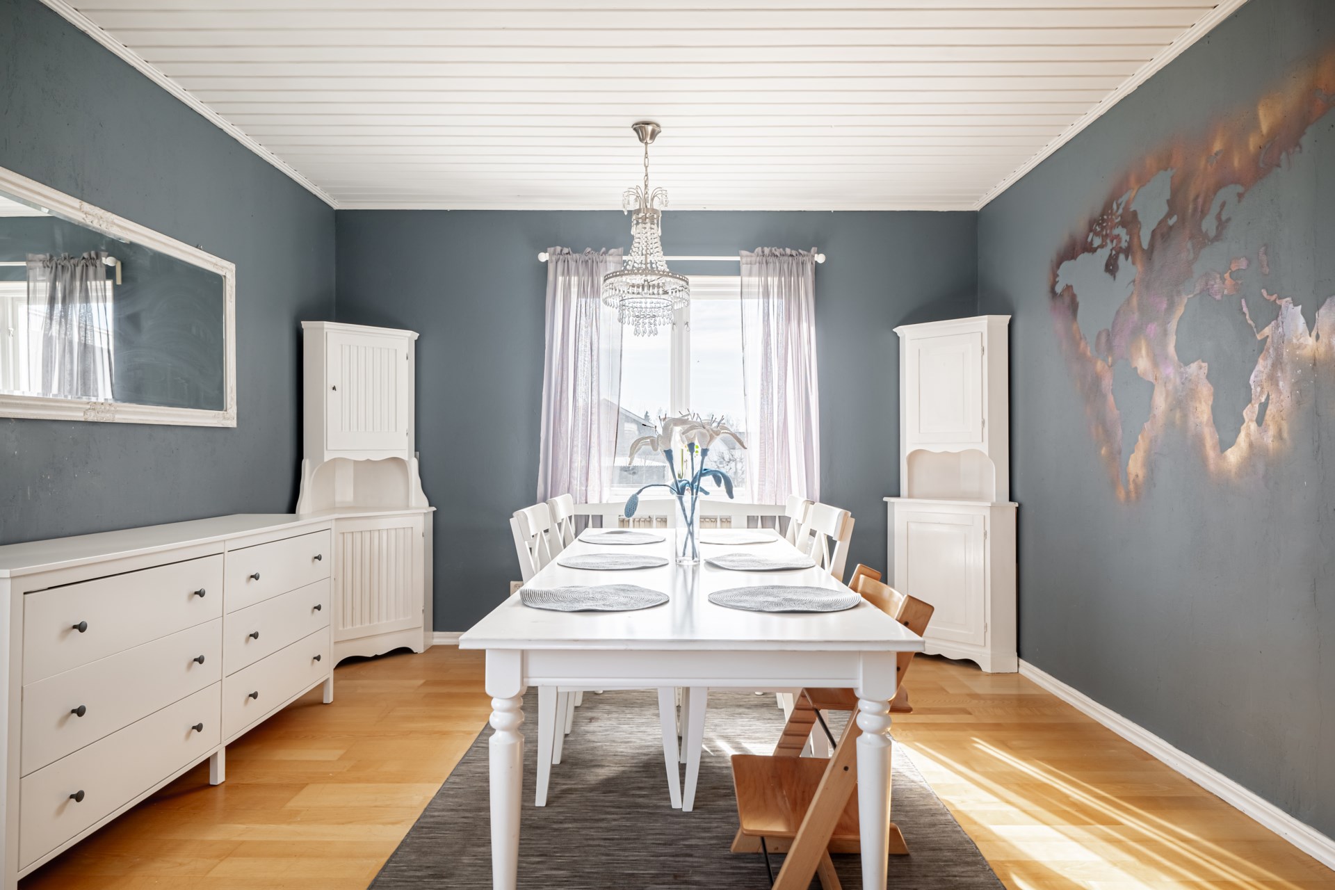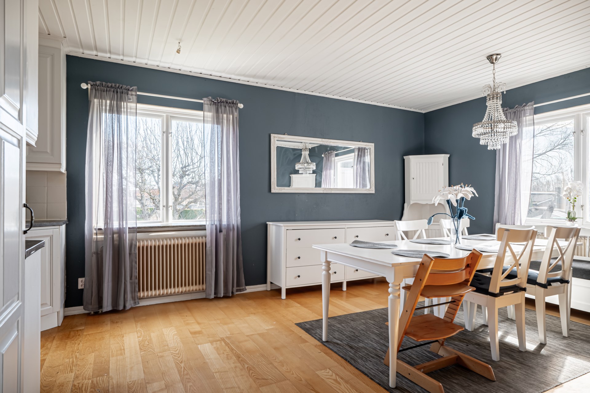Till vänster ligger köket – funktionellt planerat med bra arbetsytor och förvaring. Intill köket finns en naturlig matplats med fint ljusinsläpp, perfekt för både vardagsmåltider och sociala tillställningar.
