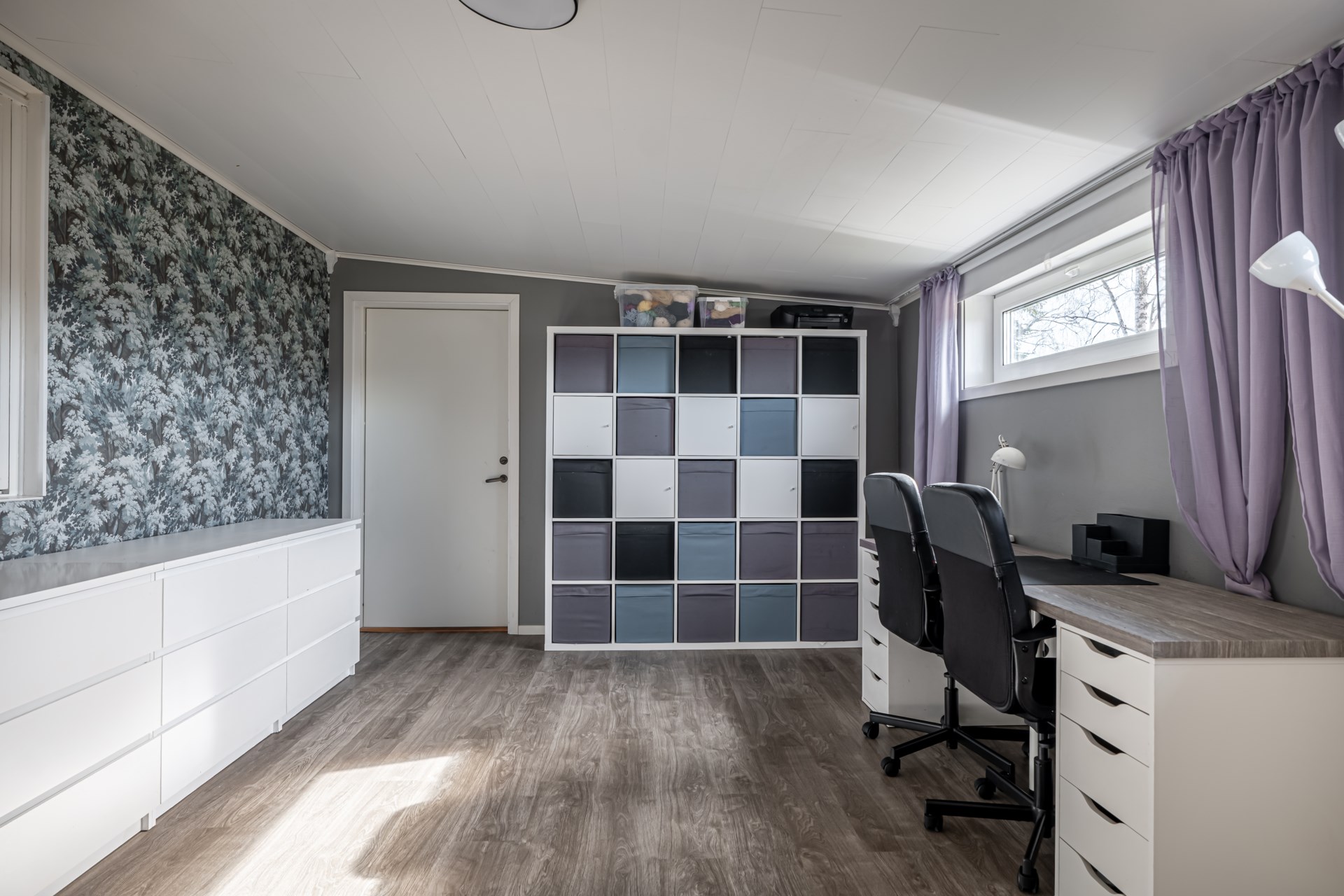 Vidare finns ett inrett rum som kan användas efter behov – exempelvis som hobbyrum, kontor eller gästrum. Från detta plan nås även garaget, vilket ger en smidig och bekväm vardag. - Badrum: Helkaklat badrum med klinker på golvet. I badrummet har ni toalett, kommod, spegelskåp samt dusch.