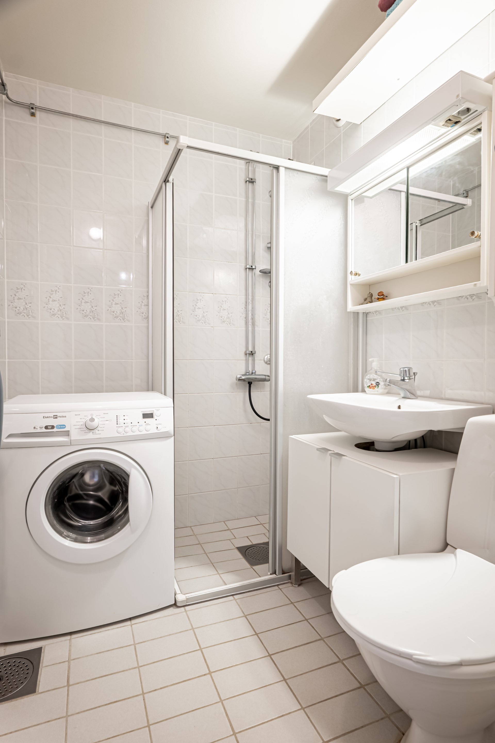 - Badrum: Helkaklat badrum med klinker på golvet. I badrummet har ni toalett, handfat, spegelskåp och dusch. Här finns även tvättmöjligheter i form av en tvättmaskin.