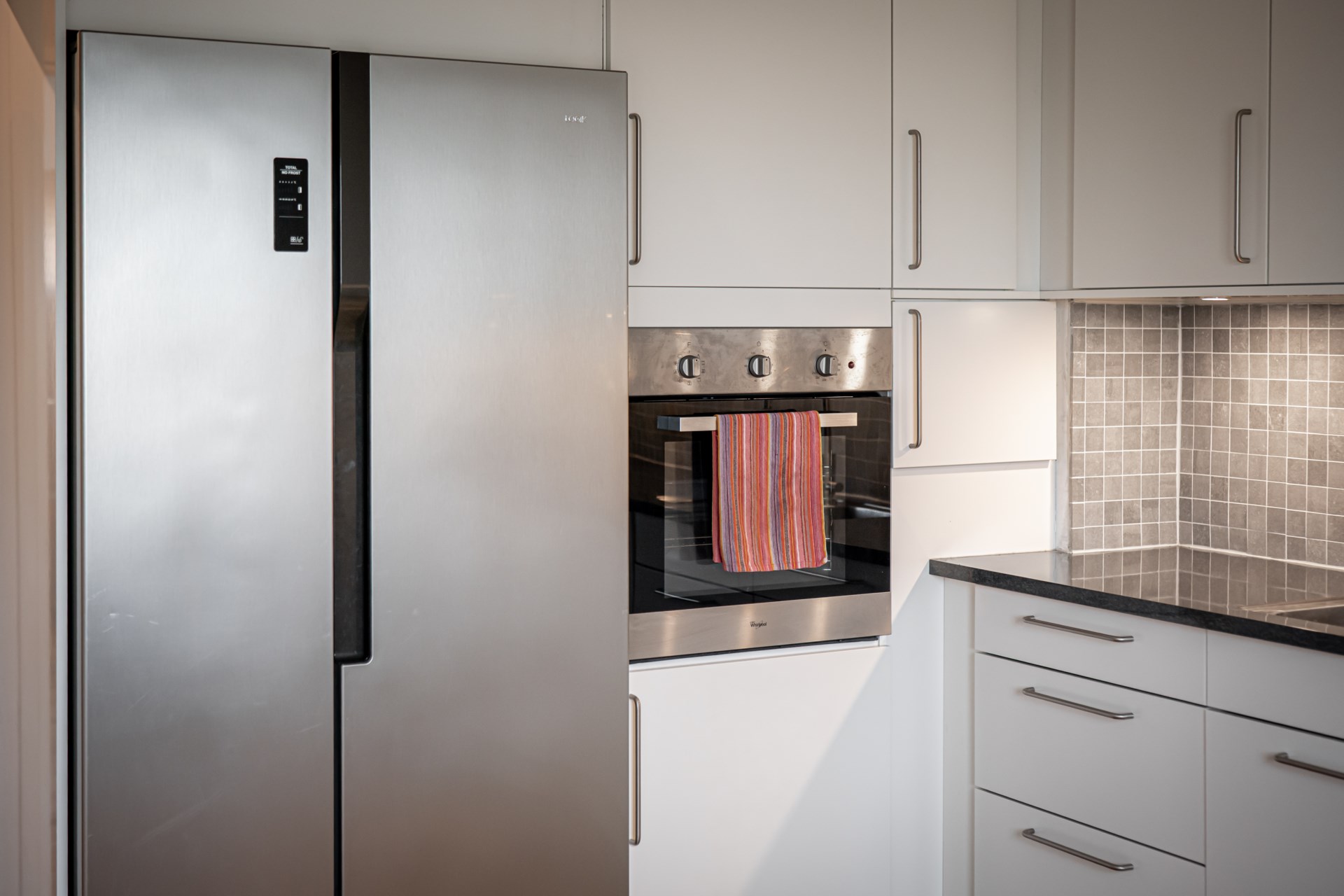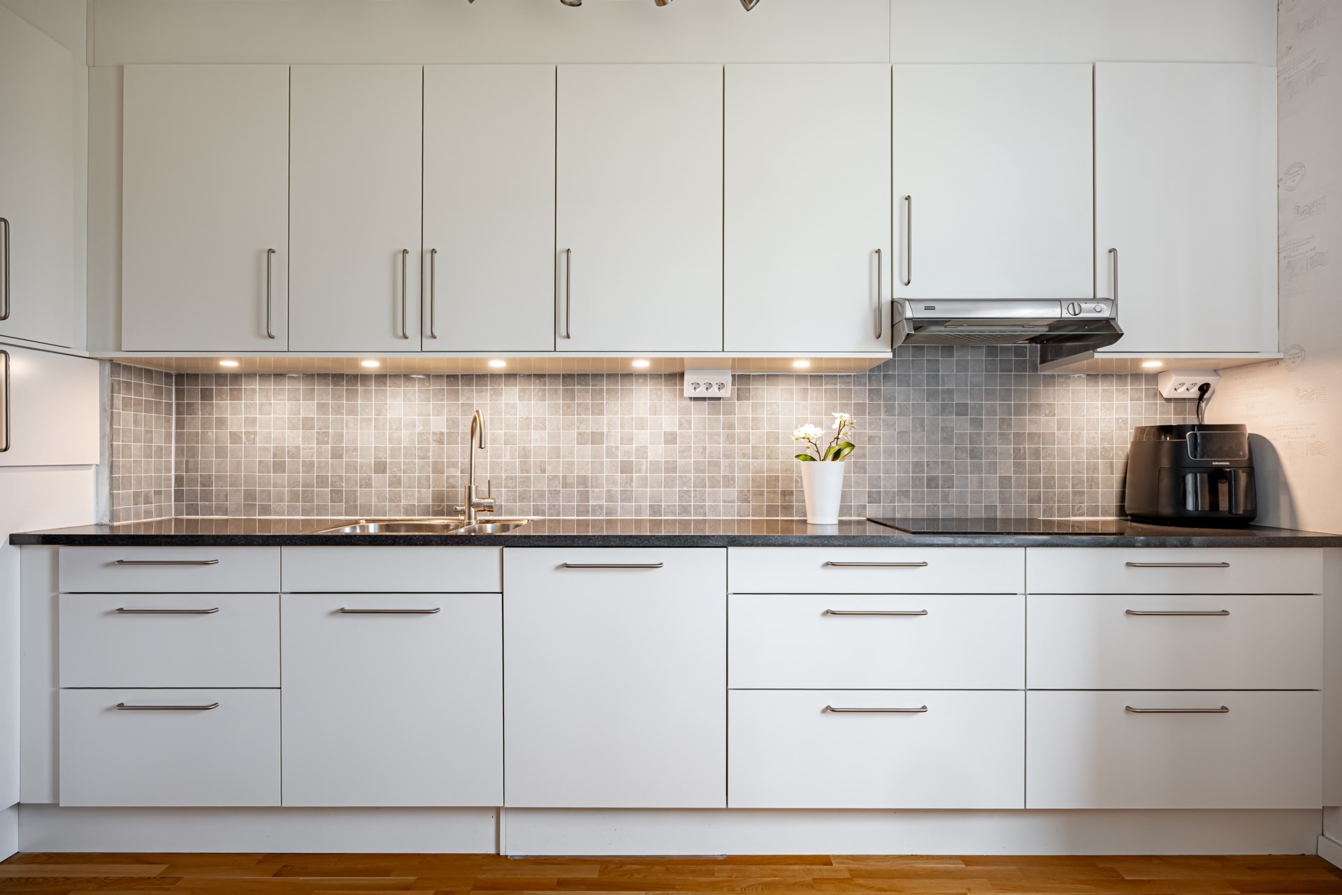 Rakt fram från hallen nås badrummet, och till höger ligger det ljusa och trivsamma köket. Mittemot köket öppnar det rymliga vardagsrummet upp sig, en härlig samlingspunkt med plats för både soffgrupp och matbord. Härifrån når ni även balkongen, där ni kan njuta av kvällssolen i ett lugnt läge. - Kök: Ljust och inbjudande kök med plats för både matlagning och en fin matplats. Köket är utrustat med spishäll, fläkt, integrerad diskmaskin, inbyggd ugn samt kyl/frys.
