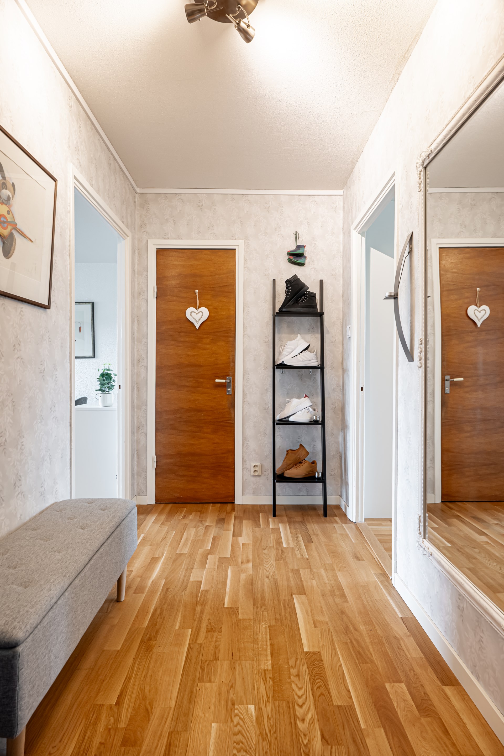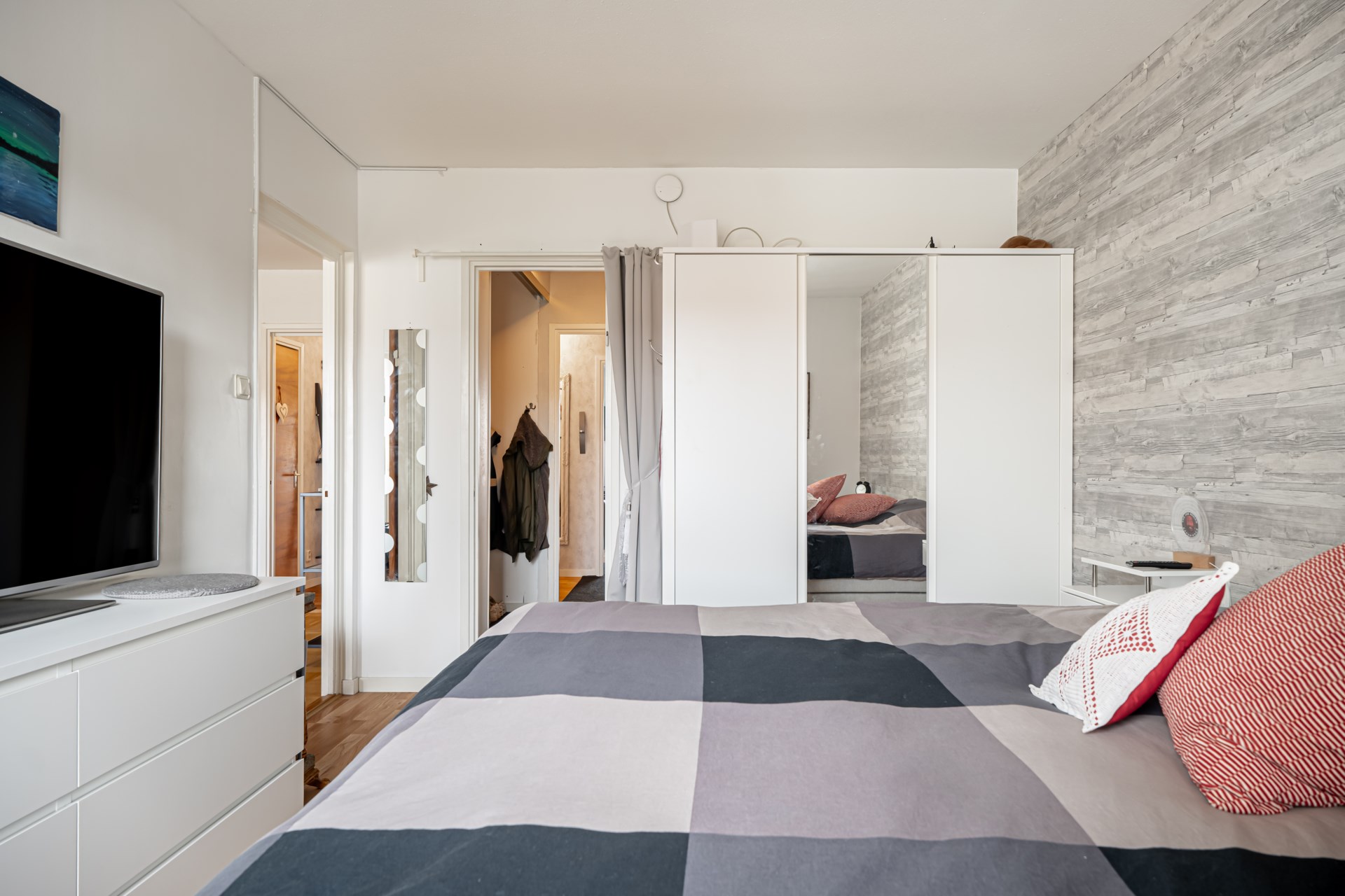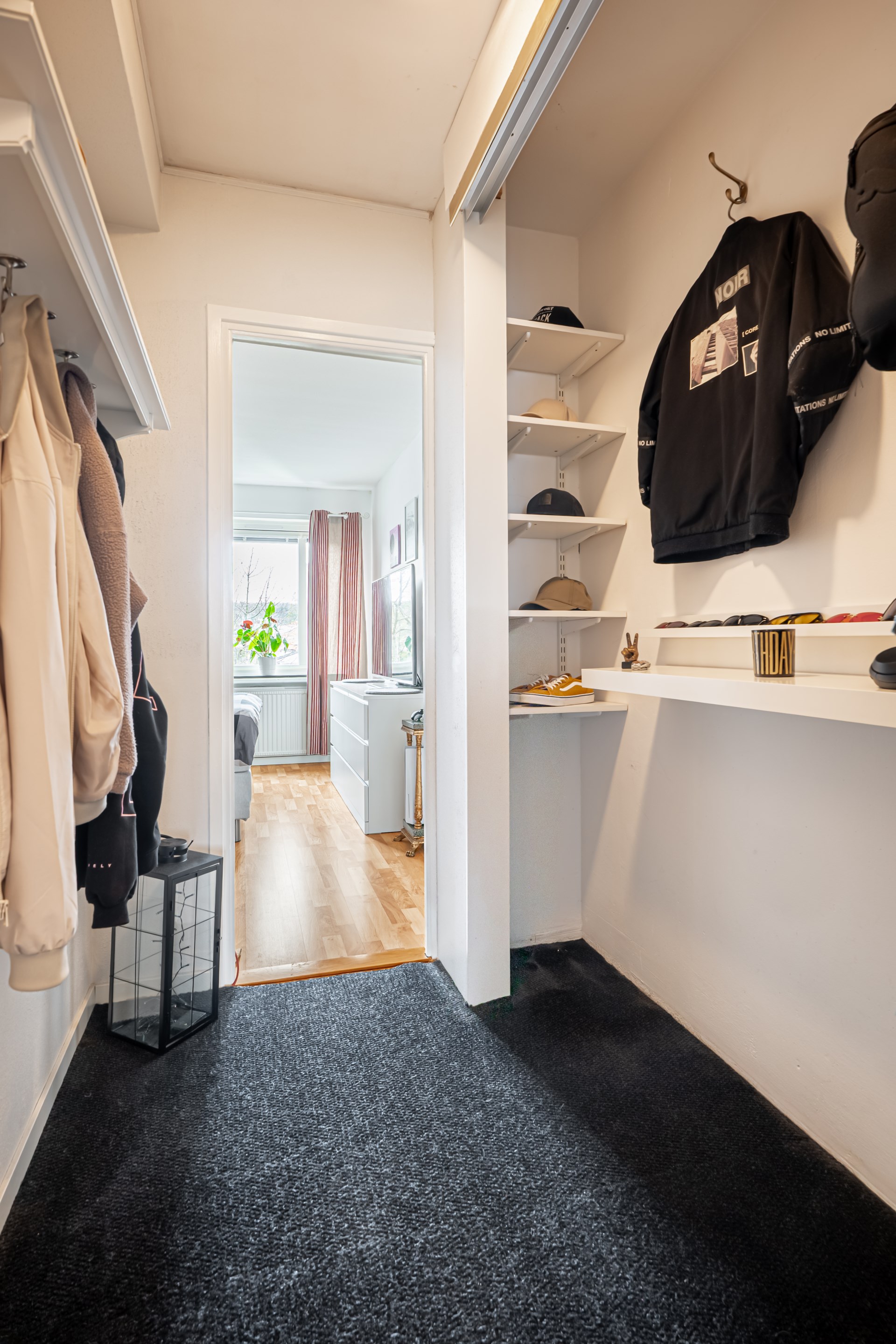 Bostaden har en smart disposition där sovrummen är placerade på varsin sida av hallen, båda i bra storlek. Det ena sovrummet erbjuder dessutom en praktisk skjutdörrsgarderob som ger generös förvaring.
