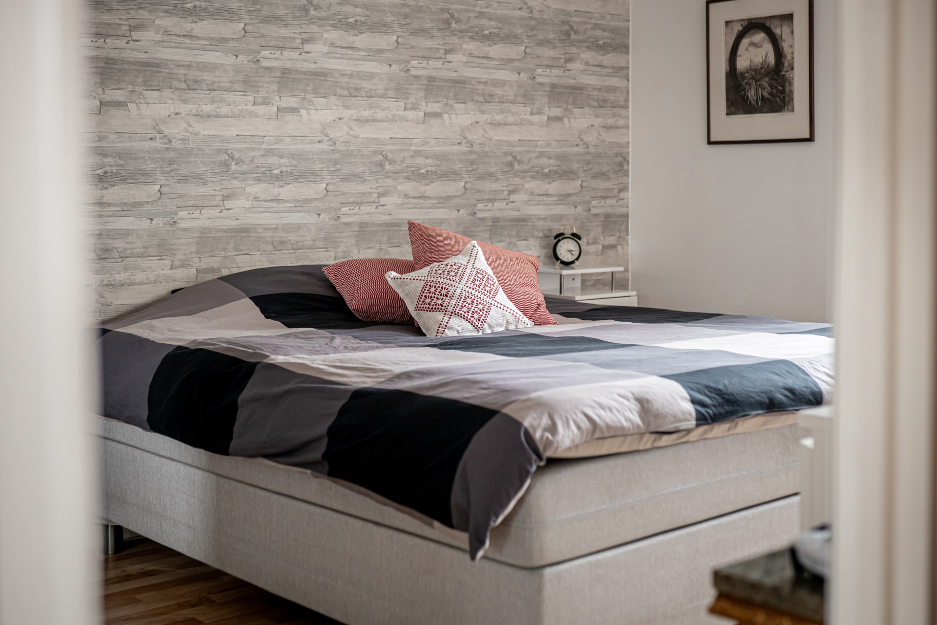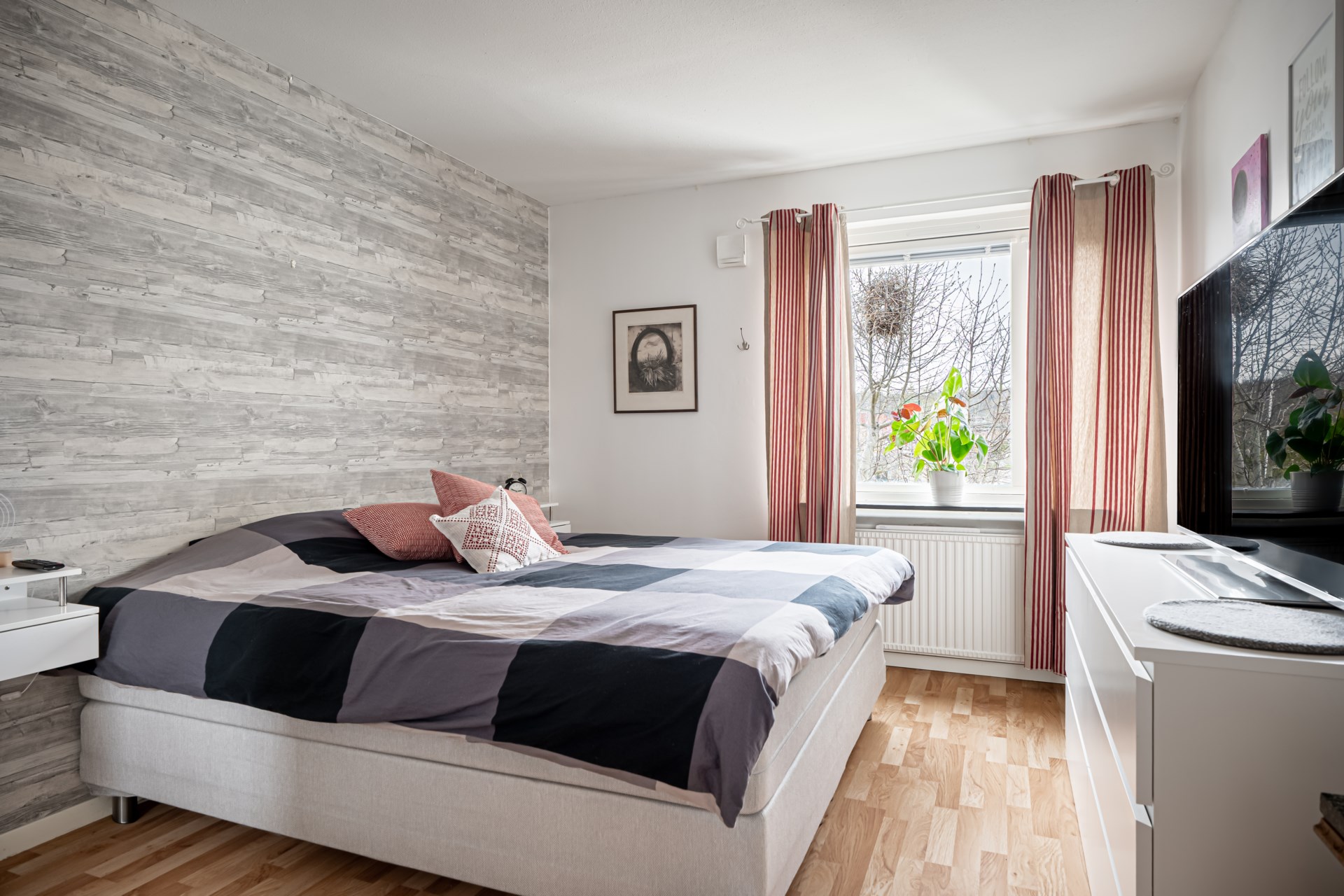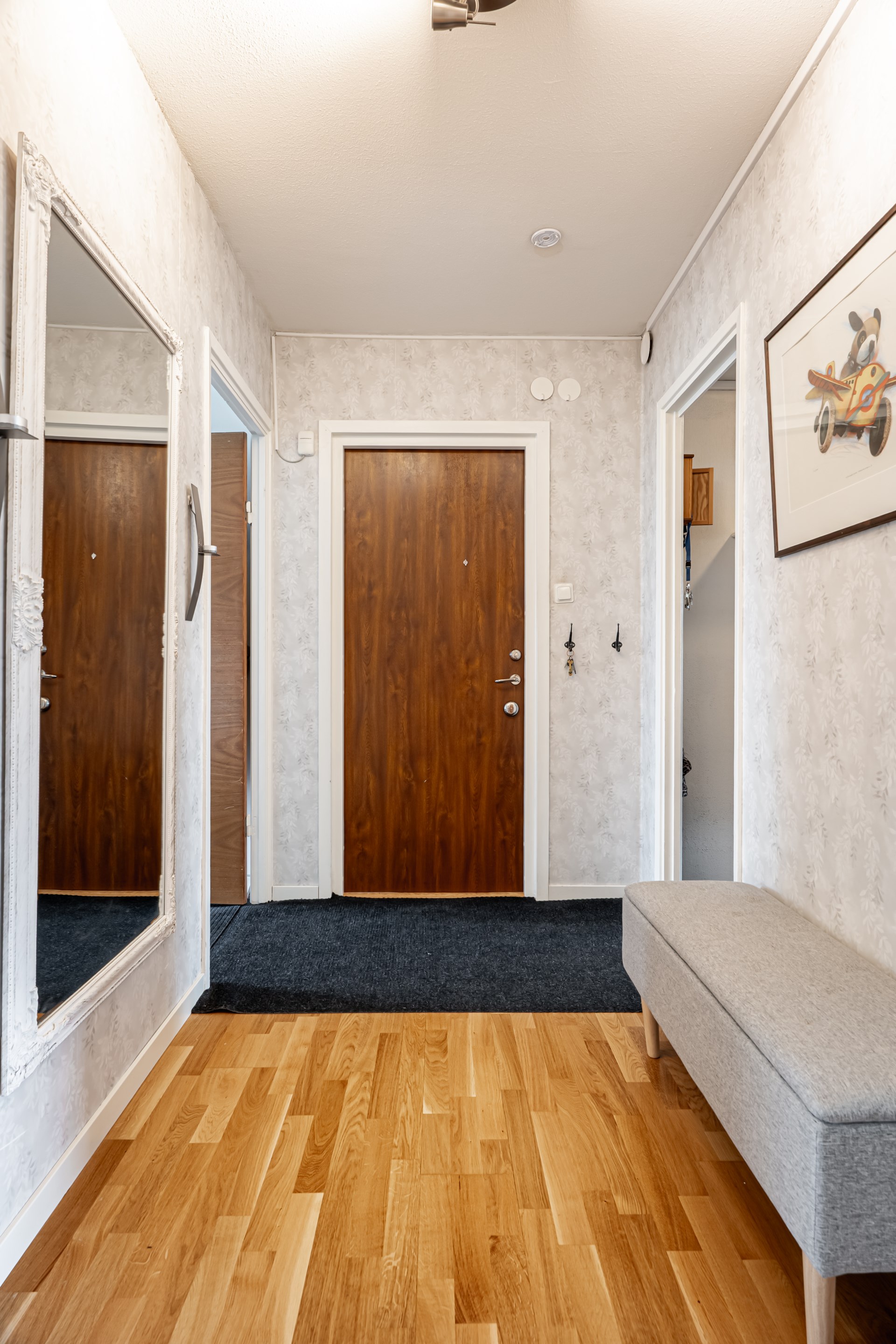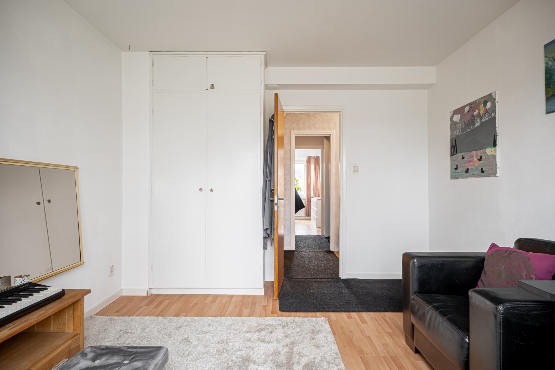 Bostaden har en smart disposition där sovrummen är placerade på varsin sida av hallen, båda i bra storlek. Det ena sovrummet erbjuder dessutom en praktisk skjutdörrsgarderob som ger generös förvaring.