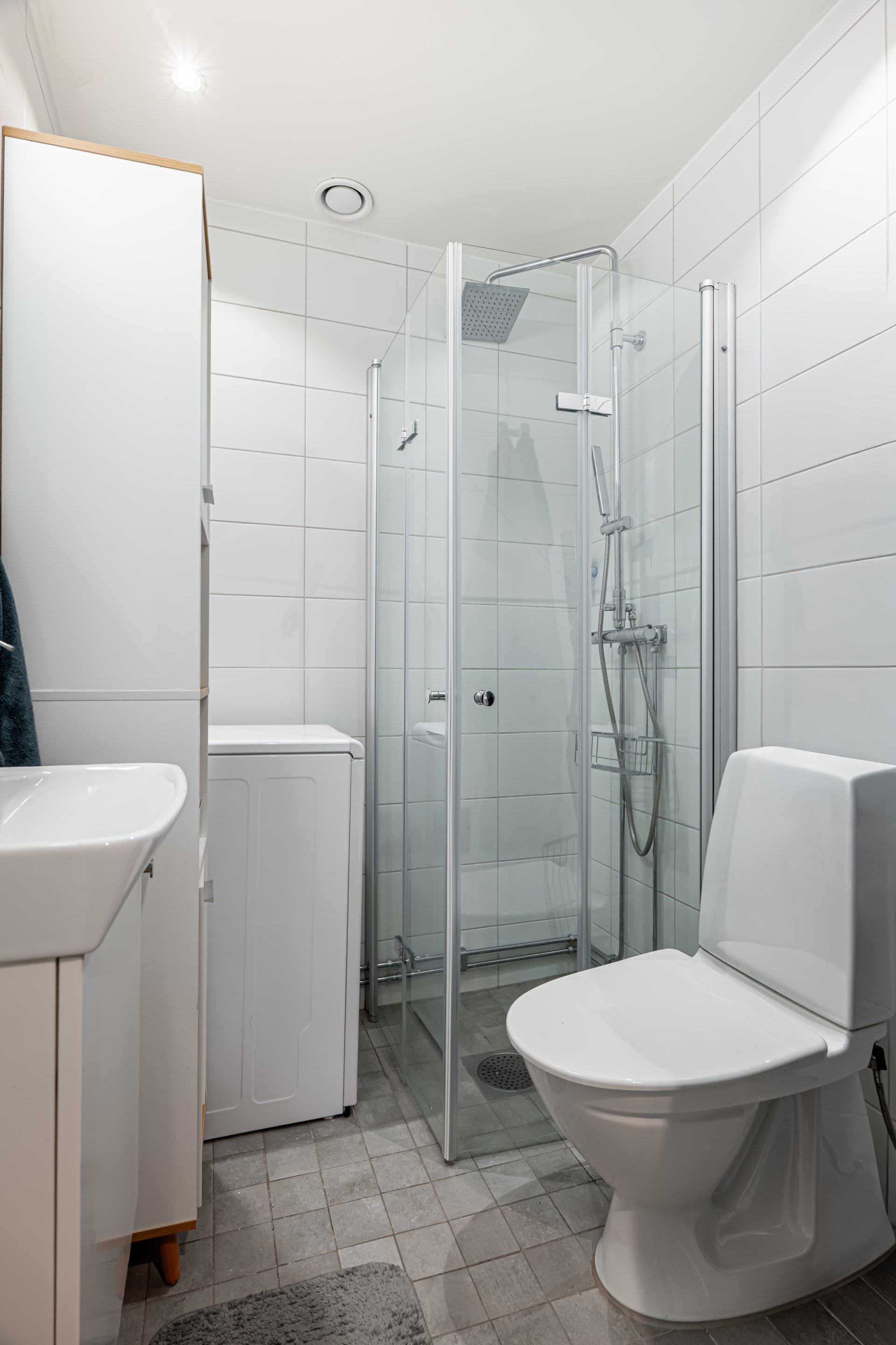 Från vardagsrummet kliver du ut på balkongen i soligt söderläge, en härlig förlängning av bostaden där du kan njuta av solen och sitta ute långt in på sommarkvällarna - Badrum: 2018 renoverades badrummet med kaklade väggar och klinker på golvet. Under klinkergolvet ligger värmande golvvärme. I badrummet har du wc, kommod, badrumsskåp, handdukstork, tvättmaskin samt dusch med duschväggar.