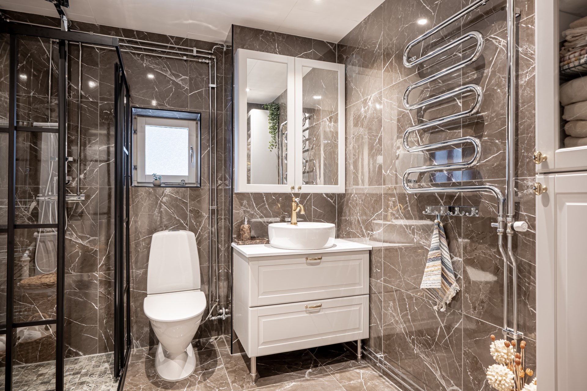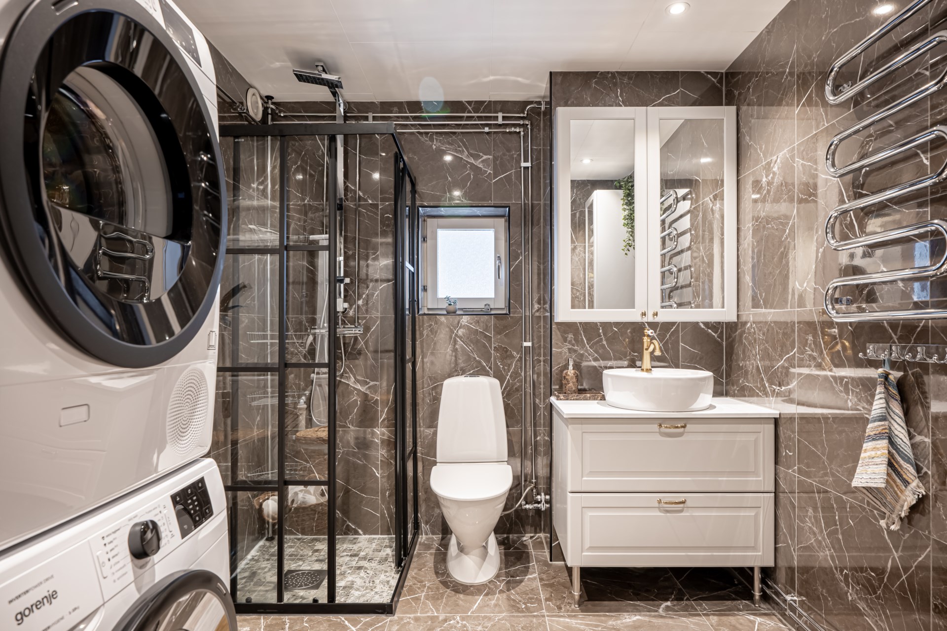 - Badrum: Lyxigt renoverat badrum med stora kakelplattor på väggarna och matchande klinkergolv. I badrummet har ni toalett, kommod, spegelskåp, dusch, tvättmaskin och torktumlare.