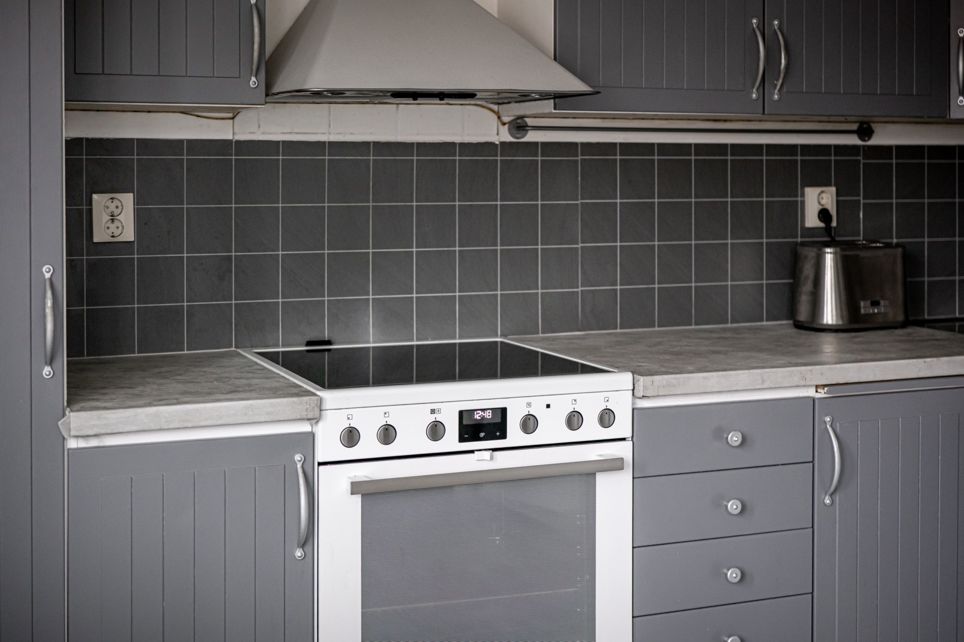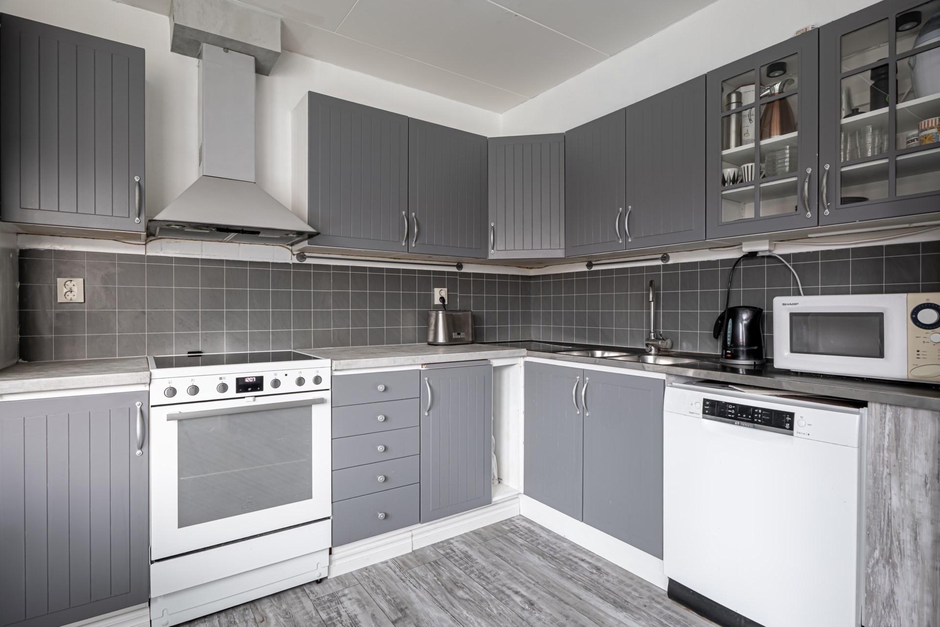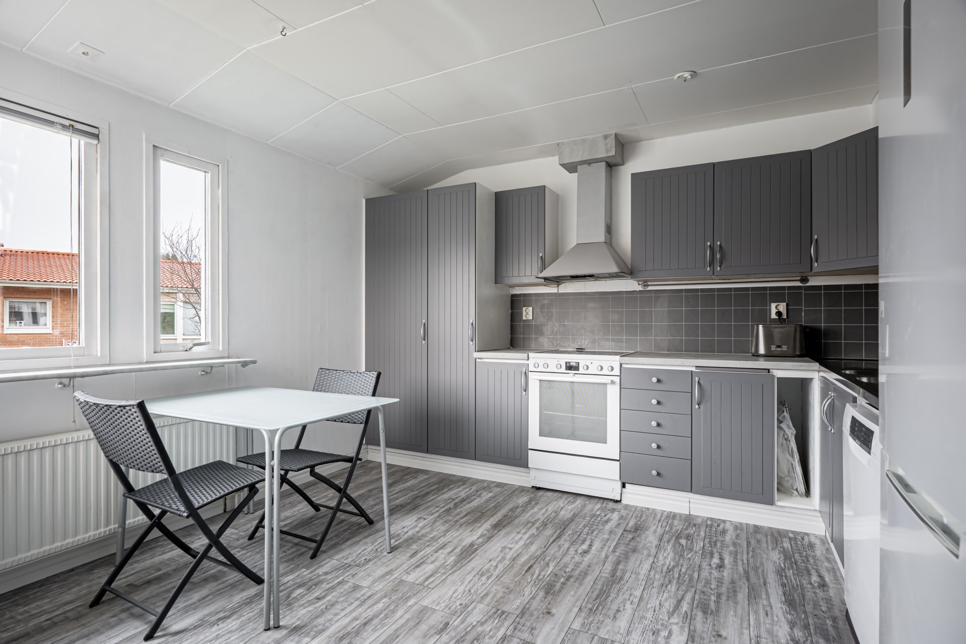 • Kök: Kök med köksinrede i grått. Köket är utrustat med spis, fläkt, diskmaskin samt kyl/frys. I köket finns det plats för ett matbord med fyra stolar.