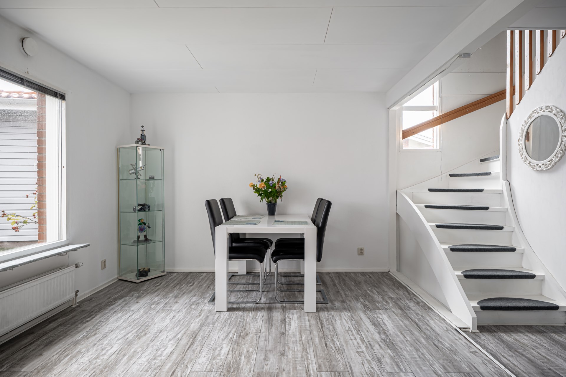 Köket ligger smart placerat i husets ena hörn och erbjuder bra arbetsytor samt gott om skåpförvaring. Intill köket ligger tvättstugan, praktiskt nära men ändå avskilt. Mitt i huset finns trappan som leder upp till övre plan, strategiskt placerad för att inte störa de sociala ytorna. På övre plan finner ni fyra sovrum, alla i bra storlek. Här finns också ett badrum.