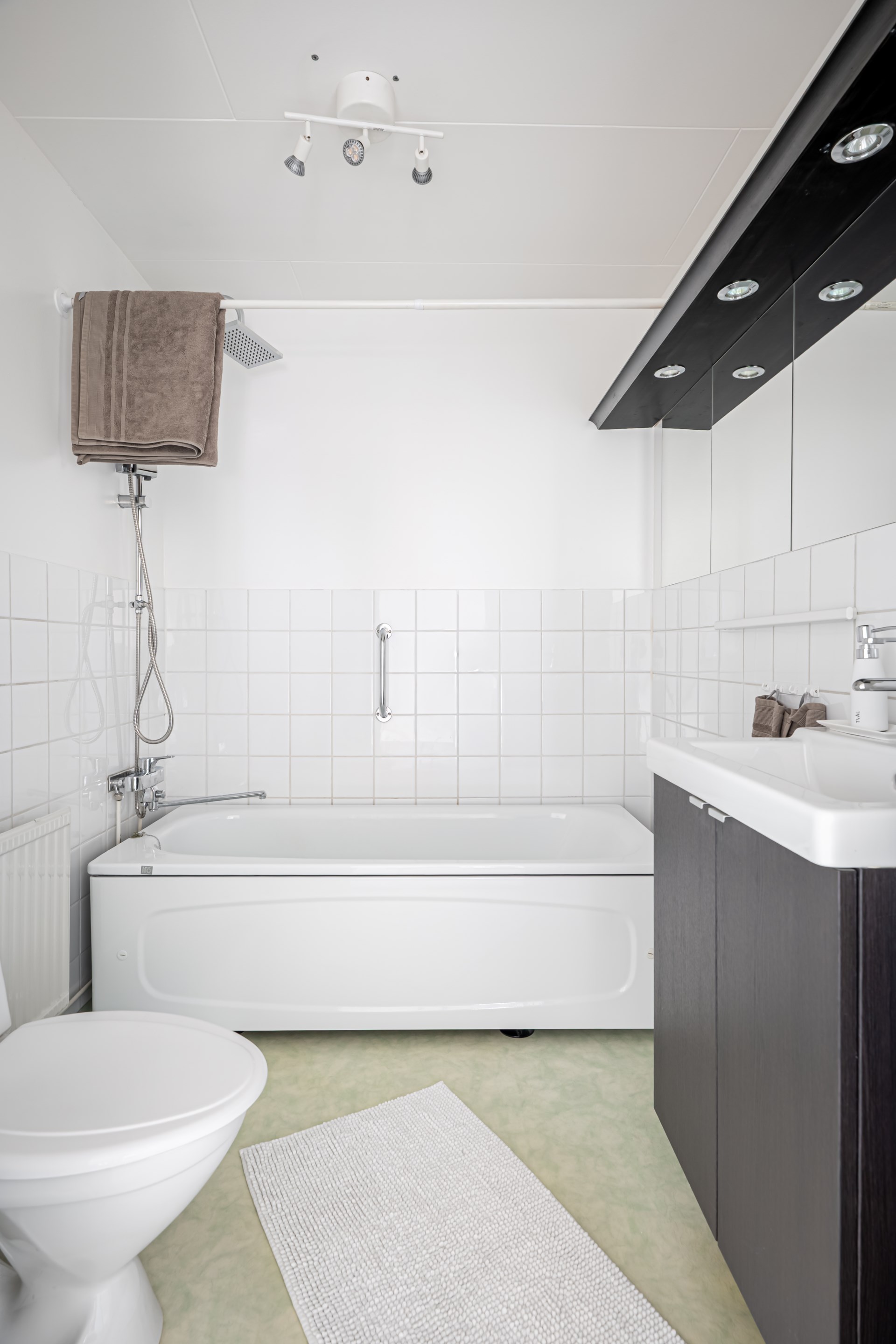 - Badrum: Badrummet på övre plan har våtrumsmatta på golvet och halvkaklade väggar. Här finns en toalett, kommod, spegelskåp och badkar.