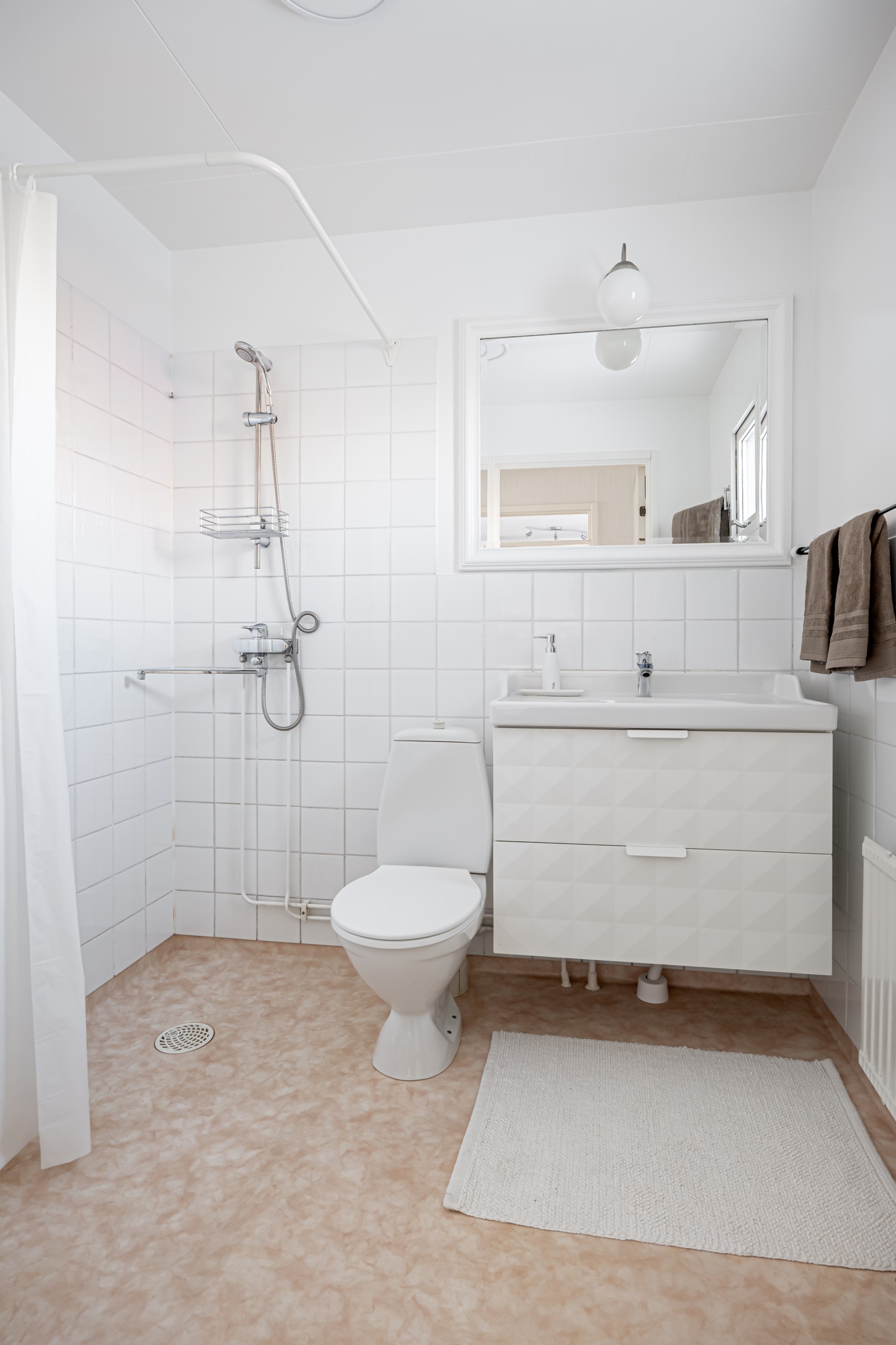 - Badrum: Badrummet på entréplan har våtrumsmatta på golvet och halvkaklade väggar. Här har ni toalett, kommod och dusch.