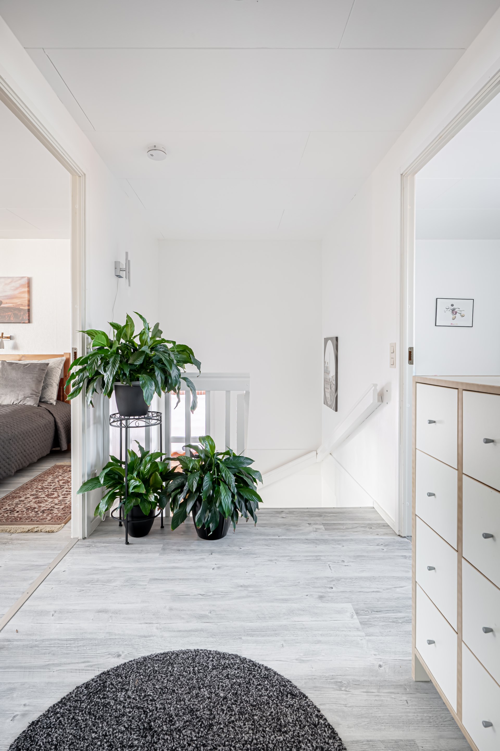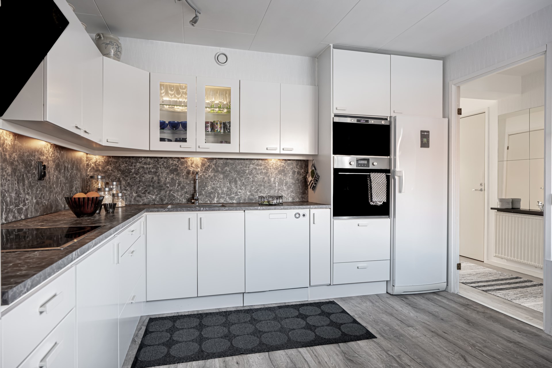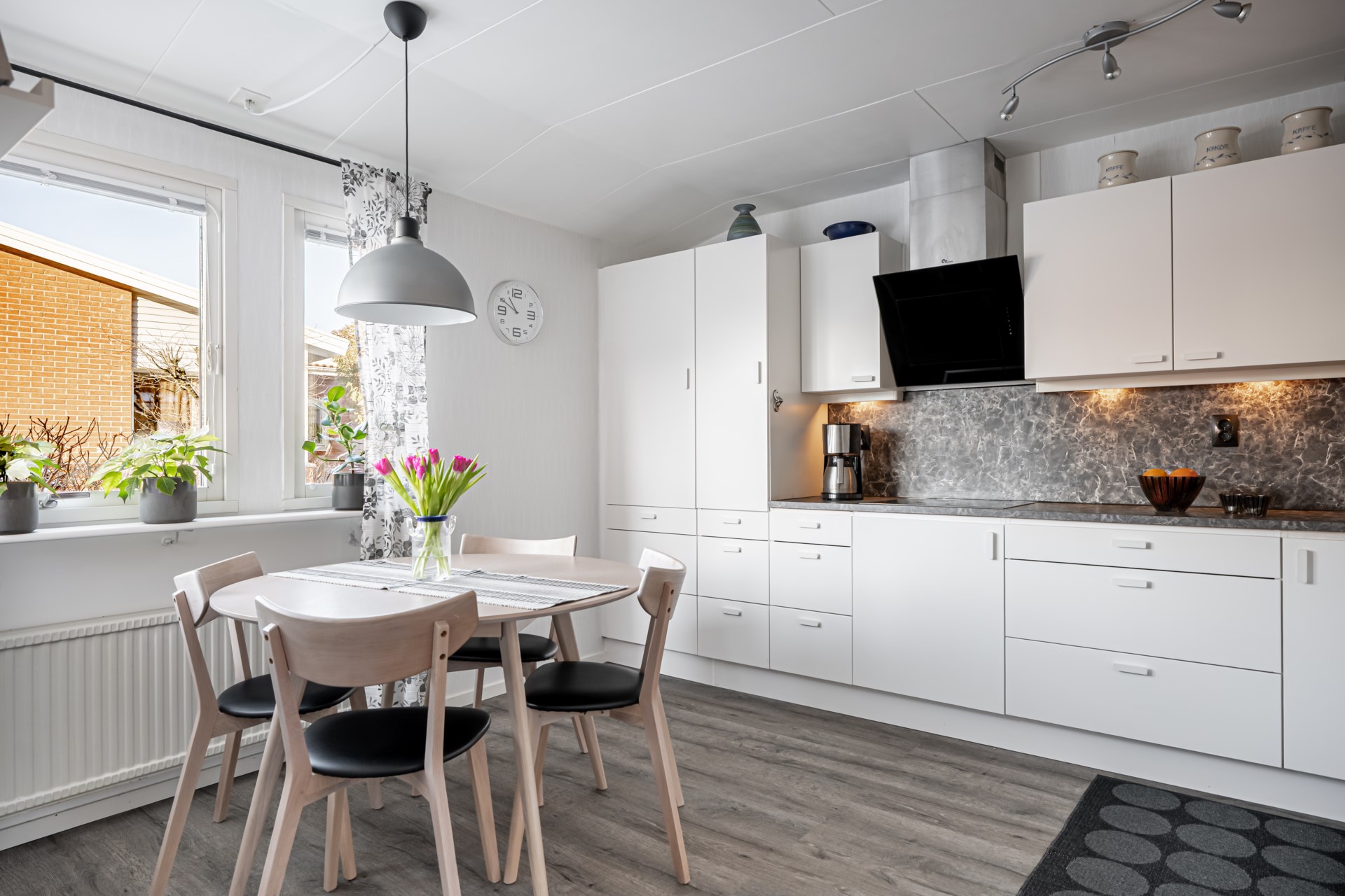 En trappa upp finner ni familjens privata del där fyra sovrum är samlade på ett trivsamt och praktiskt sätt. Här finns även ett badrum, vilket skapar en smidig vardag för hela familjen. - Kök: Ljust och rymligt Vedumkök med vita, släta luckor. Här finns gott om bänkyta och bra med skåp och lådor för förvaring av porslin och köksredskap. Köket är utrustat med spishäll, fläkt, diskmaskin, inbyggd ugn och micro samt en kyl i fullhöjd. I köket har ni plats för ett matbord med fyra stolar.