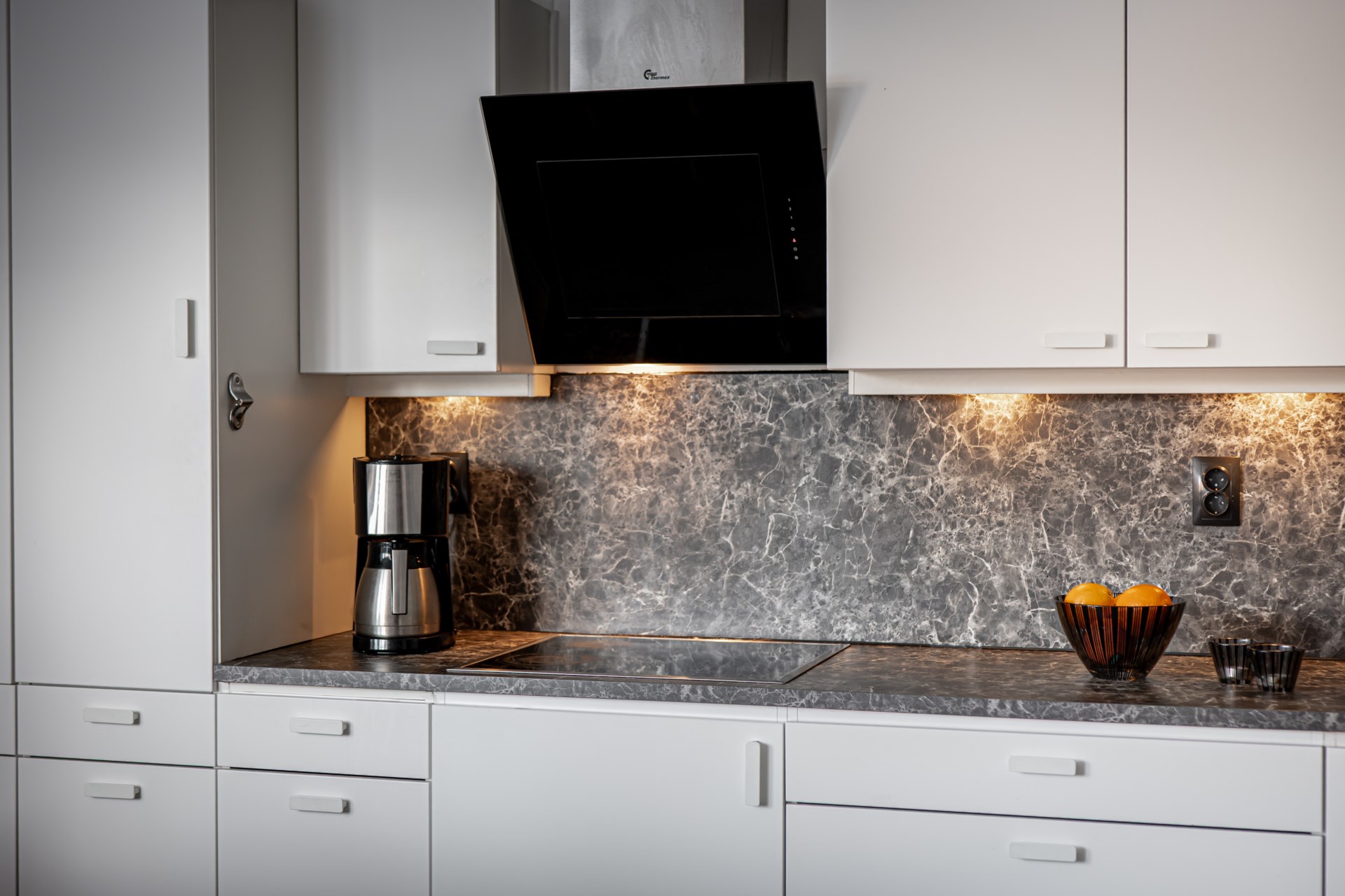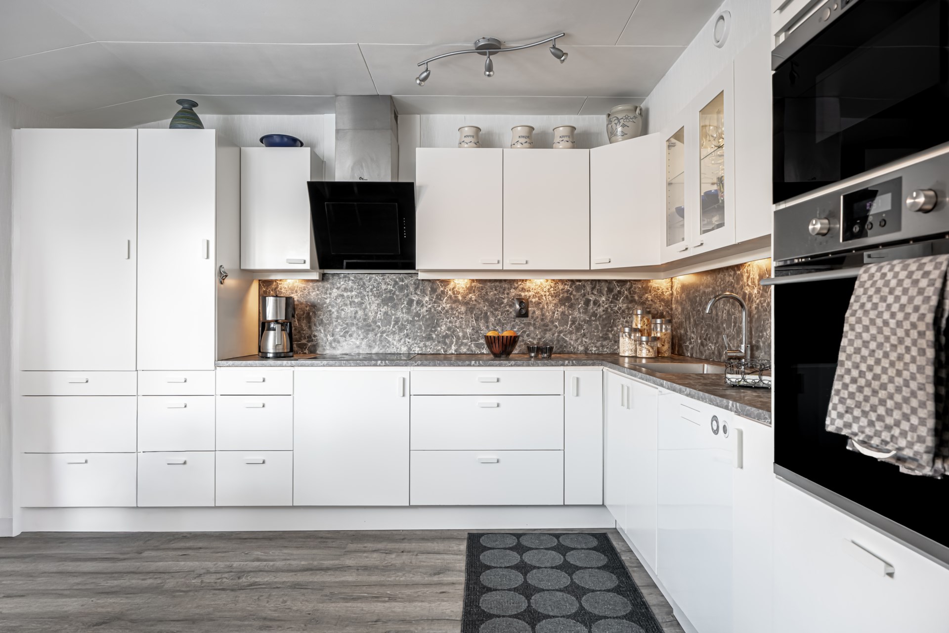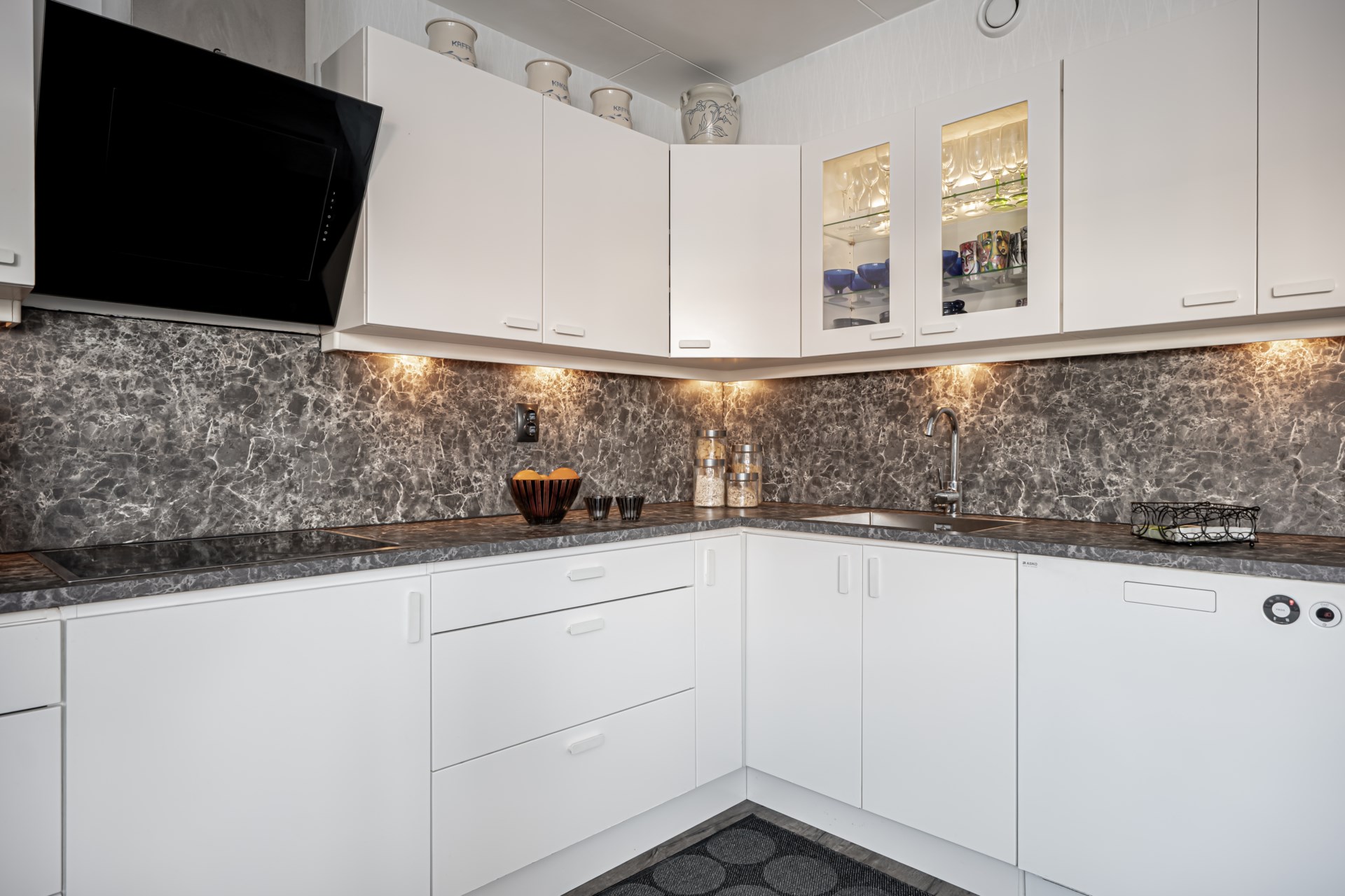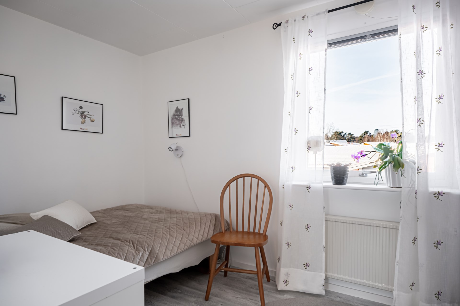 En trappa upp finner ni familjens privata del där fyra sovrum är samlade på ett trivsamt och praktiskt sätt. Här finns även ett badrum, vilket skapar en smidig vardag för hela familjen. - Kök: Ljust och rymligt Vedumkök med vita, släta luckor. Här finns gott om bänkyta och bra med skåp och lådor för förvaring av porslin och köksredskap. Köket är utrustat med spishäll, fläkt, diskmaskin, inbyggd ugn och micro samt en kyl i fullhöjd. I köket har ni plats för ett matbord med fyra stolar.