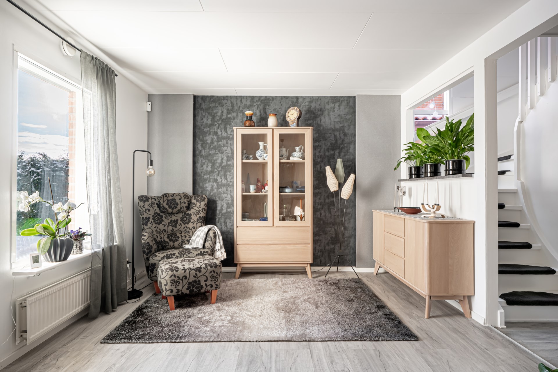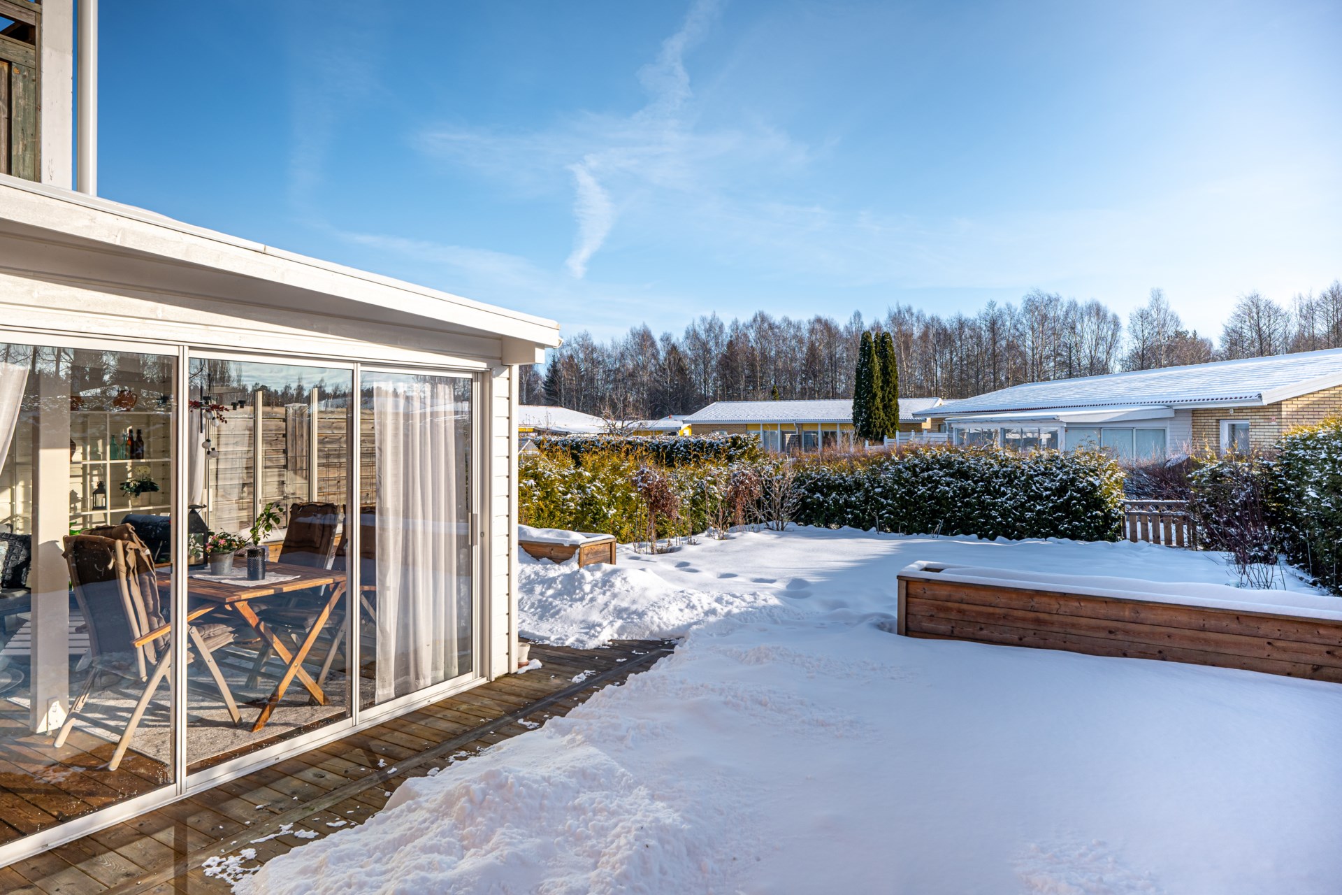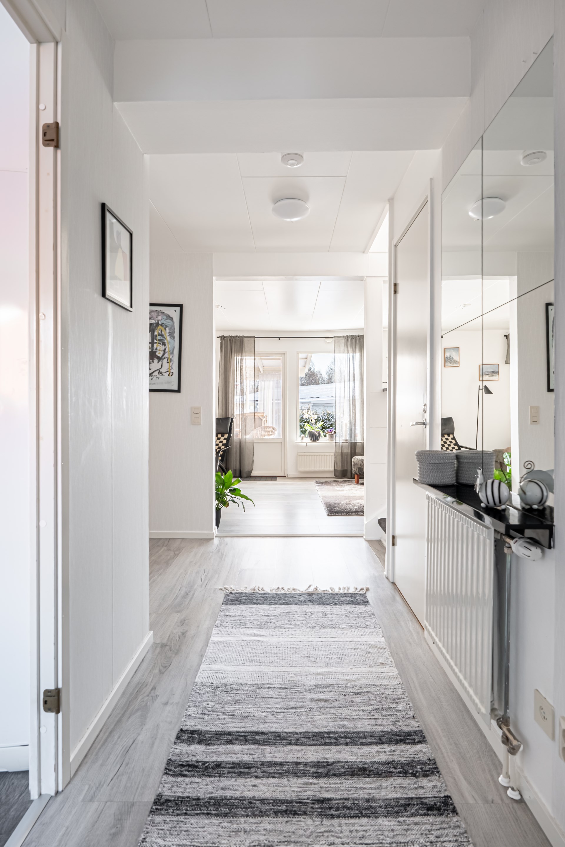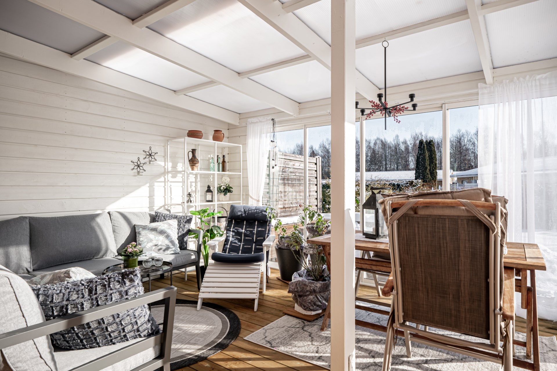 Vidare öppnar bostaden upp sig mot det ljusa och luftiga vardagsrummet där stora fönsterpartier låter dagsljuset flöda fritt. Härifrån kliver du rakt ut till bostadens magiska inglasade uterum, en uppskattad förlängning av hemmet som suddar ut gränsen mellan ute och inne och bjuder på rogivande utsikt över husets baksida.