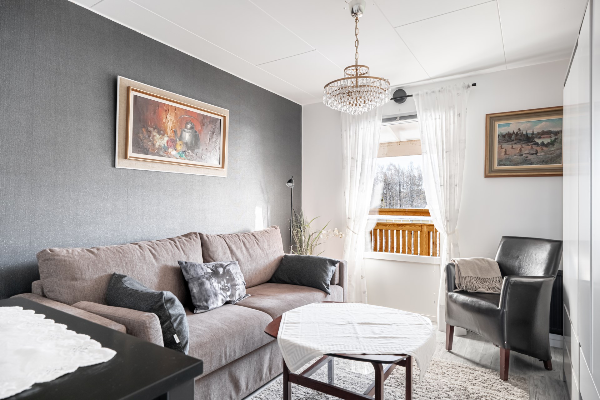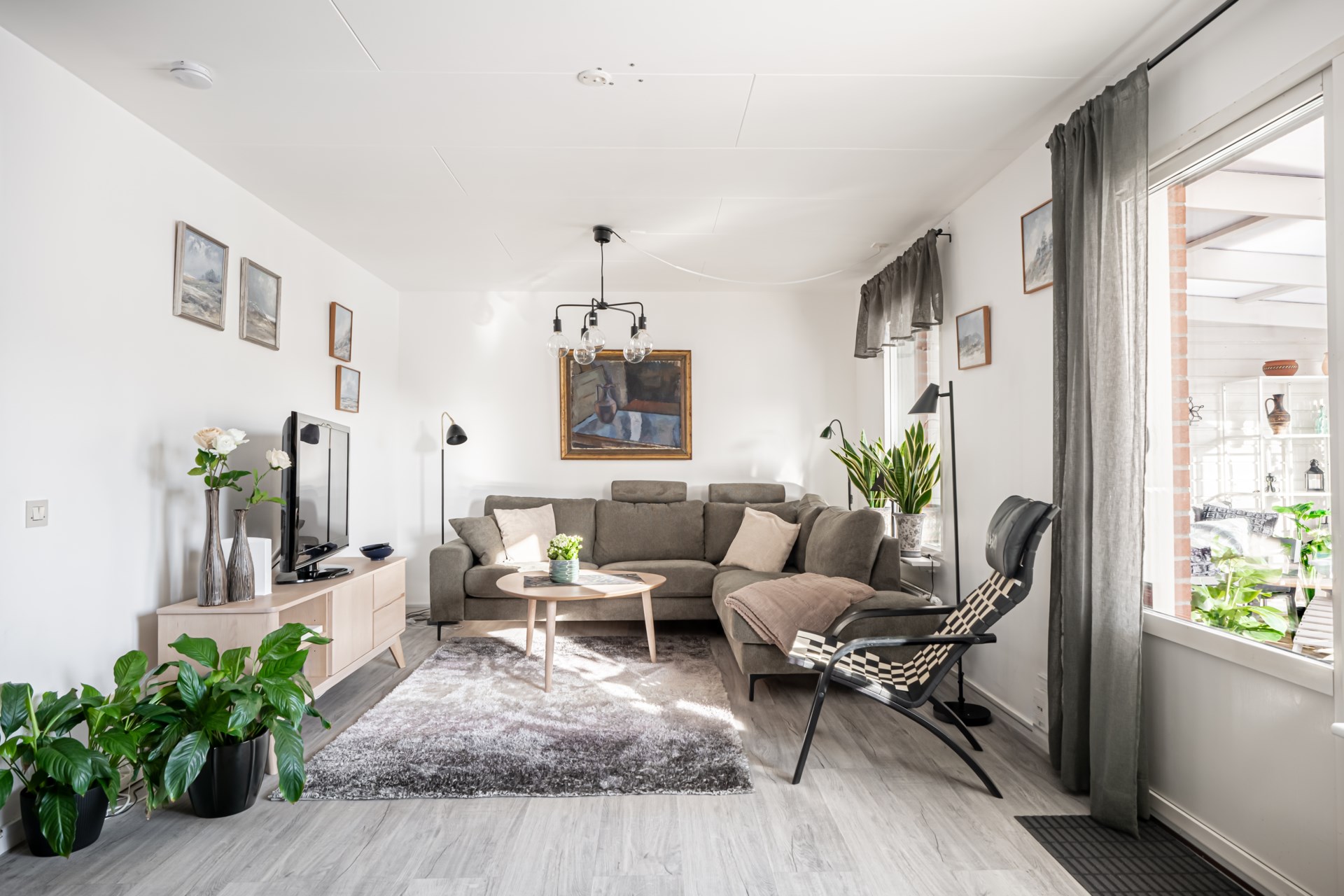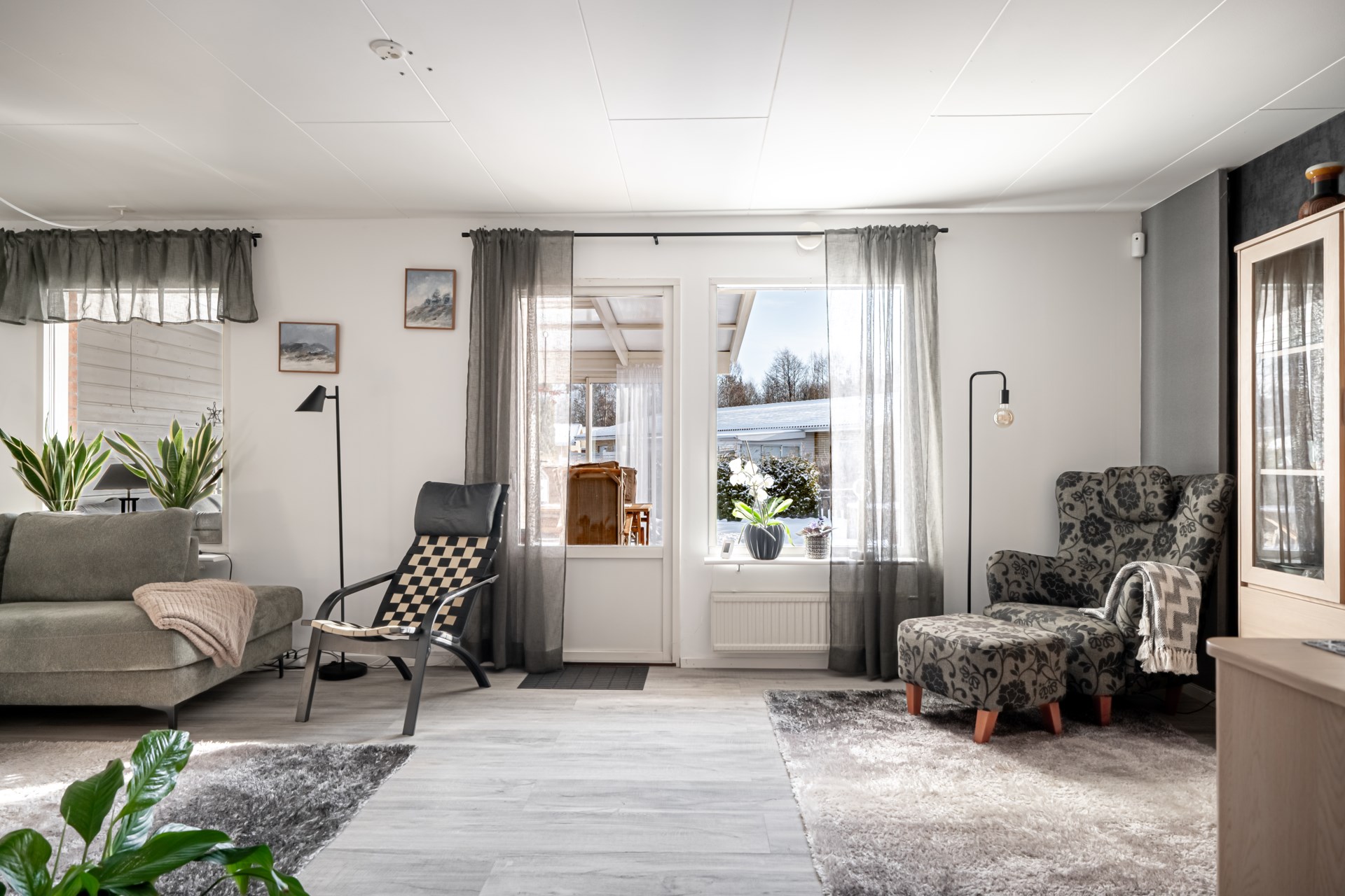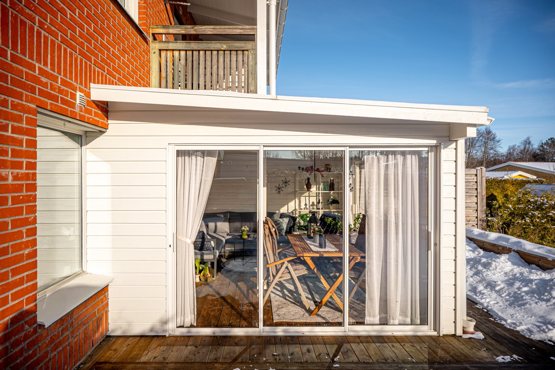Rakt fram från hallen öppnar bostaden upp sig mot ett rymligt vardagsrum med härligt ljusinsläpp. Här finns gott om plats för både soffgrupp och matbord för den som önskar en större social yta. Från vardagsrummet når ni det inglasade uterummet, som blir en naturlig förlängning av hemmet och en uppskattad plats stora delar av året.