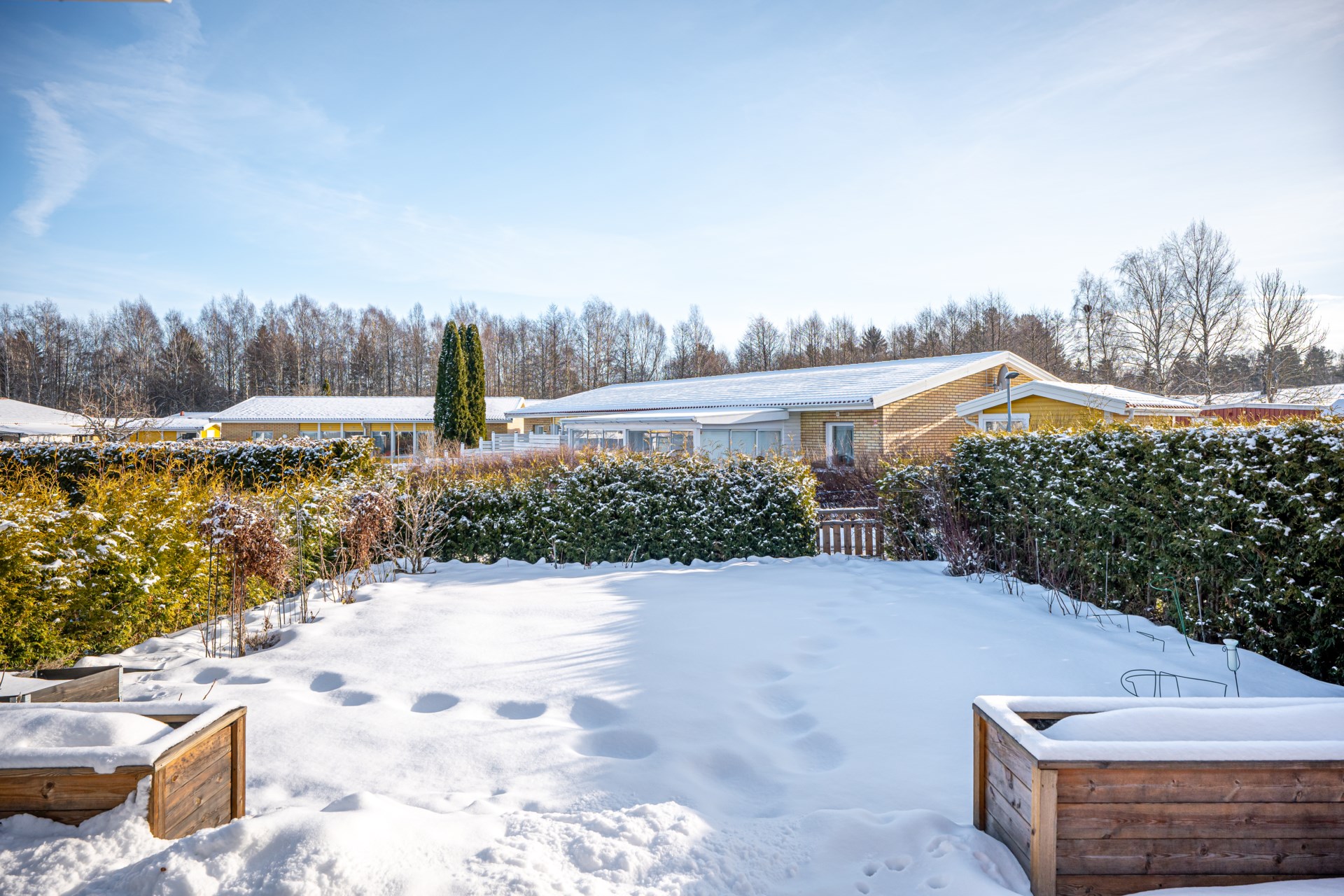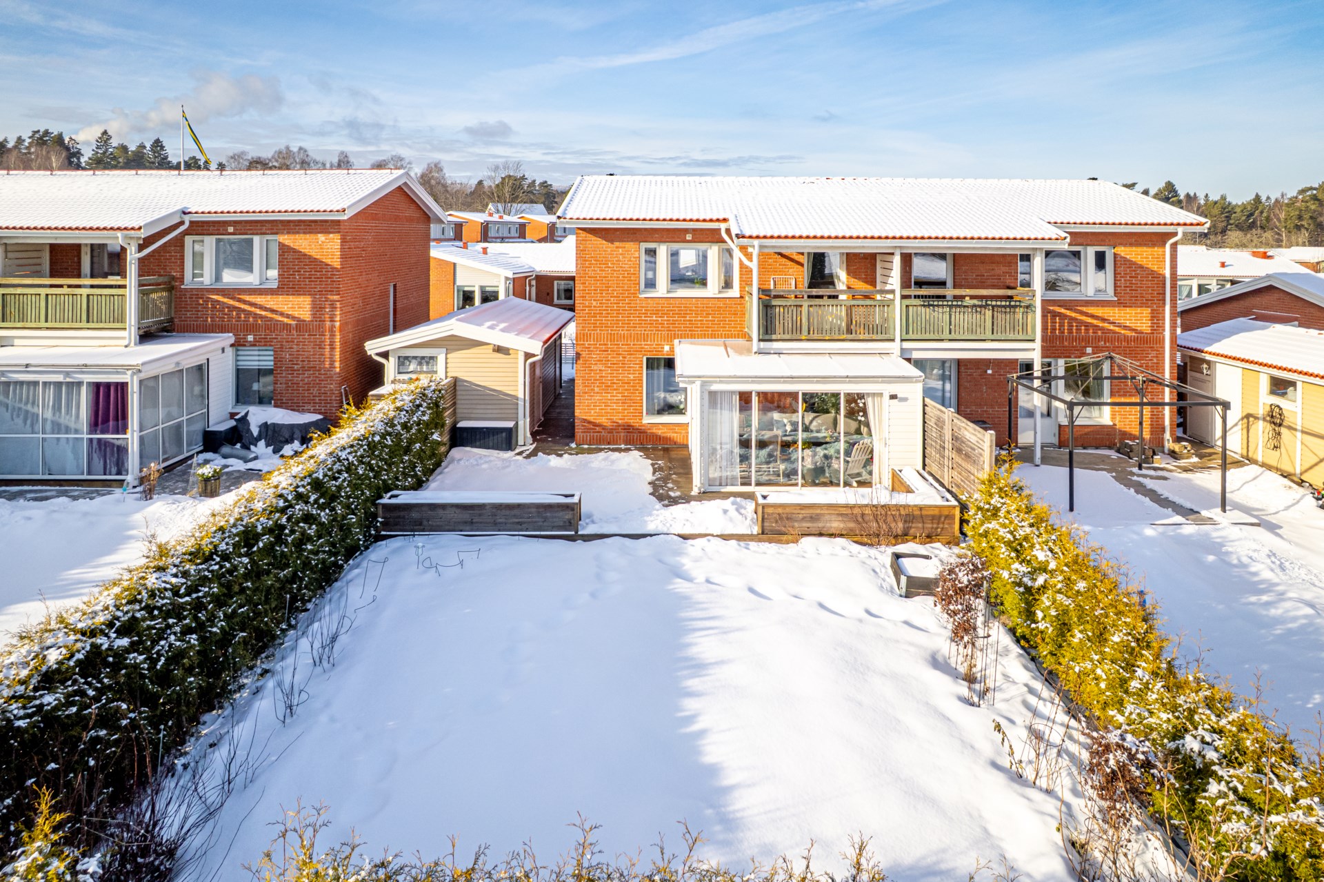 Baksidan erbjuder en generös trädgårdsyta med stort trädäck för lek, odling och avkoppling. Här skapas enkelt en privat oas för grillkvällar, barnens spring och sommarkvällar i gott sällskap.