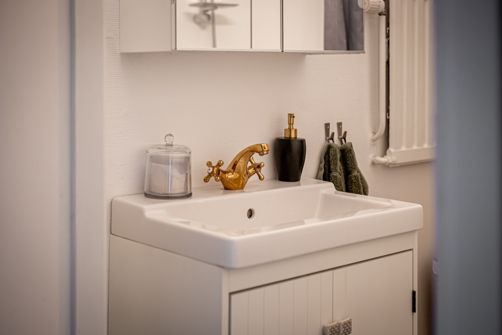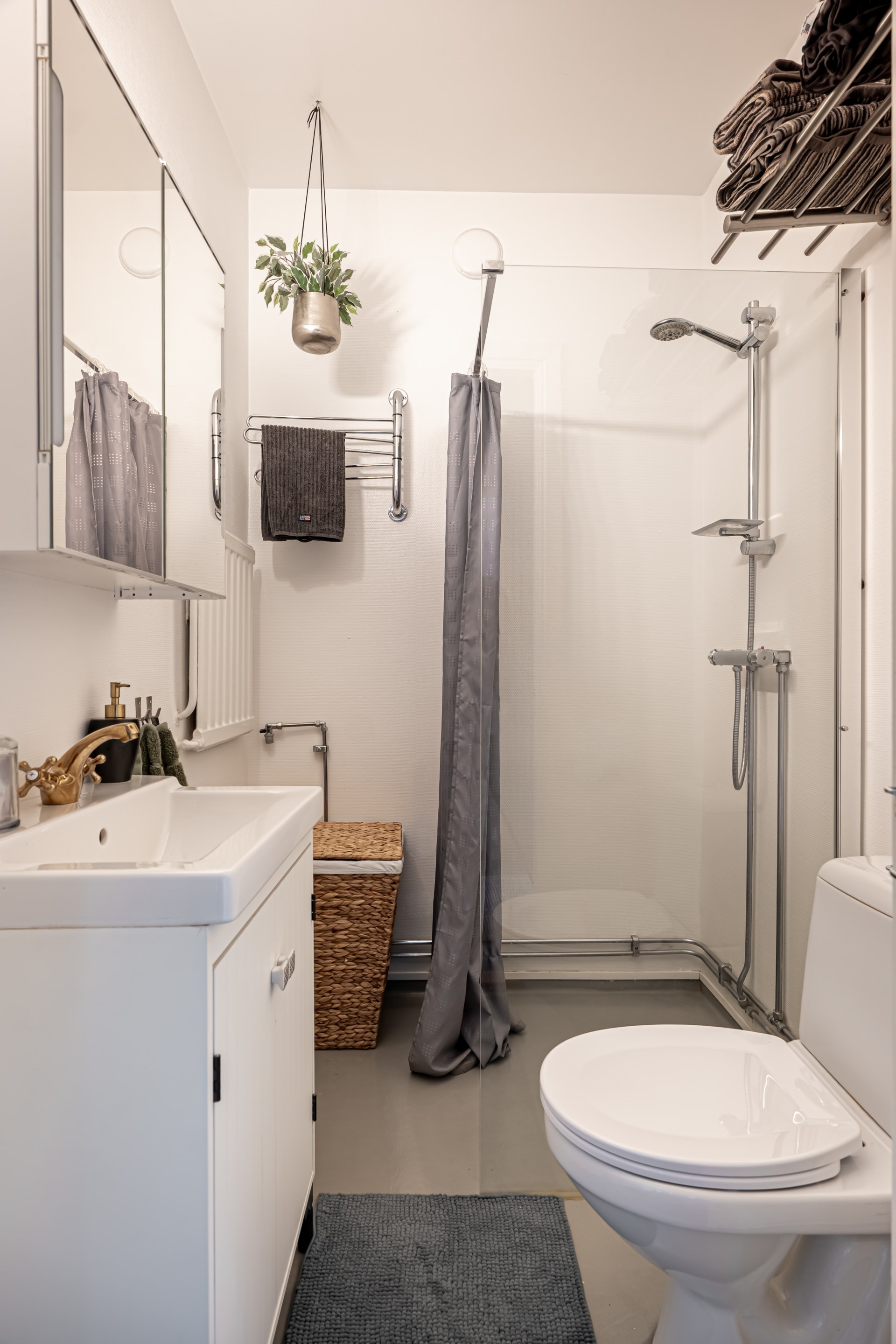 - Badrum: Ljust badrum med våtrumsmatta på väggar och golv. I badrummet har ni toalett, kommod, spegelskåp och dusch.
