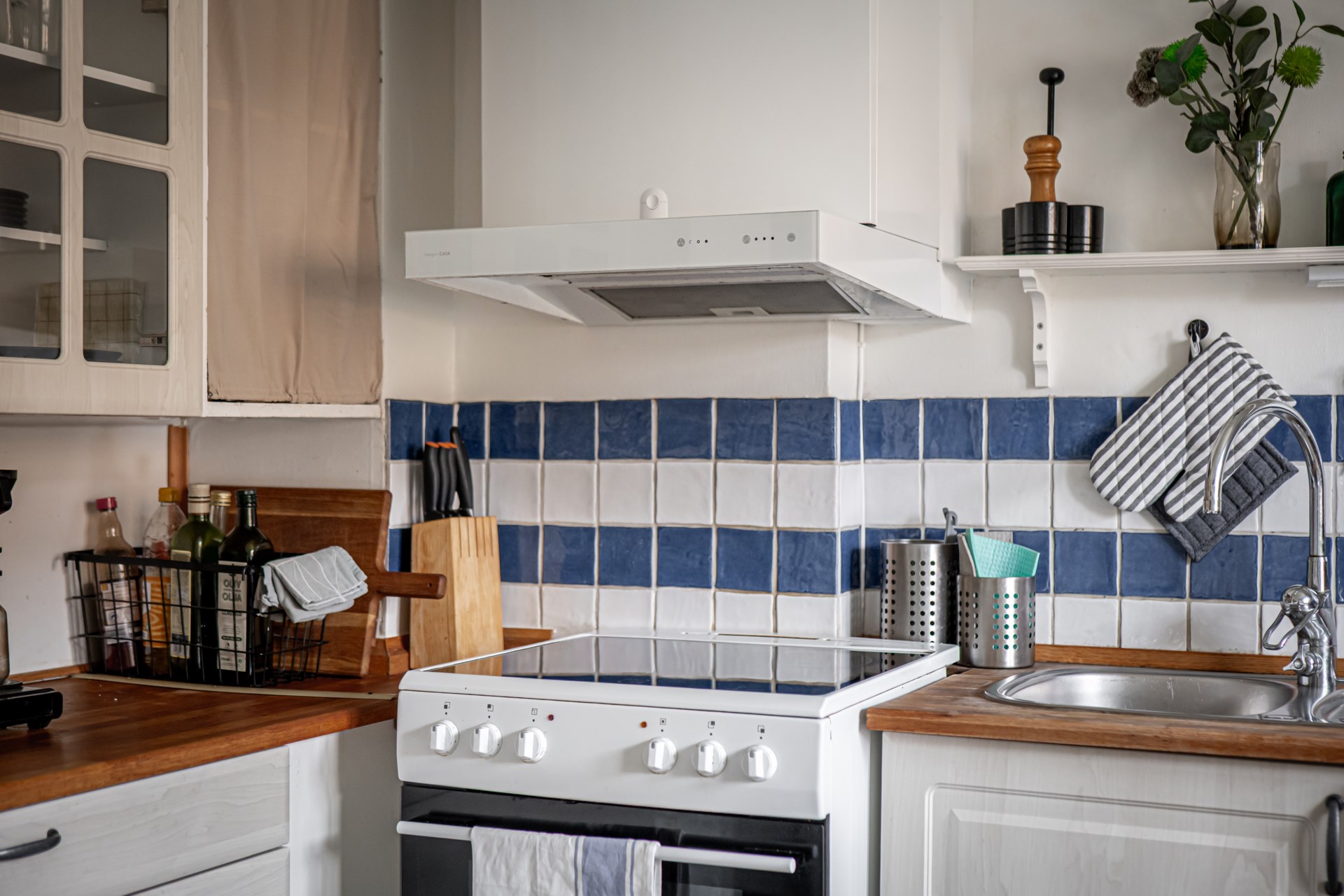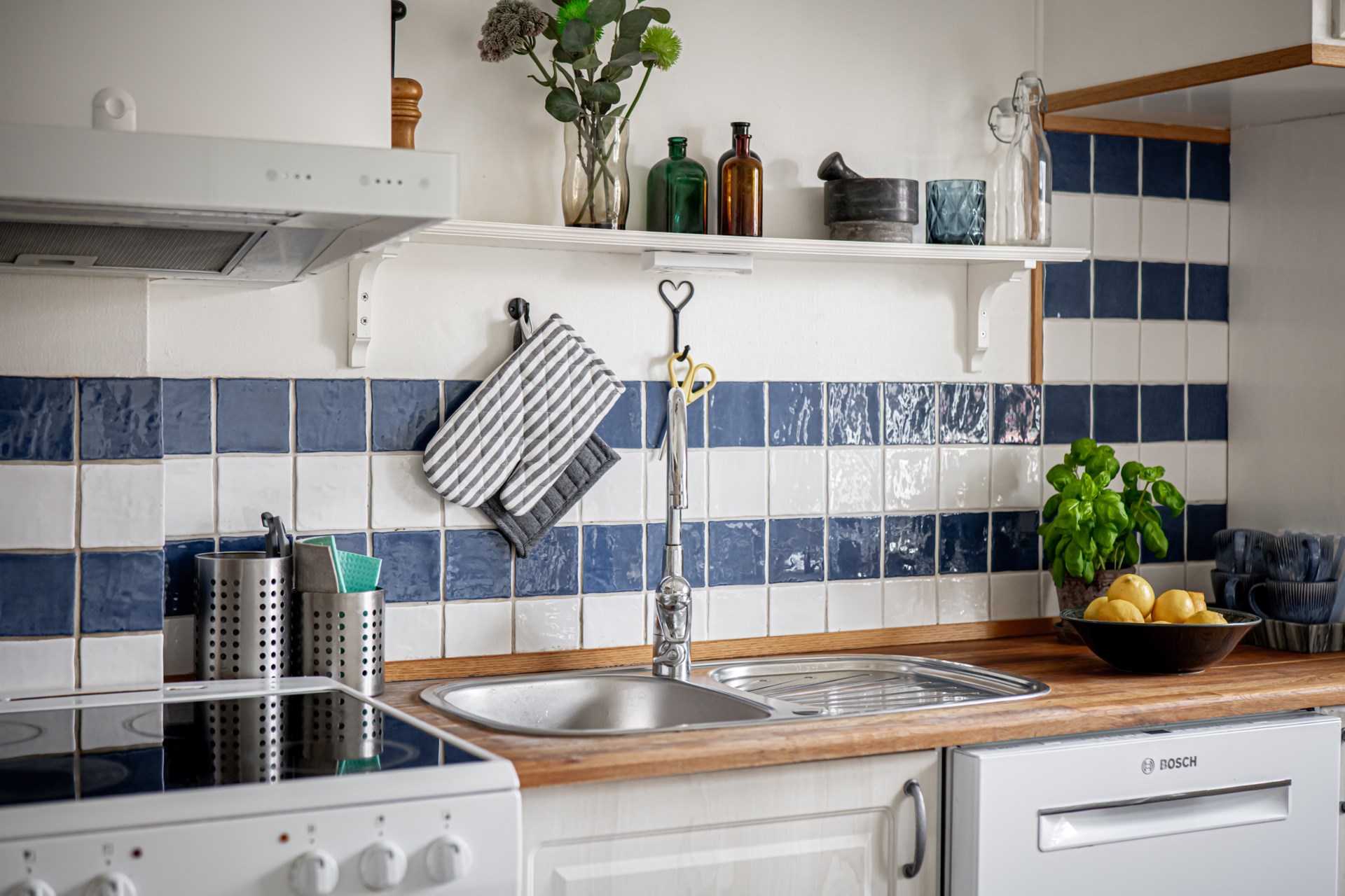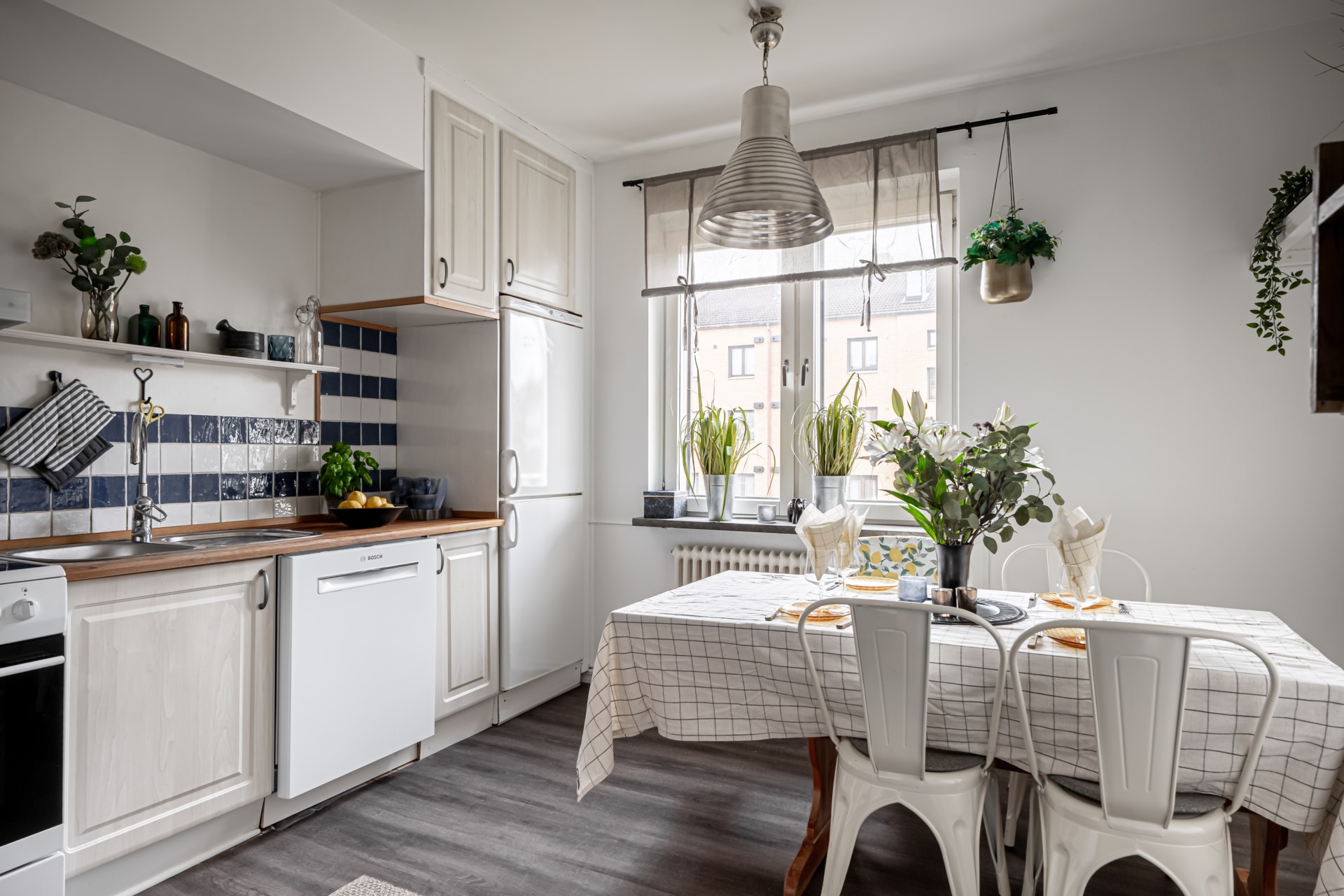 - Kök: Inbjudande kök med gott om lådor och skåp för porslin och köksredksap. Köket är utrustat med spis, ugn, fläkt, diskmaskin samt kyl/frys. I köket har du plats för matbord med fyra stolar.