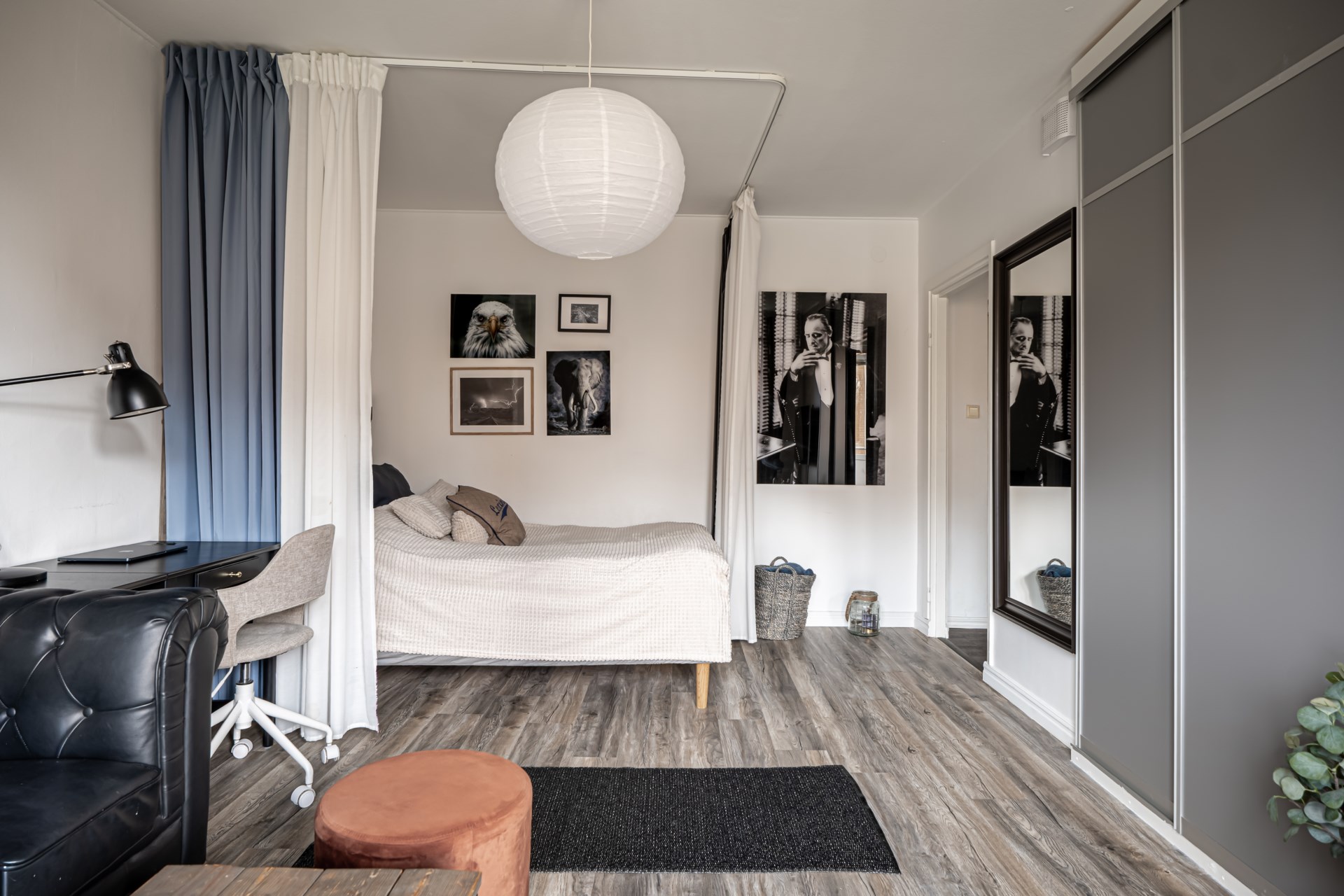 Välkommen till denna ombonade och mysiga etta, ett hem som direkt bjuder in till trivsel! Här bor du smart planerat med ett rymligt allrum som enkelt rymmer både säng och soffgrupp, vilket skapar en naturlig och bekväm uppdelning mellan vila och umgänge.Från rummet nås den härliga balkongen i soligt läge, en perfekt plats att njuta av morgonkaffet eller koppla av i eftermiddagssolen. Lägenheten erbjuder dessutom goda förvaringsmöjligheter genom både garderob och praktisk skjutdörrsgarderob, vilket gör det enkelt att hålla ordning och skapa ett harmoniskt hem. Köket är trivsamt och funktionellt med plats för matbord, vilket ger en naturlig samlingspunkt för både vardag och middag med vänner.
