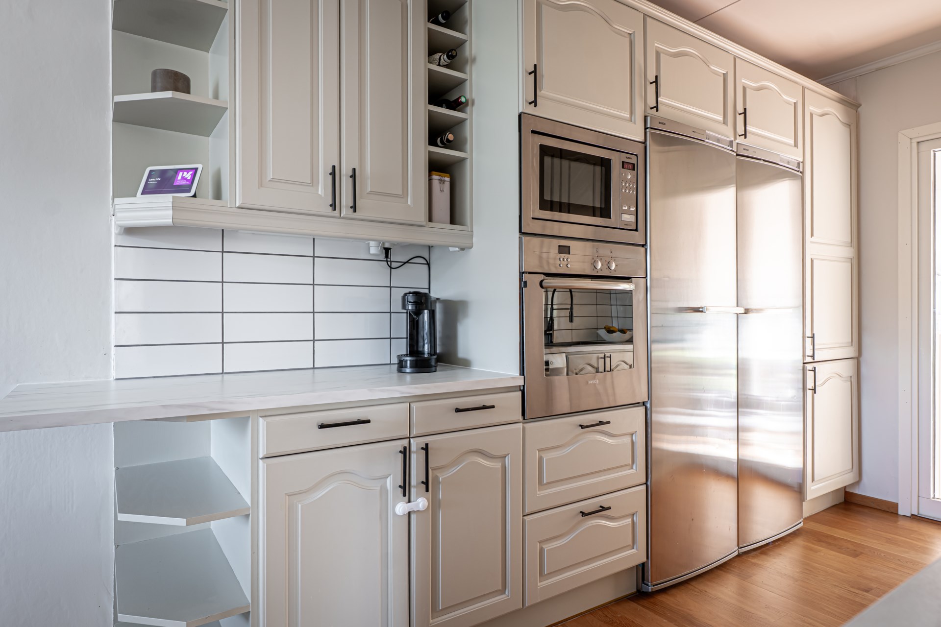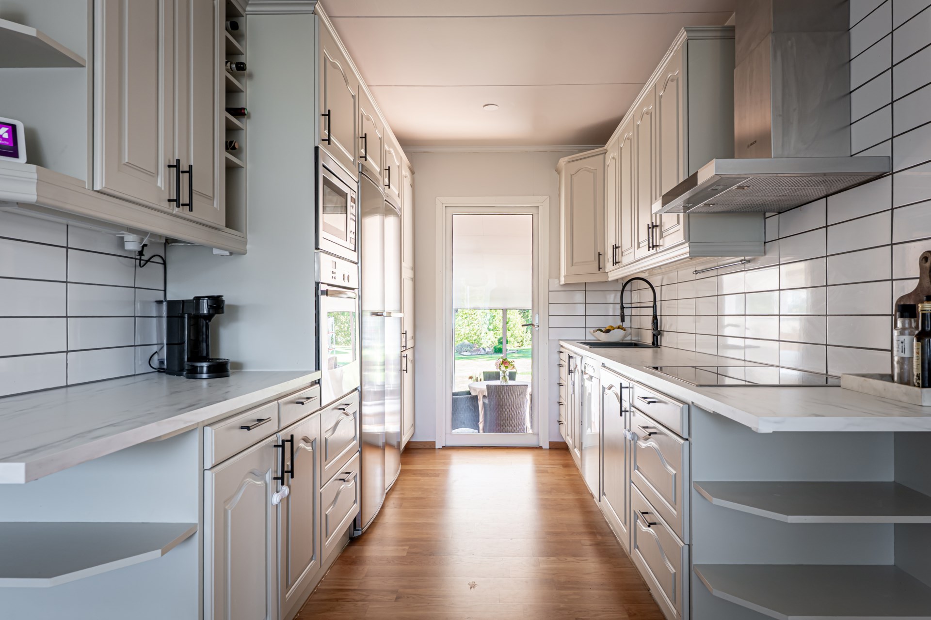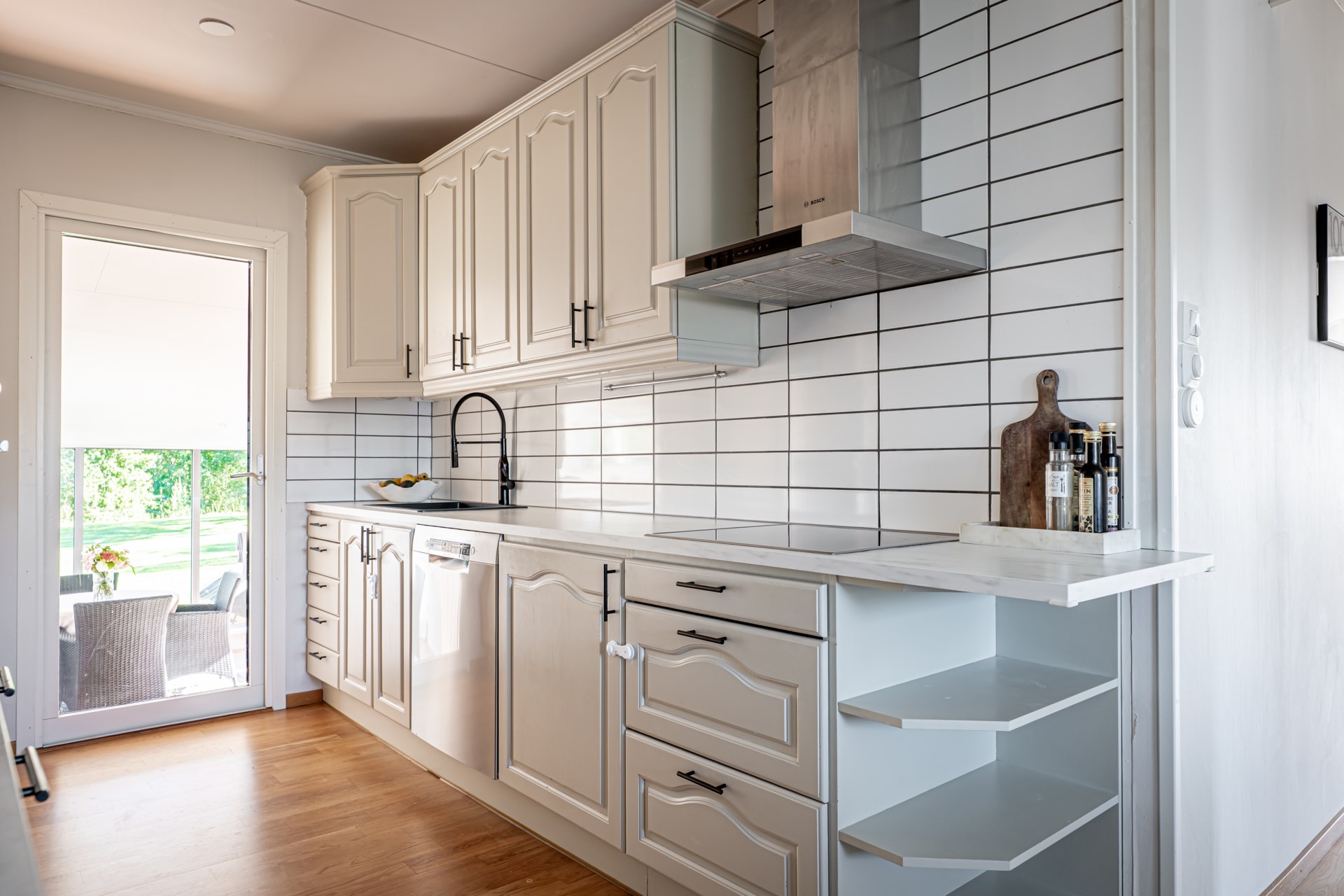 Källaren bjuder på ännu fler möjligheter! Här finns ett mysigt tv-rum för filmkvällar, en praktisk tvättstuga, gott om förvaringsutrymmen, direkt ingång till garaget – och som kronan på verket, er alldeles egna bar. En härlig plats för umgänge och roliga stunder året om. - Kök: Ljust och hemtrevligt kök med gott om skåp och lådor för porslin och köksredskap. Köket är utrustat med spishäll, fläkt, diskmaskin, inbyggd micro och ugn samt kyl och frys i fullhöjd. I köket har ni plats för ett matbord med fyra stolar. Från köket har ni utgång till det fina uterummet som blir en given plats under sommarens dagar.