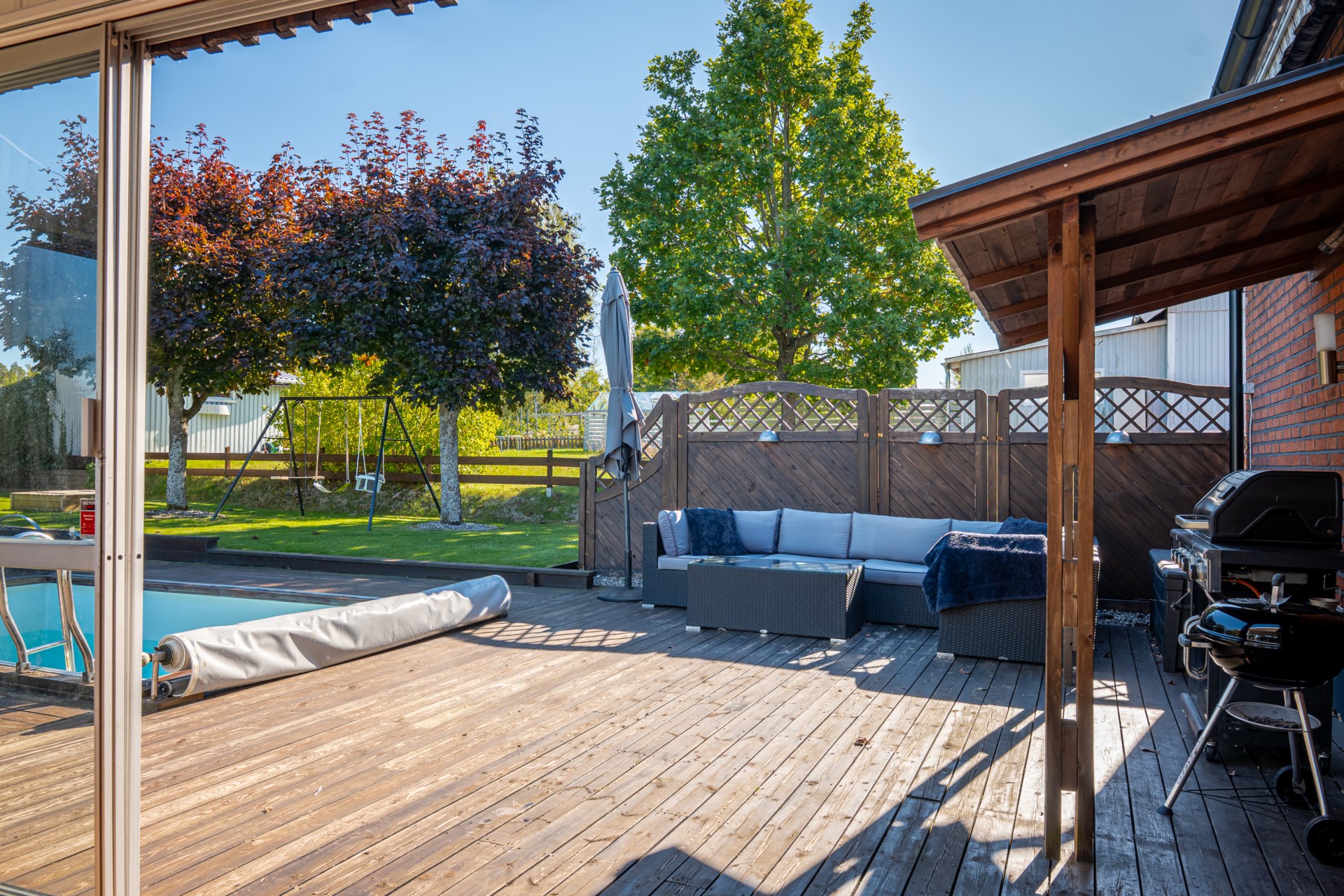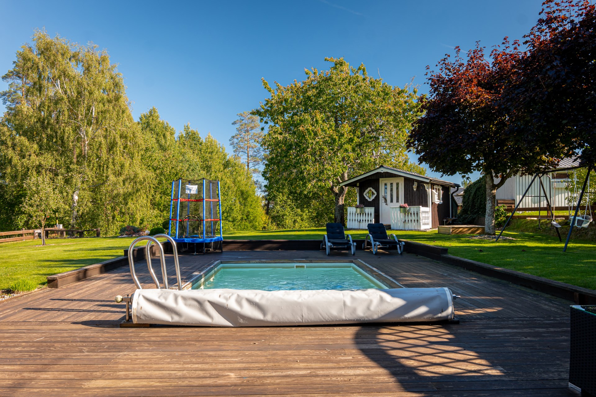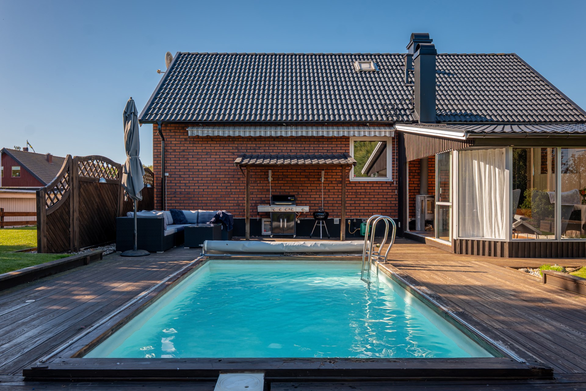 Välkommen till denna trivsamma villa i hjärtat av Stöpen, ett hem som bjuder in till både vardagsliv och fest. Här bor du med naturen som närmsta granne och en fantastisk baksida som öppnar upp mot grönområde, vilket skapar en rofylld och privat atmosfär.Sommartid blir den egna poolen med omgivande trädäck en given samlingsplats för hela familjen. Här finns gott om plats för både bad, solstolar och middagar under bar himmel. Vill du förlänga säsongen ytterligare finns dessutom ett stort uterum, perfekt för långa kvällar i gott sällskap.
