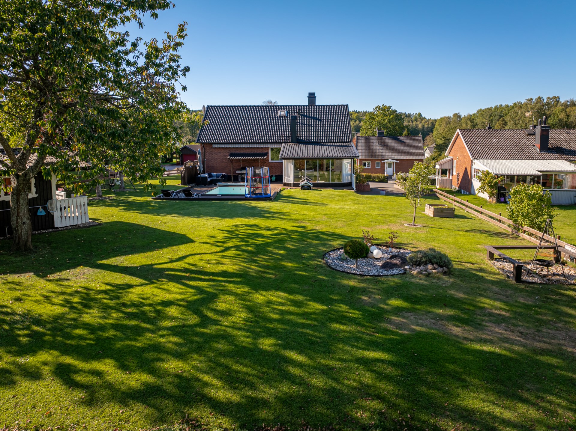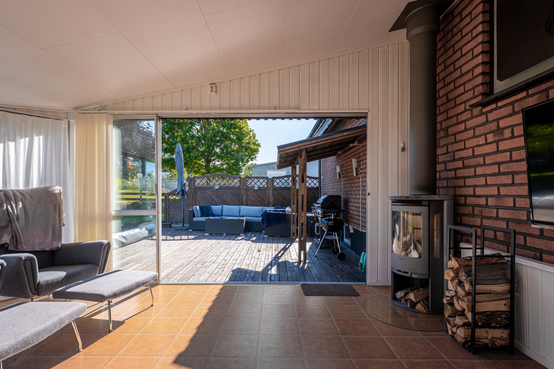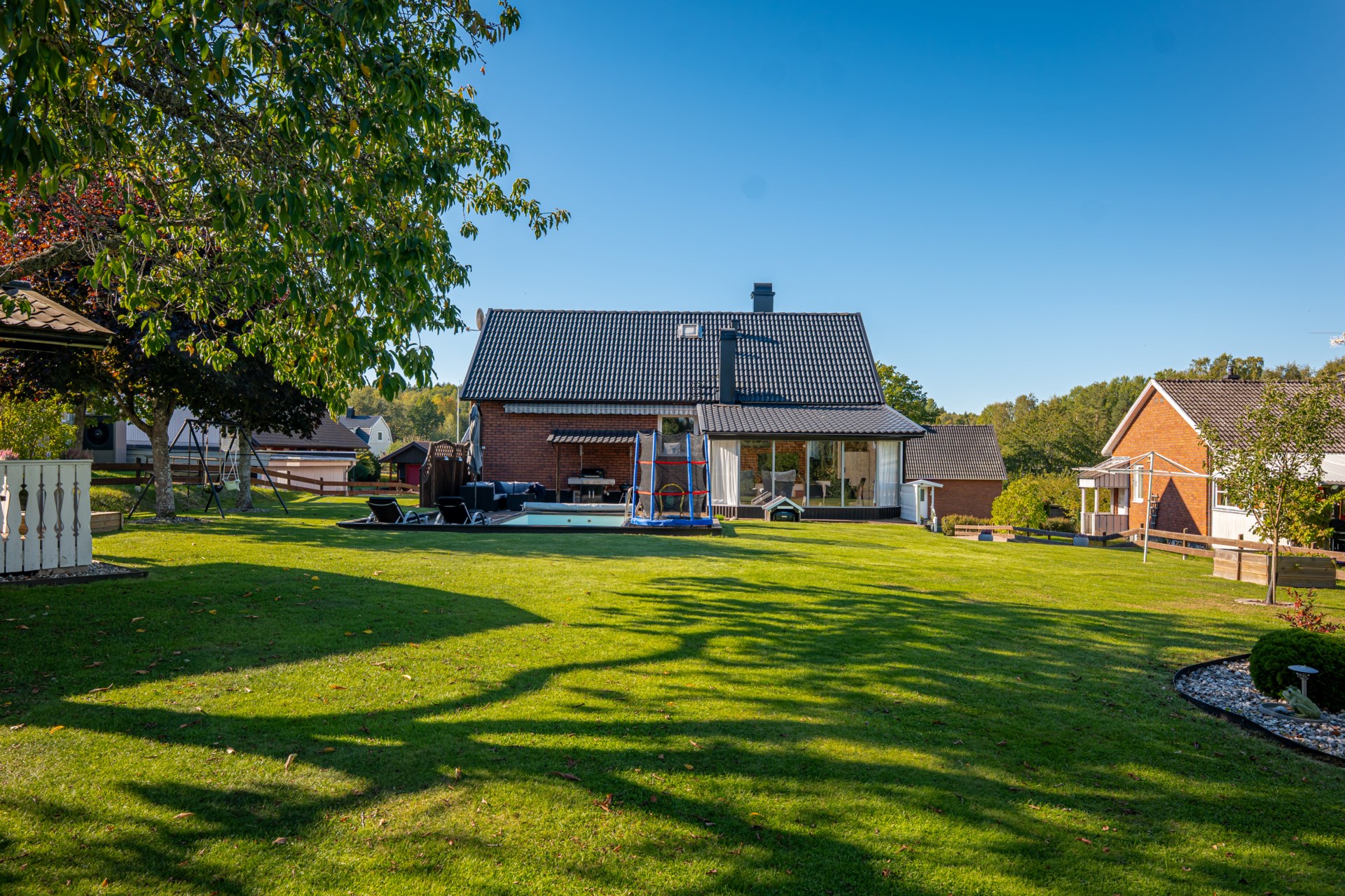 Välkommen till denna trivsamma villa i hjärtat av Stöpen, ett hem som bjuder in till både vardagsliv och fest. Här bor du med naturen som närmsta granne och en fantastisk baksida som öppnar upp mot grönområde, vilket skapar en rofylld och privat atmosfär.Sommartid blir den egna poolen med omgivande trädäck en given samlingsplats för hela familjen. Här finns gott om plats för både bad, solstolar och middagar under bar himmel. Vill du förlänga säsongen ytterligare finns dessutom ett stort uterum, perfekt för långa kvällar i gott sällskap.