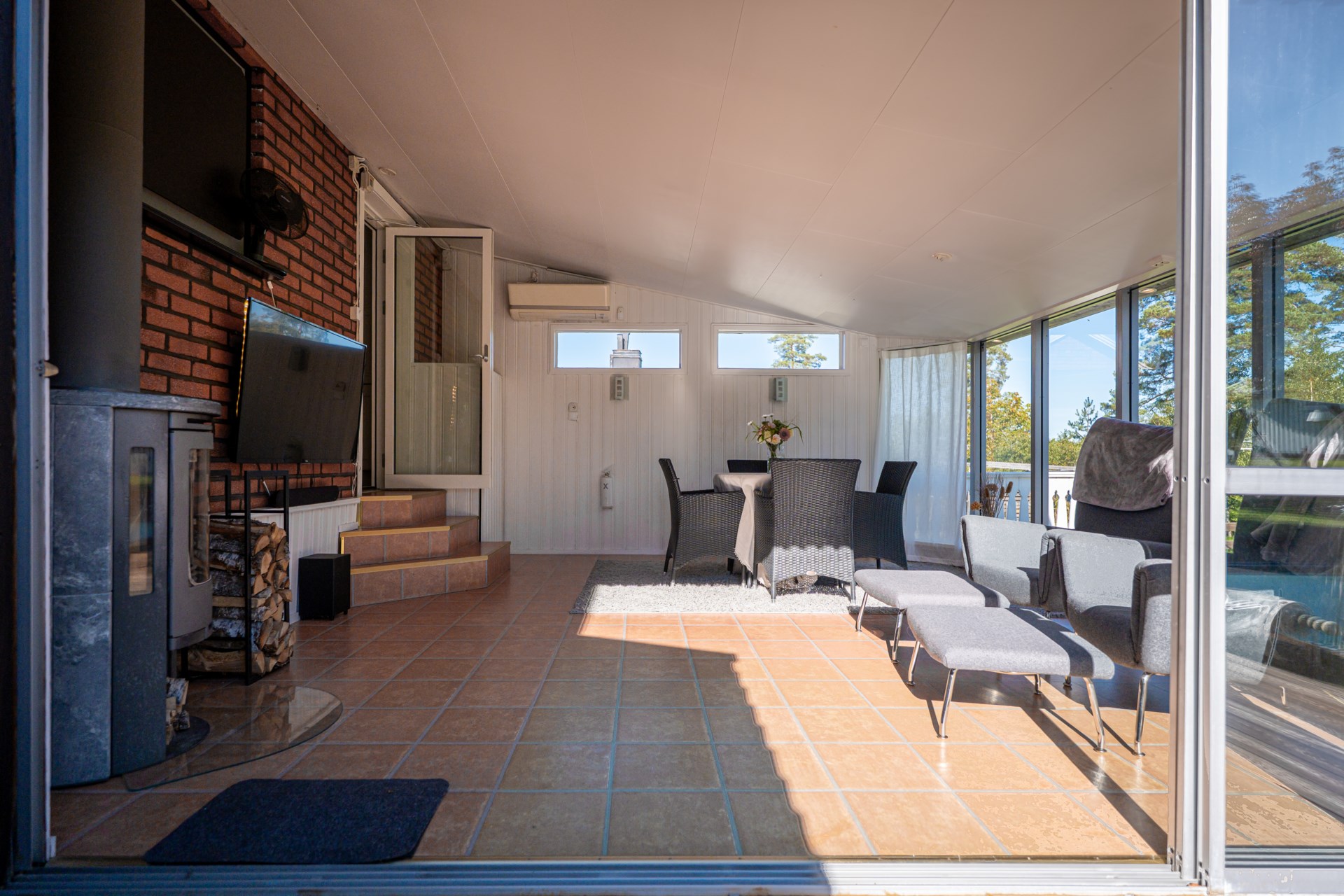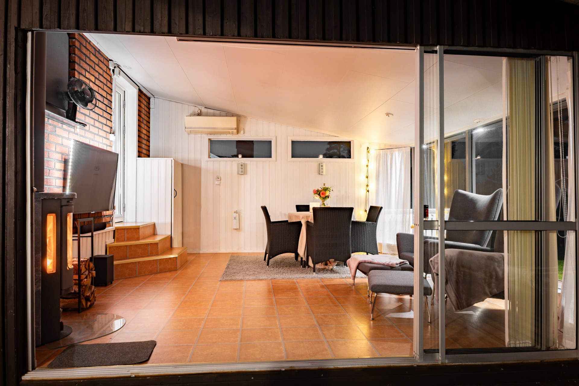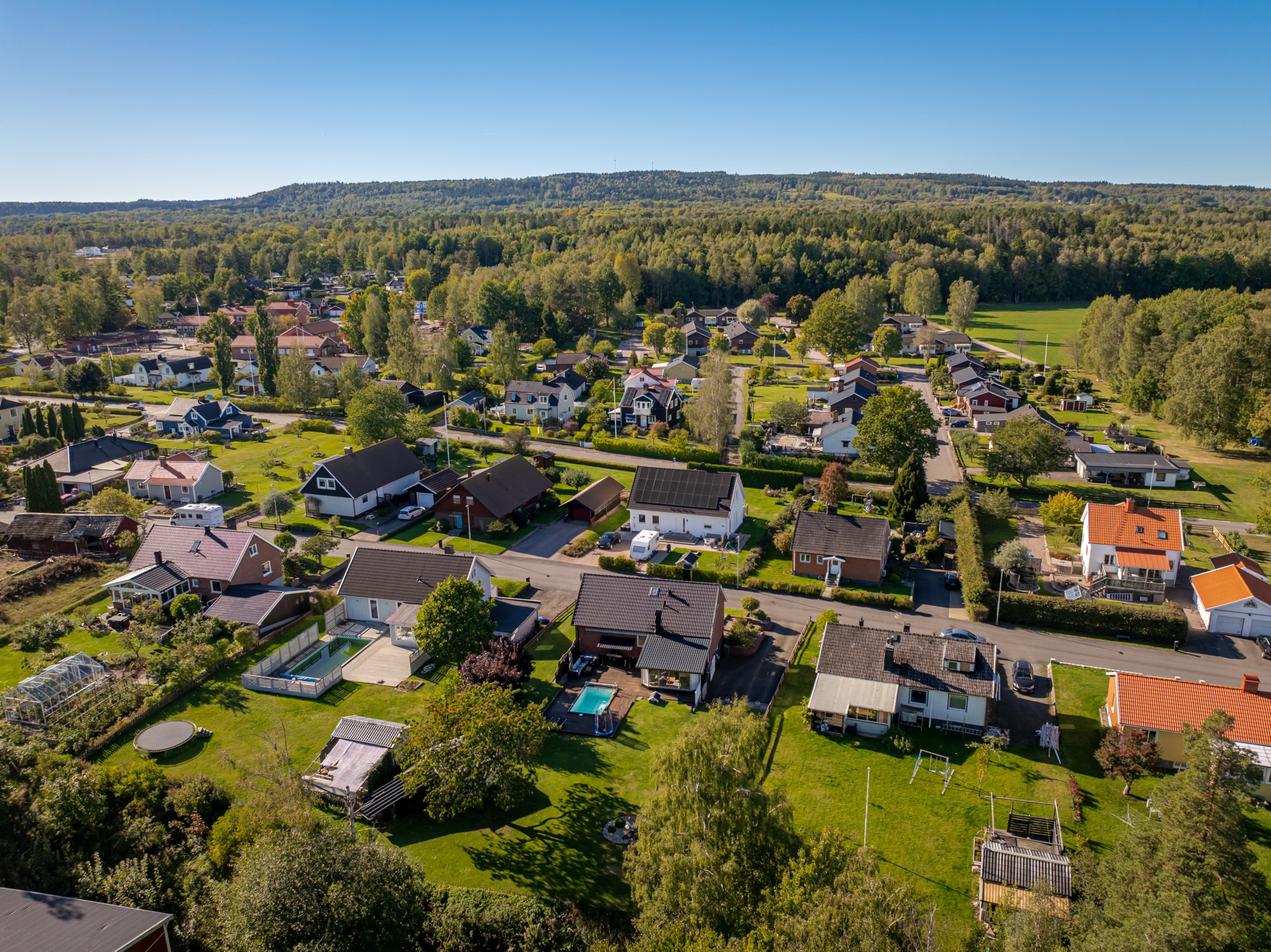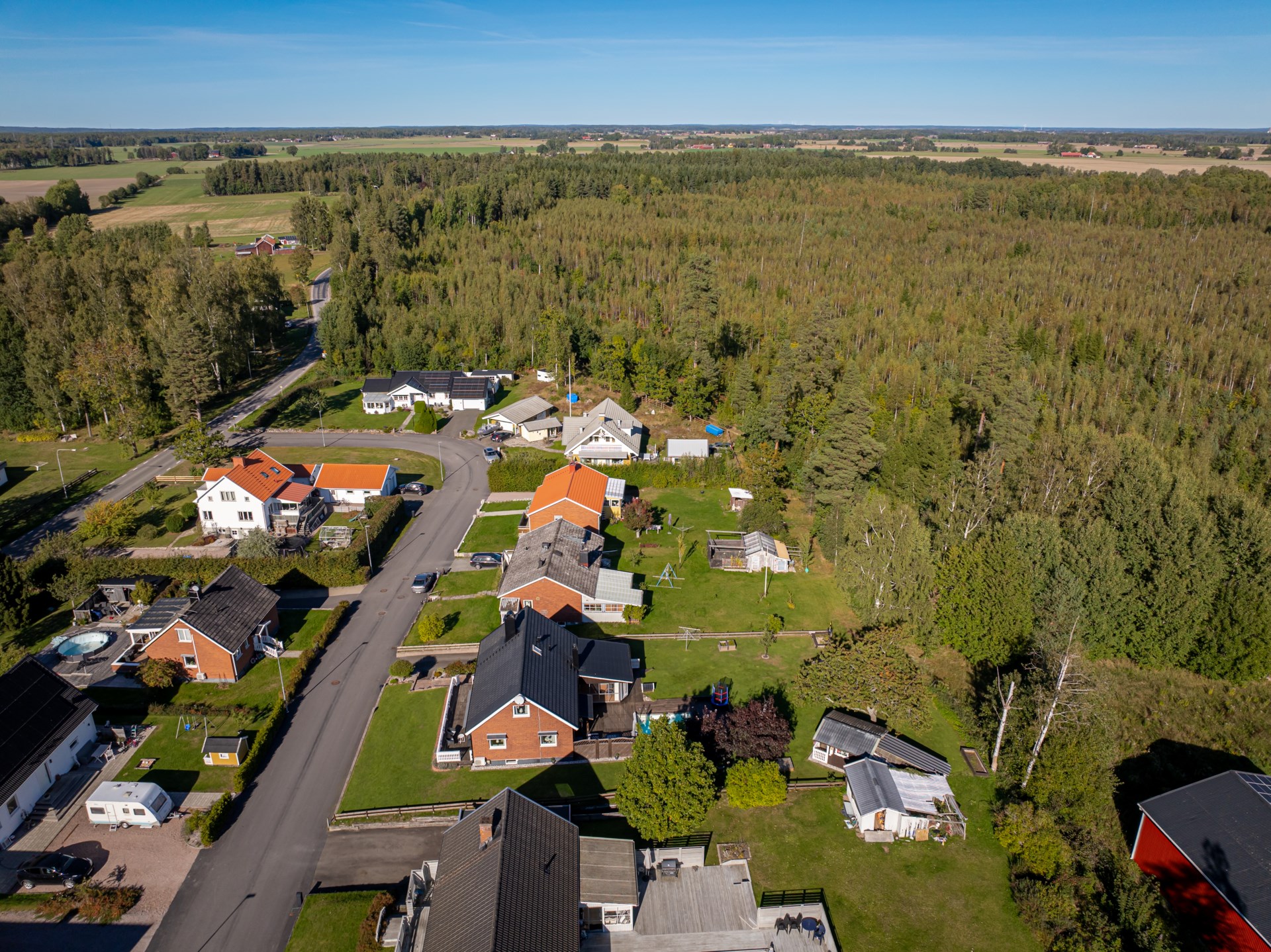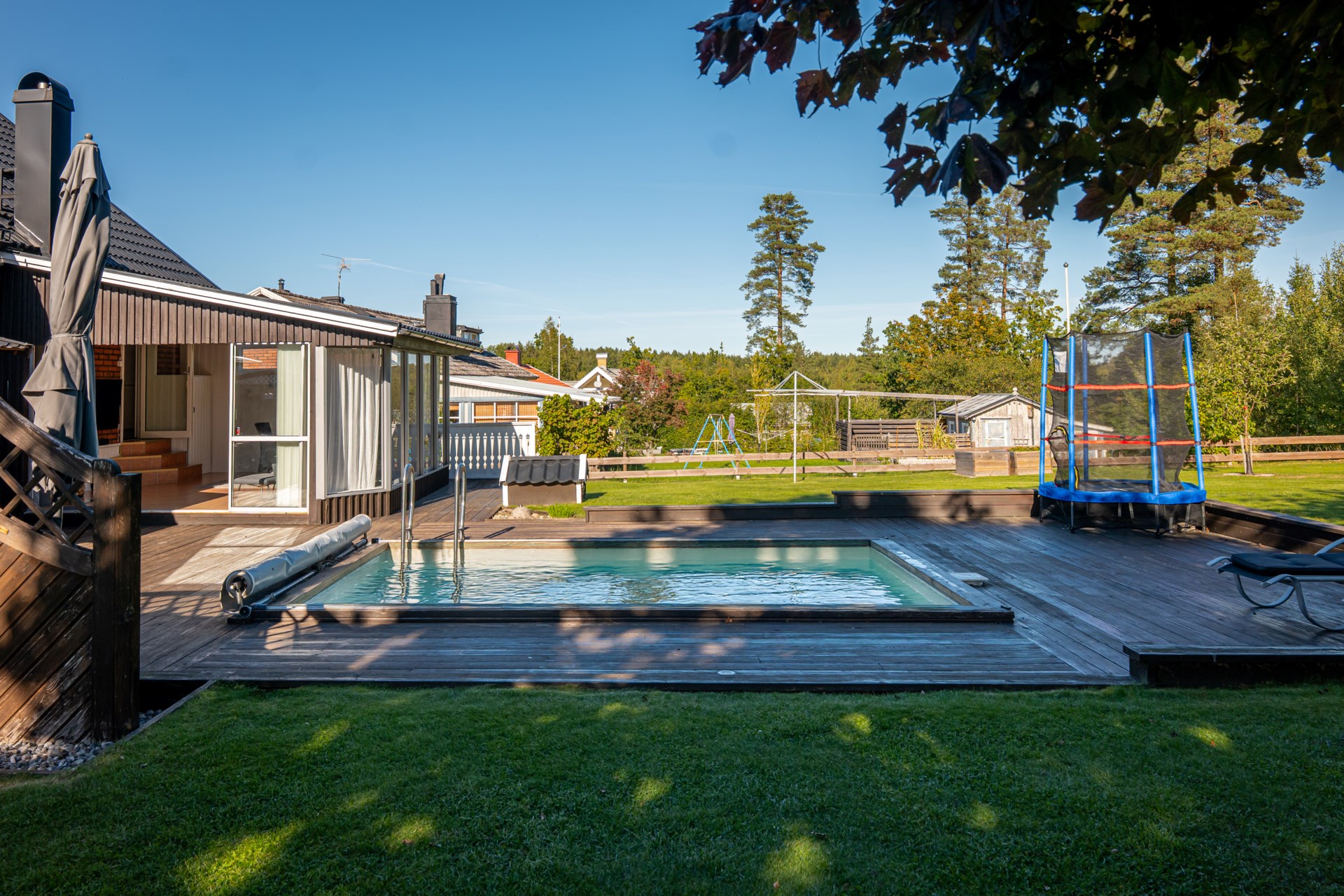 Föreställ dig att vakna upp en solig sommardag med en heldag av poolhäng framför dig, eller julaftonsmorgon när barnen springer ut till granen som står i uterummet, medan braskaminen sprider värme och uterummet blir familjens naturliga samlingsplats. Här kan du njuta året om – oavsett säsong. Den rofyllda baksidan ramas in av skogen som granne och ger en känsla av avskildhet och lugn, en riktig frizon från vardagens tempo.