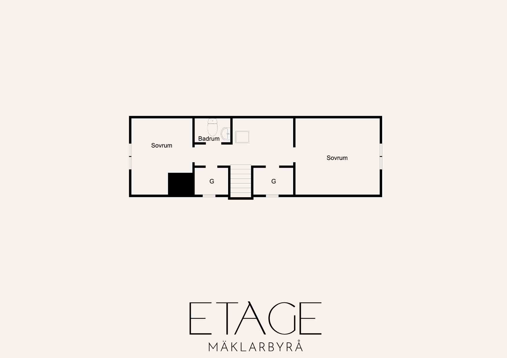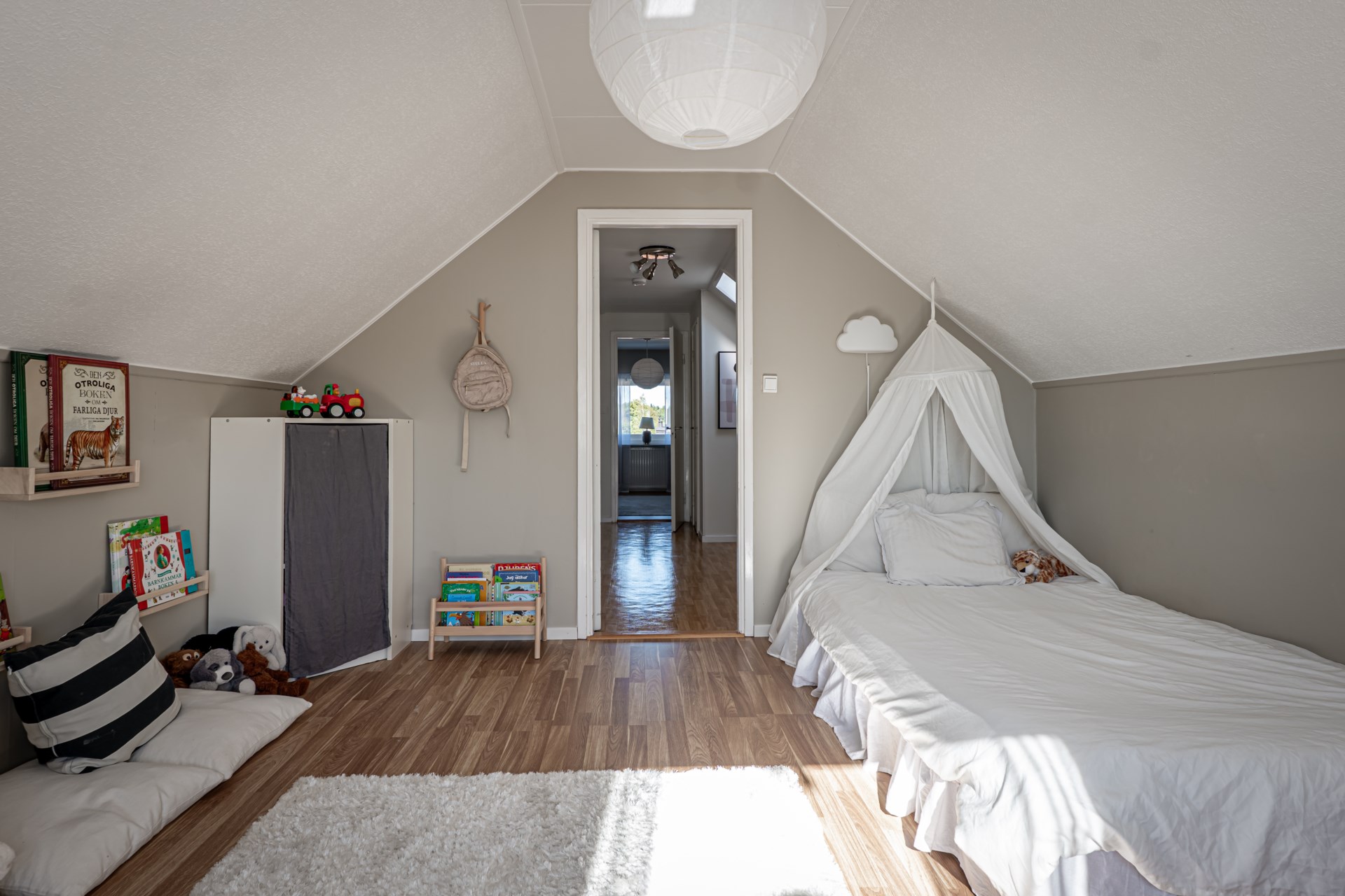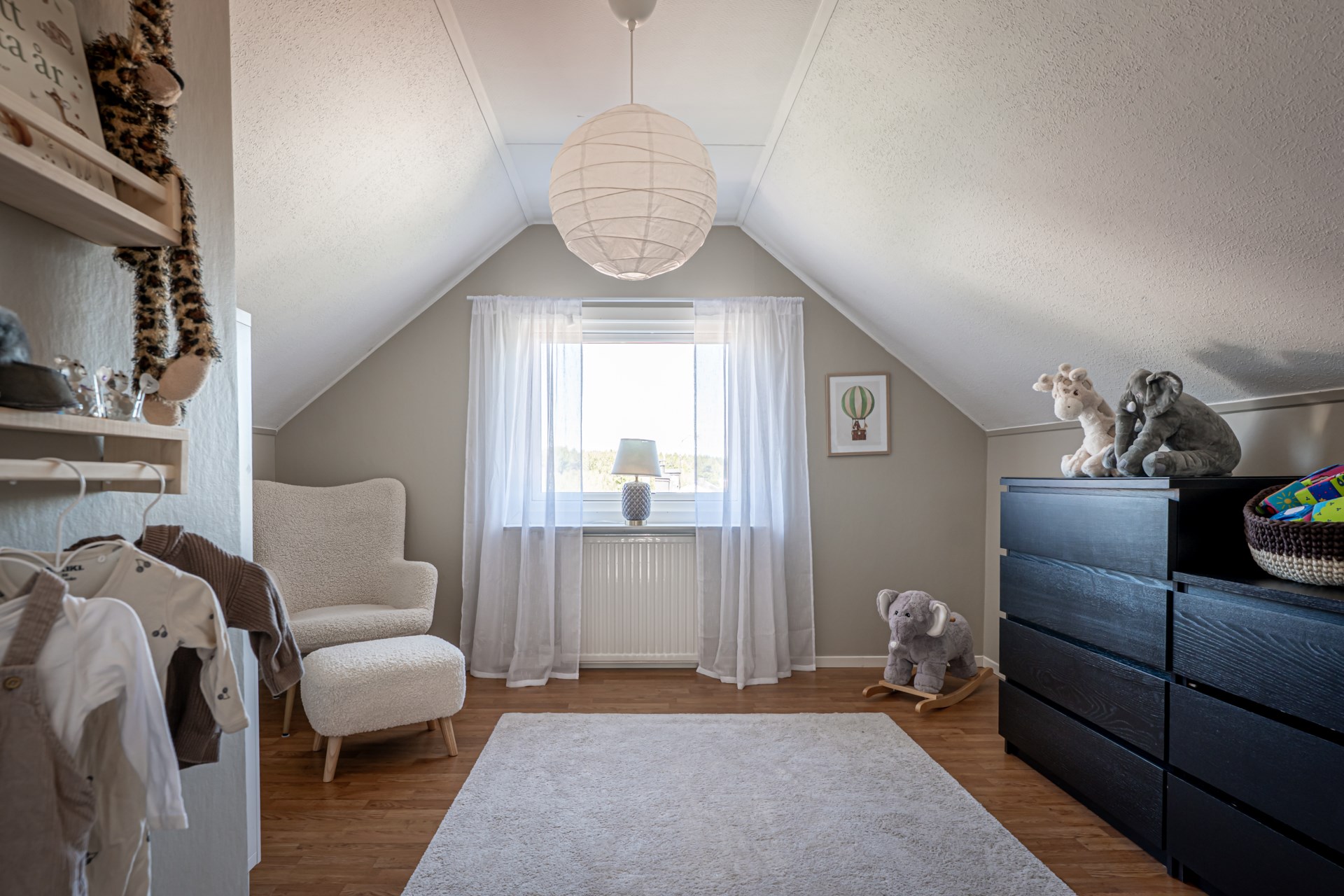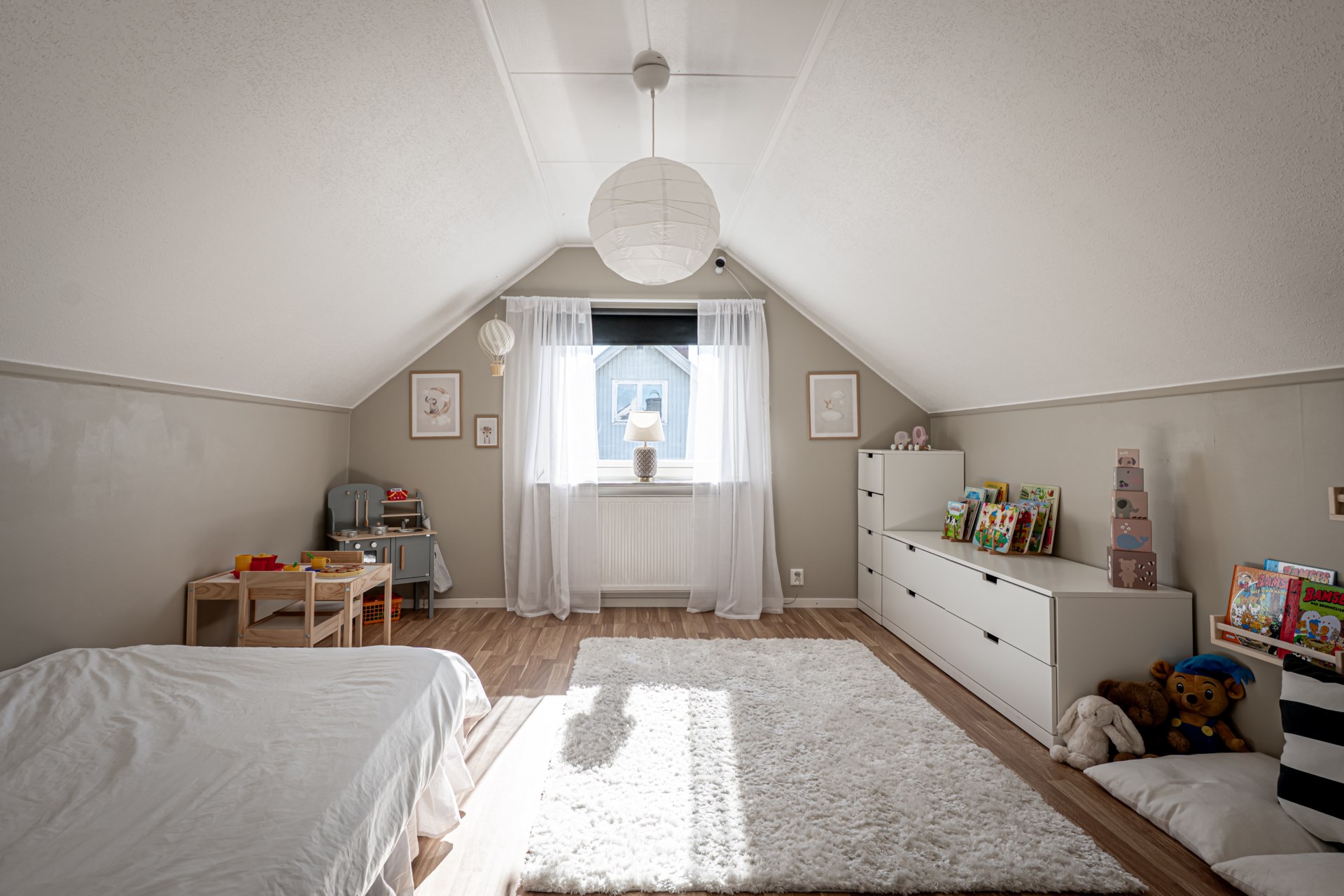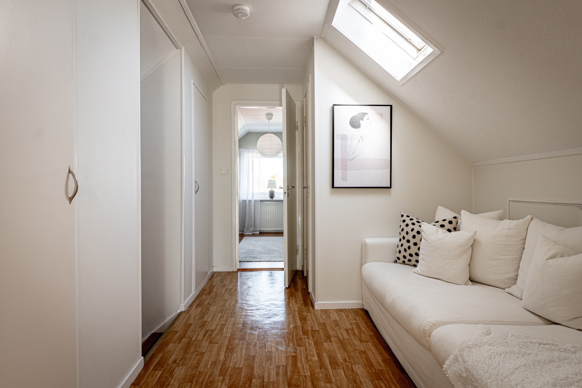 Tar ni trappan upp möts ni av ett allrum. Här finns plats för en soffa, två inbyggda garderober samt en praktisk WC. På varsin sida av allrummet ligger två väl tilltagna sovrum som båda erbjuder bra yta och trivsam känsla.