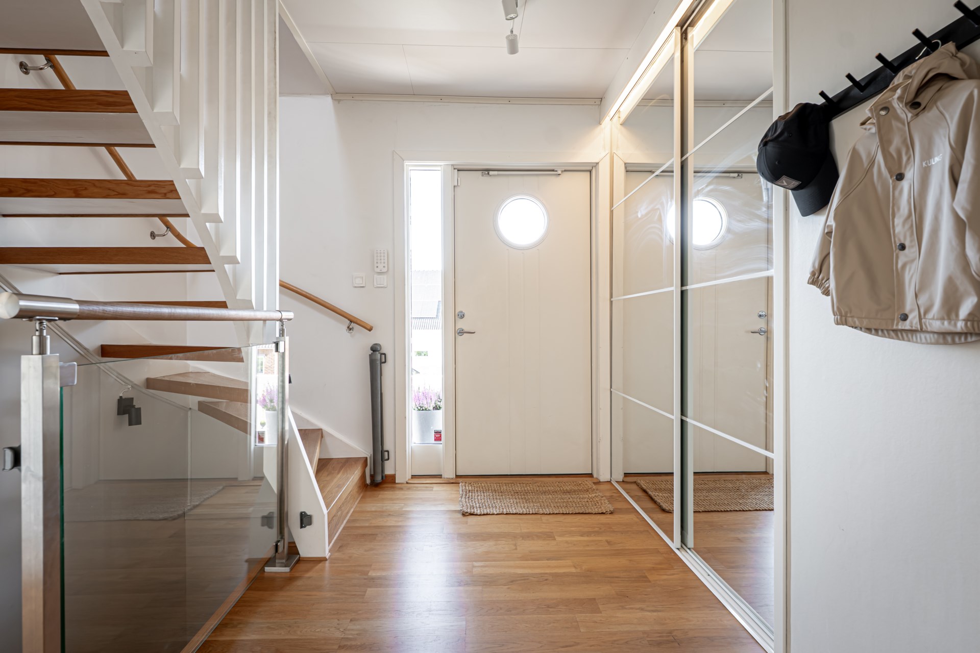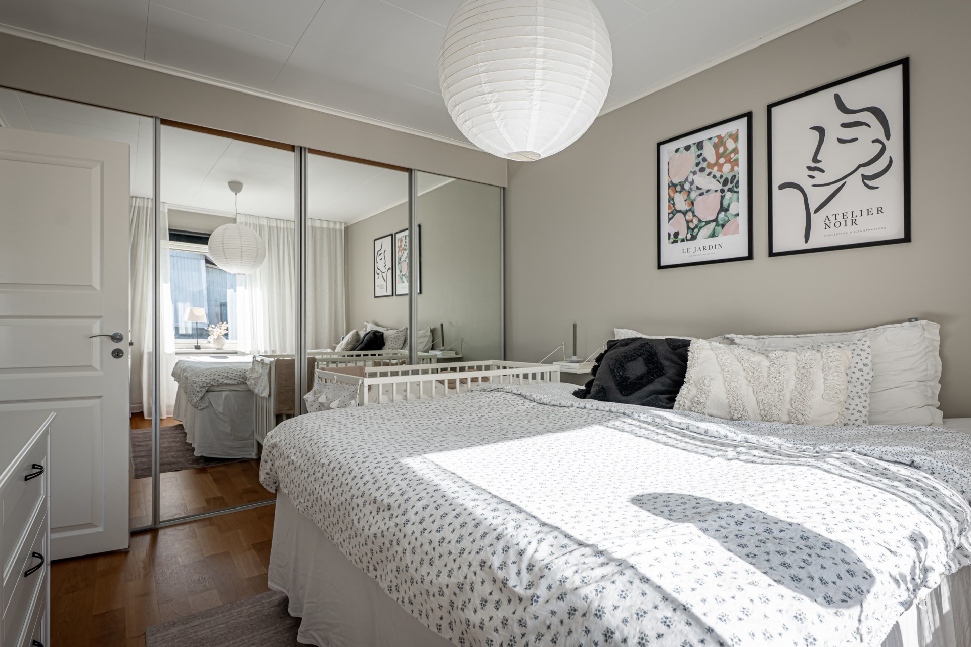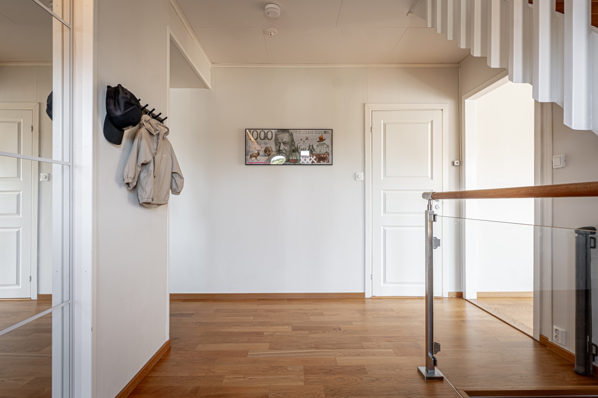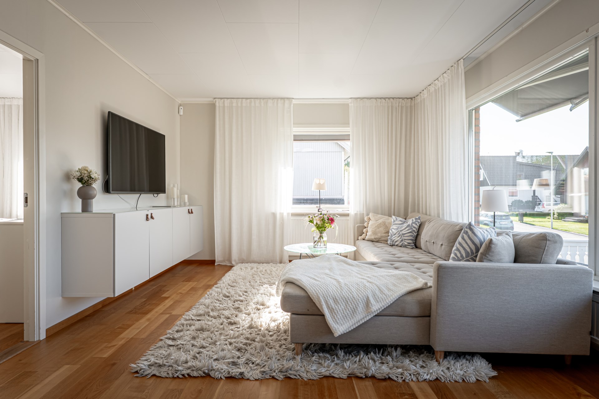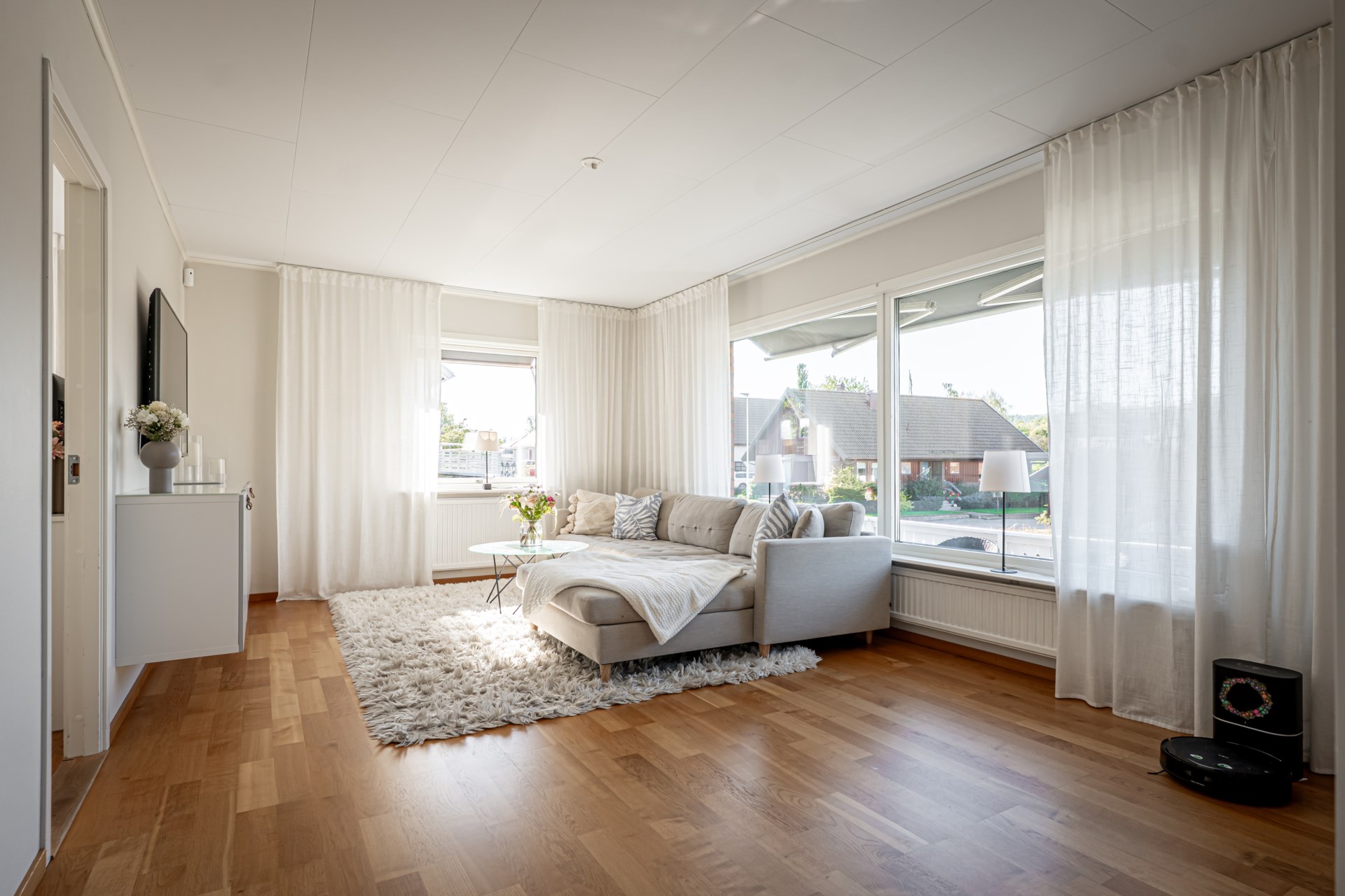 - Allmän beskrivning: Välkomna till denna väl omhändertagna familjevilla där varje kvadratmeter är genomtänkt för ett bekvämt och trivsamt boende. Redan i hallen möts ni av en generös skjutdörrsgarderob som ger gott om plats för ytterkläder och skor. Till vänster ligger det hemtrevliga köket, medan ni rakt fram når det påkostade badrummet. På höger sida öppnar sig ett rymligt vardagsrum med fantastiskt ljusinsläpp från stora fönster i två väderstreck. Här finns gott om plats för både soffgrupp och matsalsbord – perfekt för såväl vardagsmys som större middagar. Intill vardagsrummet ligger det största sovrummet med plats för dubbelsäng och bra förvaring i skjutdörrsgarderober.
