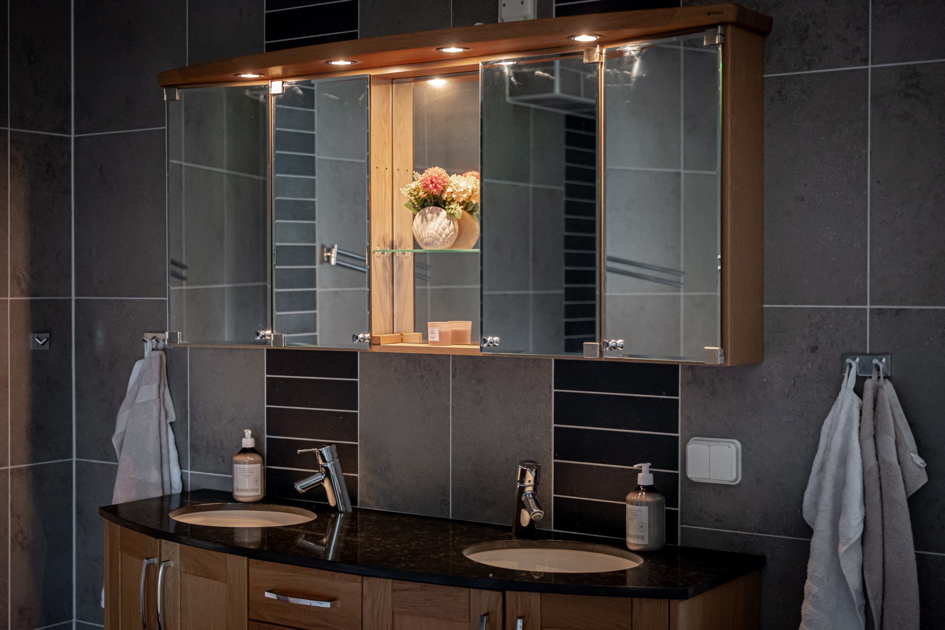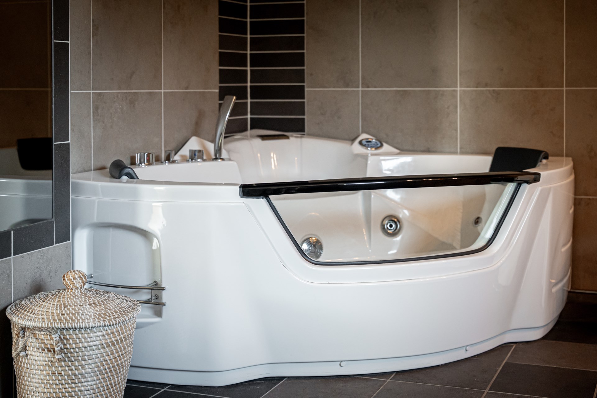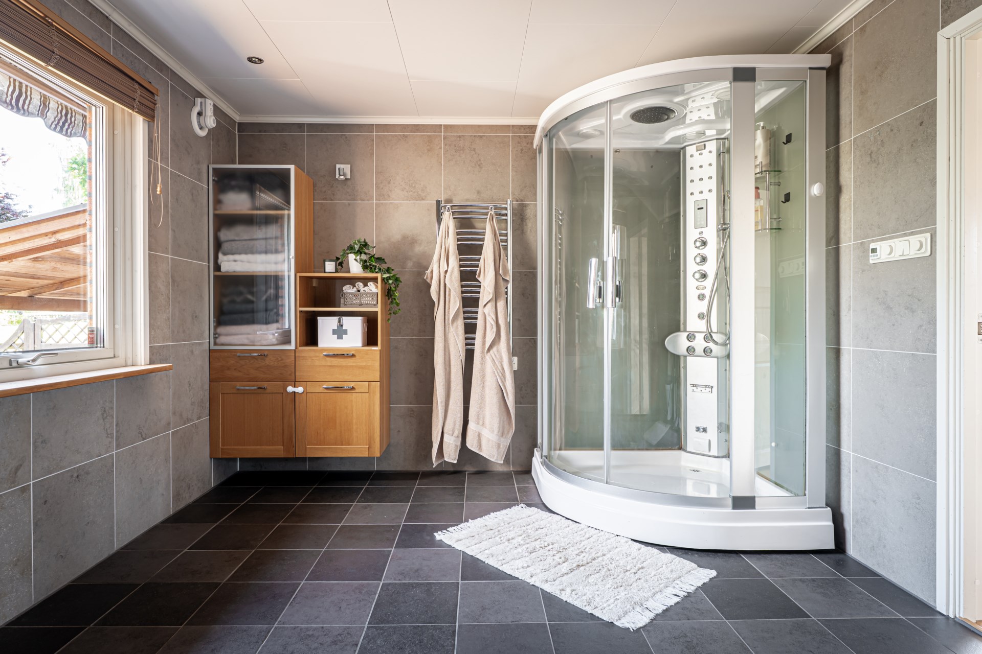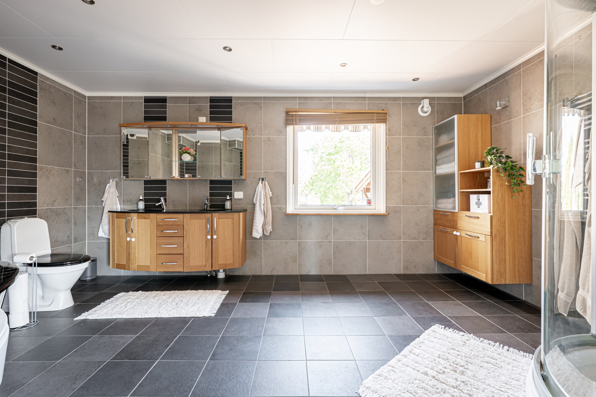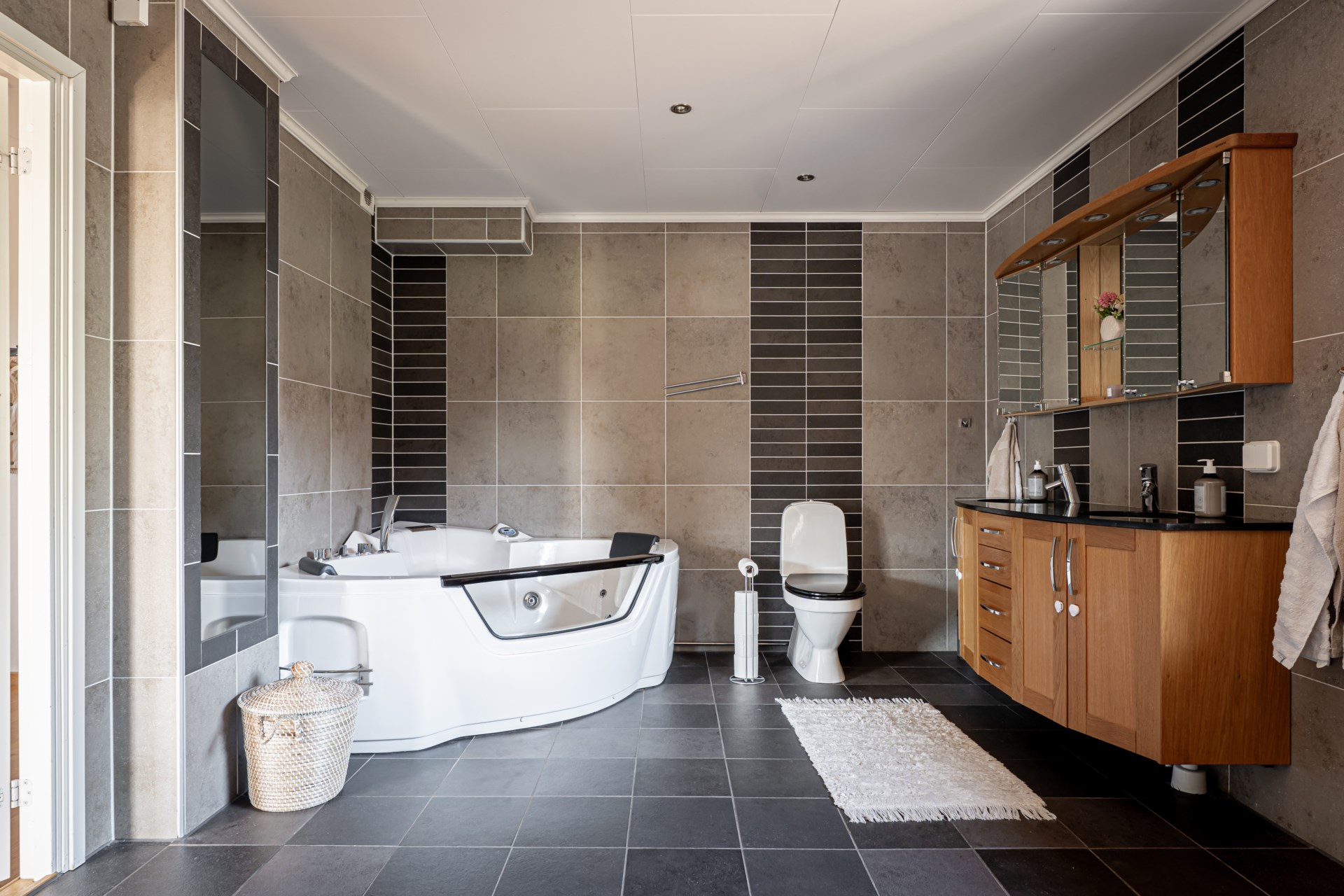 - Badrum: På entréplan har ni ett stort och lyxigt badrum med kaklade väggar och klinkergolv. I badrummet har ni toalett, kommod, hörnbadkar och duschkabin.