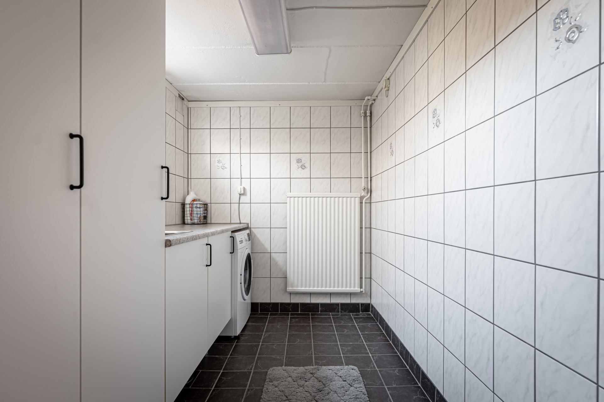 - Tvättstuga: I källaren finner ni tvättstugan med klinker på golvet och kaklade väggar. Här finns en tvättmaskin och tvättho.