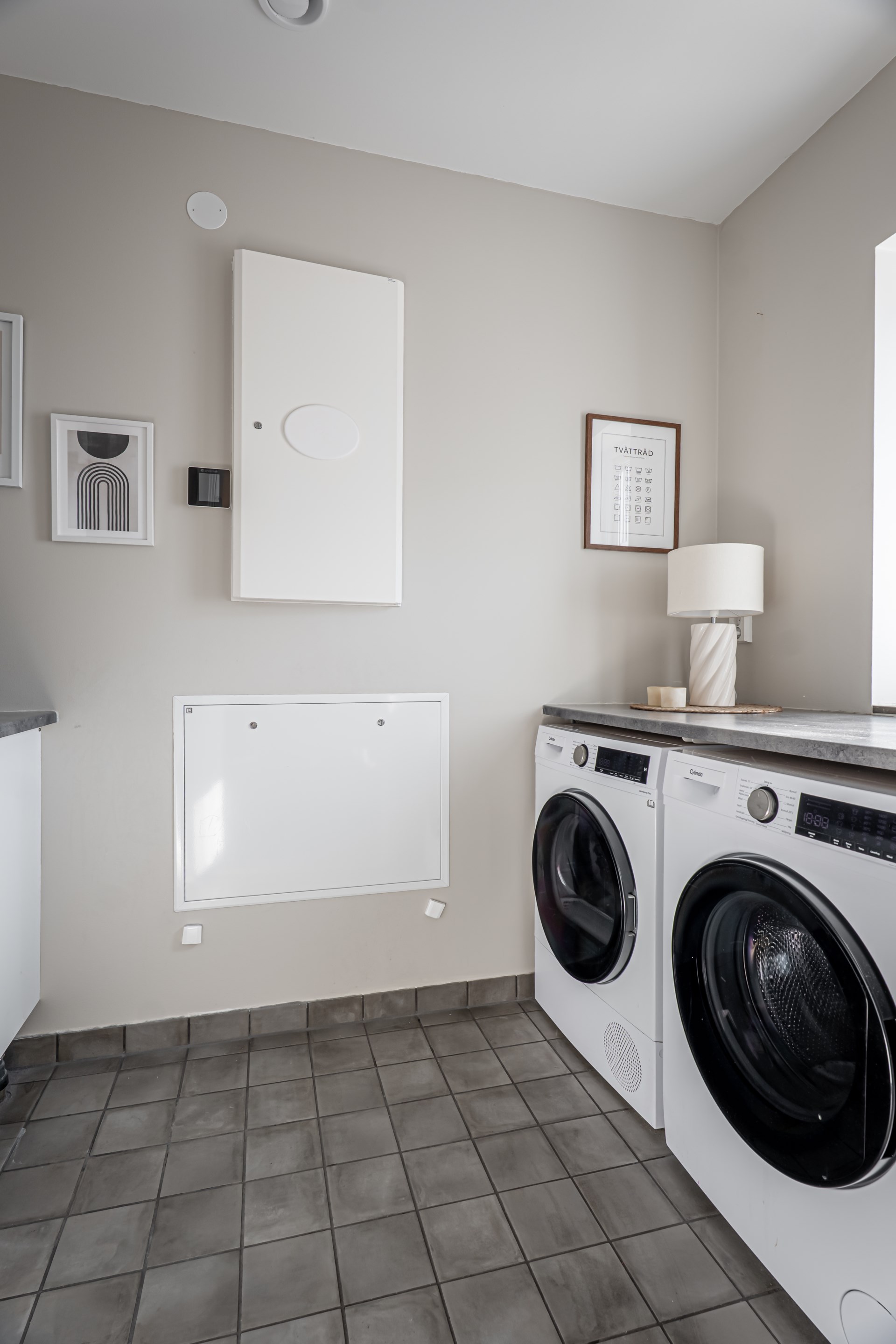 - Tvättstuga: Tvättstuga med klinker på golvet och målade väggar. I tvättstugan har ni tvättmaskin och torktumlare praktiskt placerade under en bänkyta.