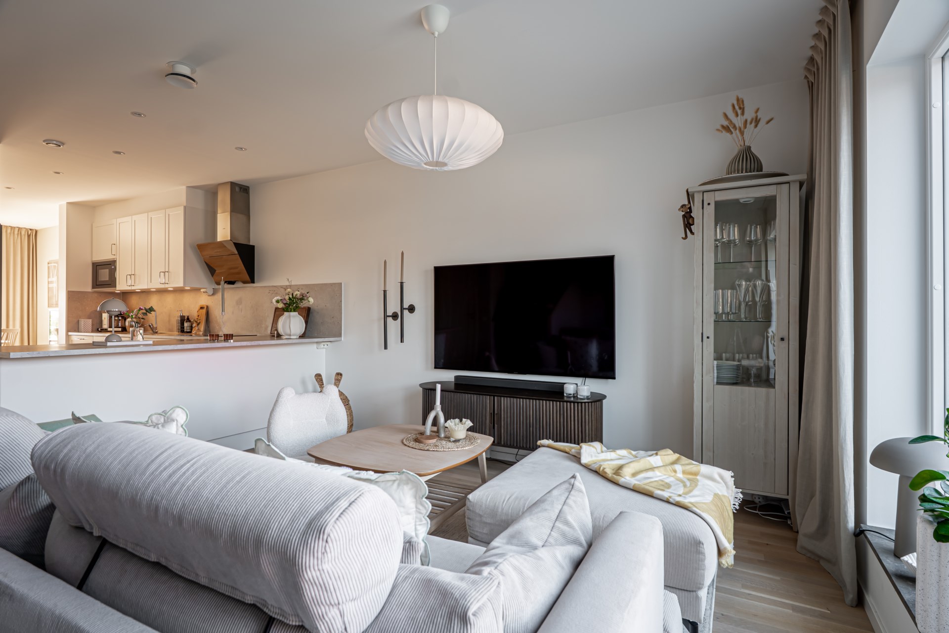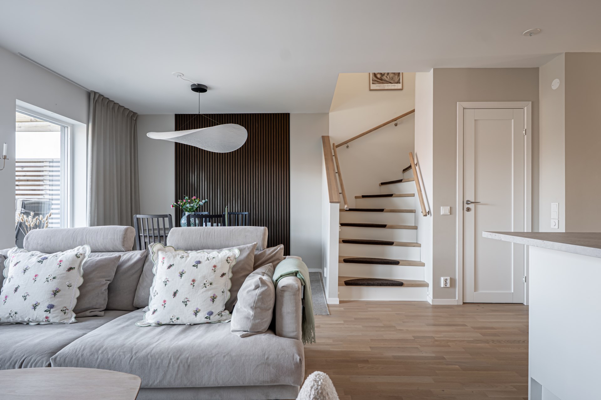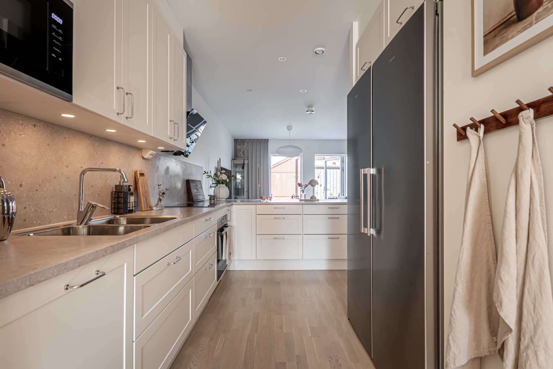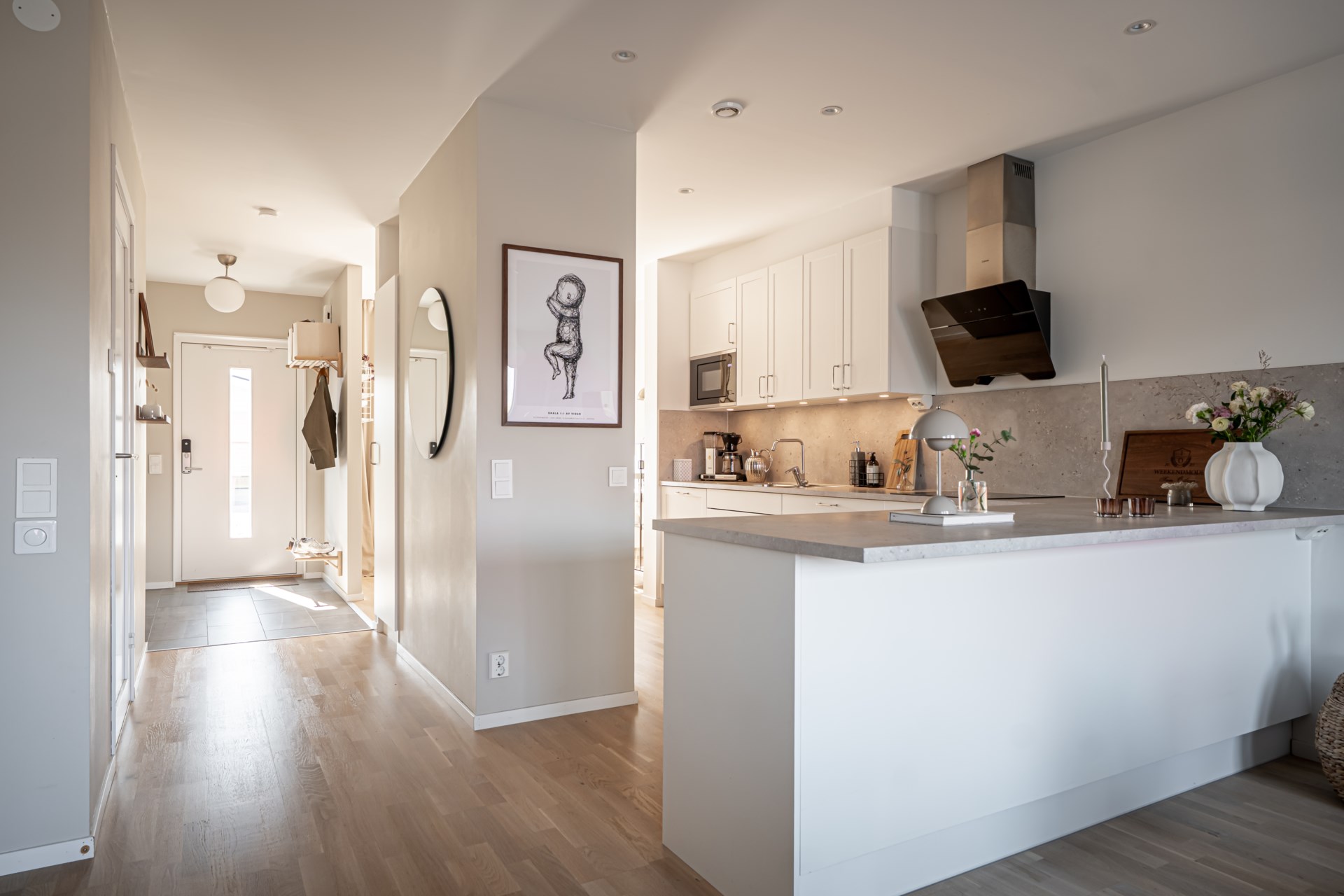 Från hallen har ni en tydlig och genomtänkt planlösning där tvättstuga och badrum ligger bekvämt placerade till höger, medan köket öppnar upp sig till vänster. Vidare leds ni in till det ljusa och inbjudande vardagsrummet där stora fönsterpartier vetter mot trädgården och fyller rummet med ett härligt ljus. Här finns gott om plats för både soffgrupp och matbord, vilket gör rummet till hemmets självklara samlingspunkt för både vardag och umgänge. Både i köket och vardagsrummet finns inbyggda spotlights i fönstren som skapar en extra stämningsfull belysning.