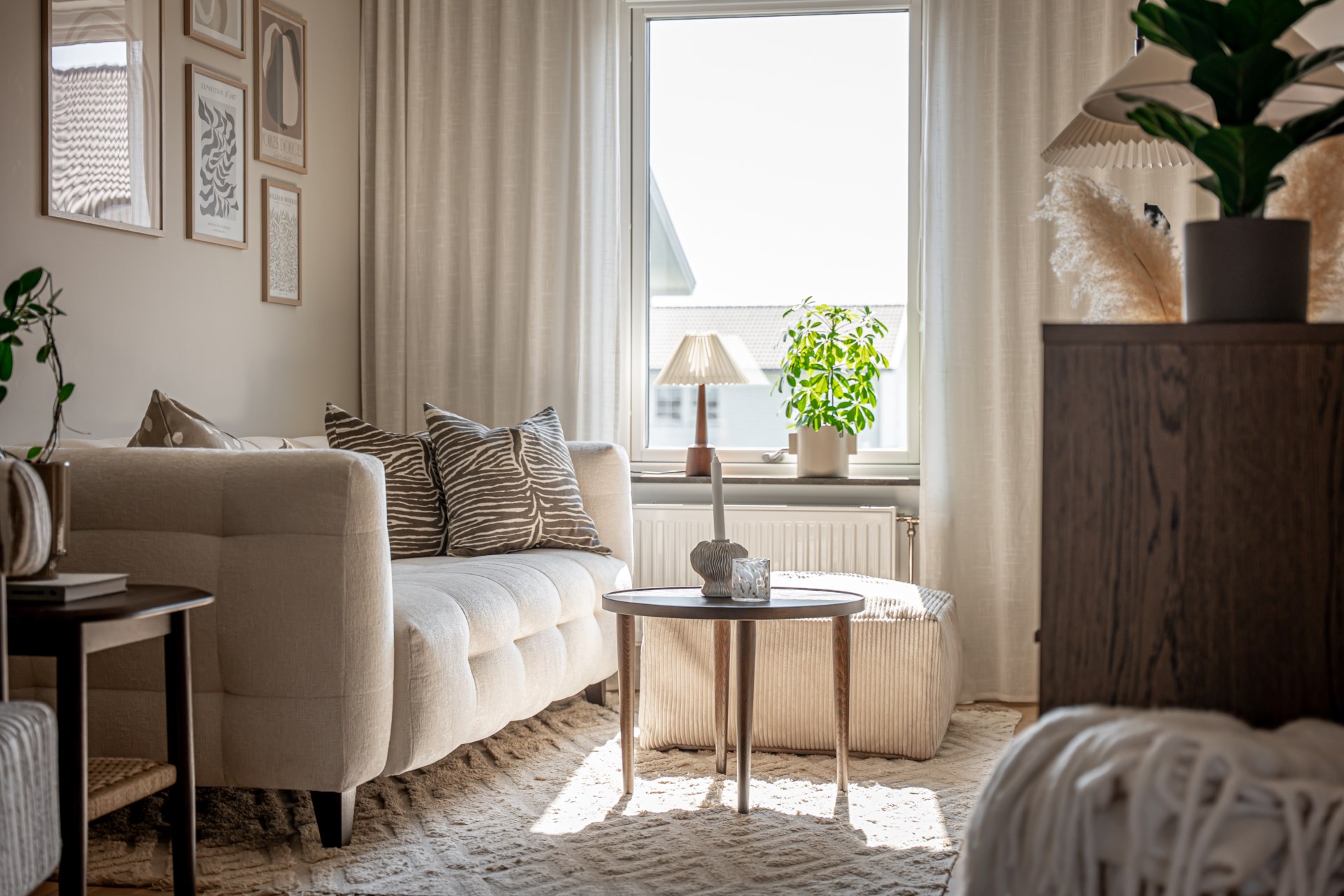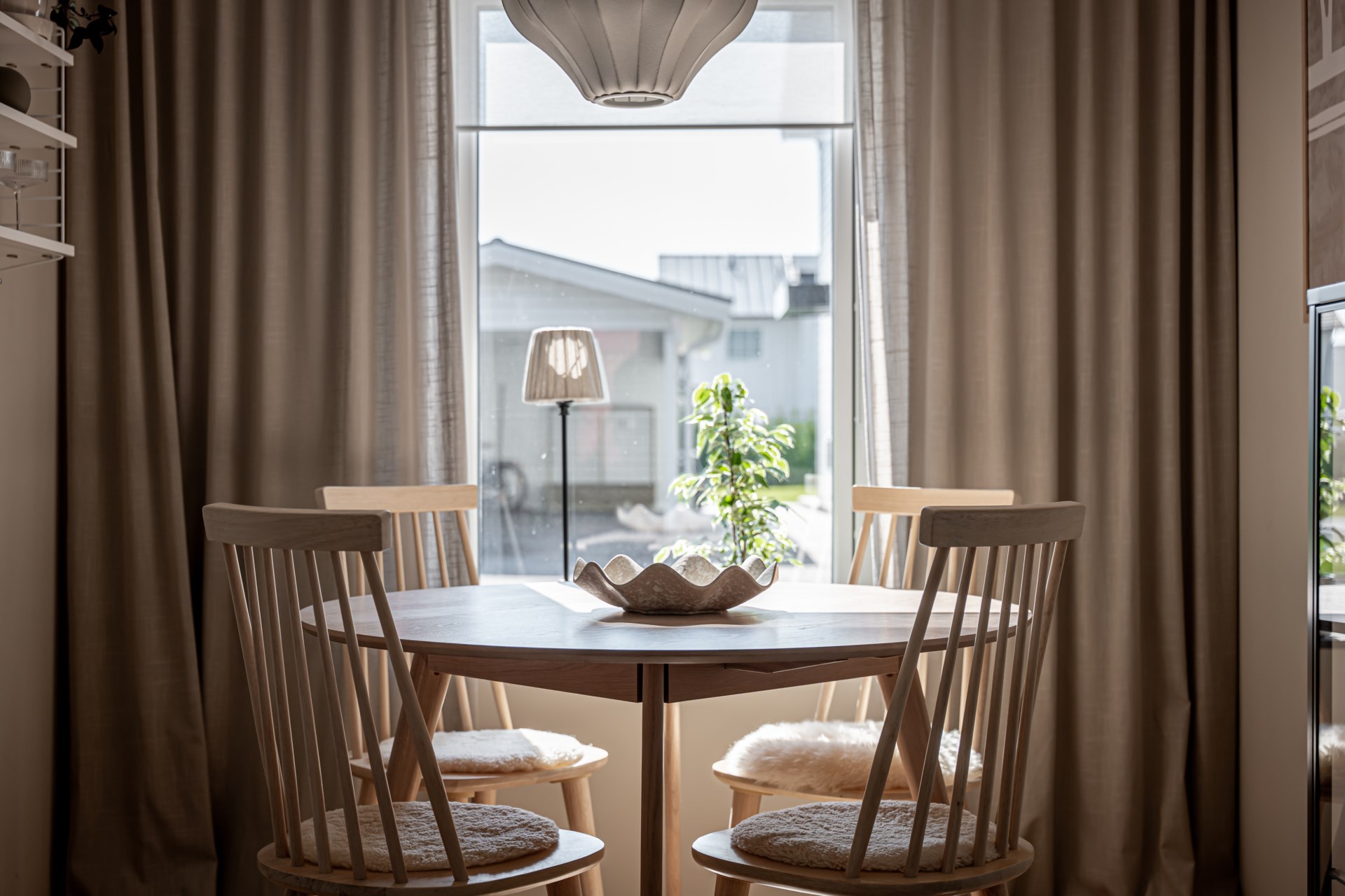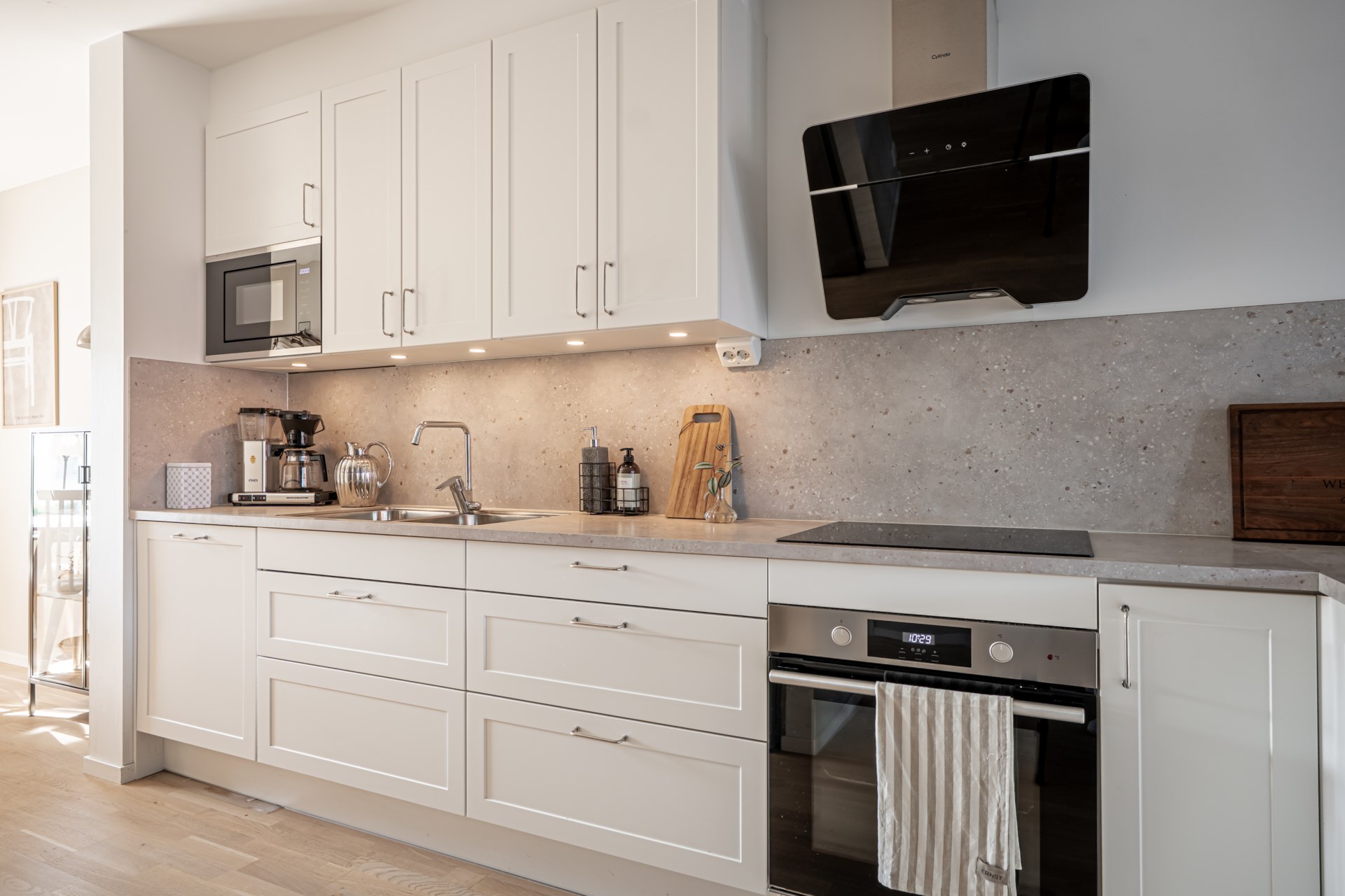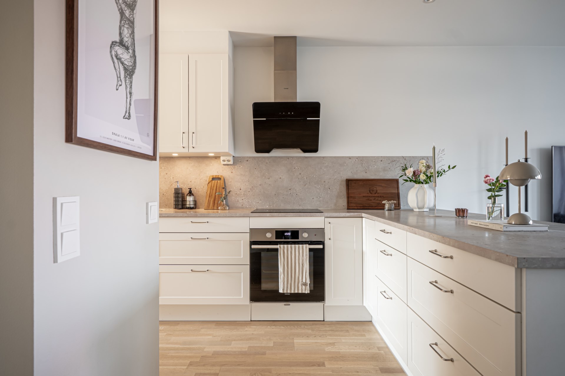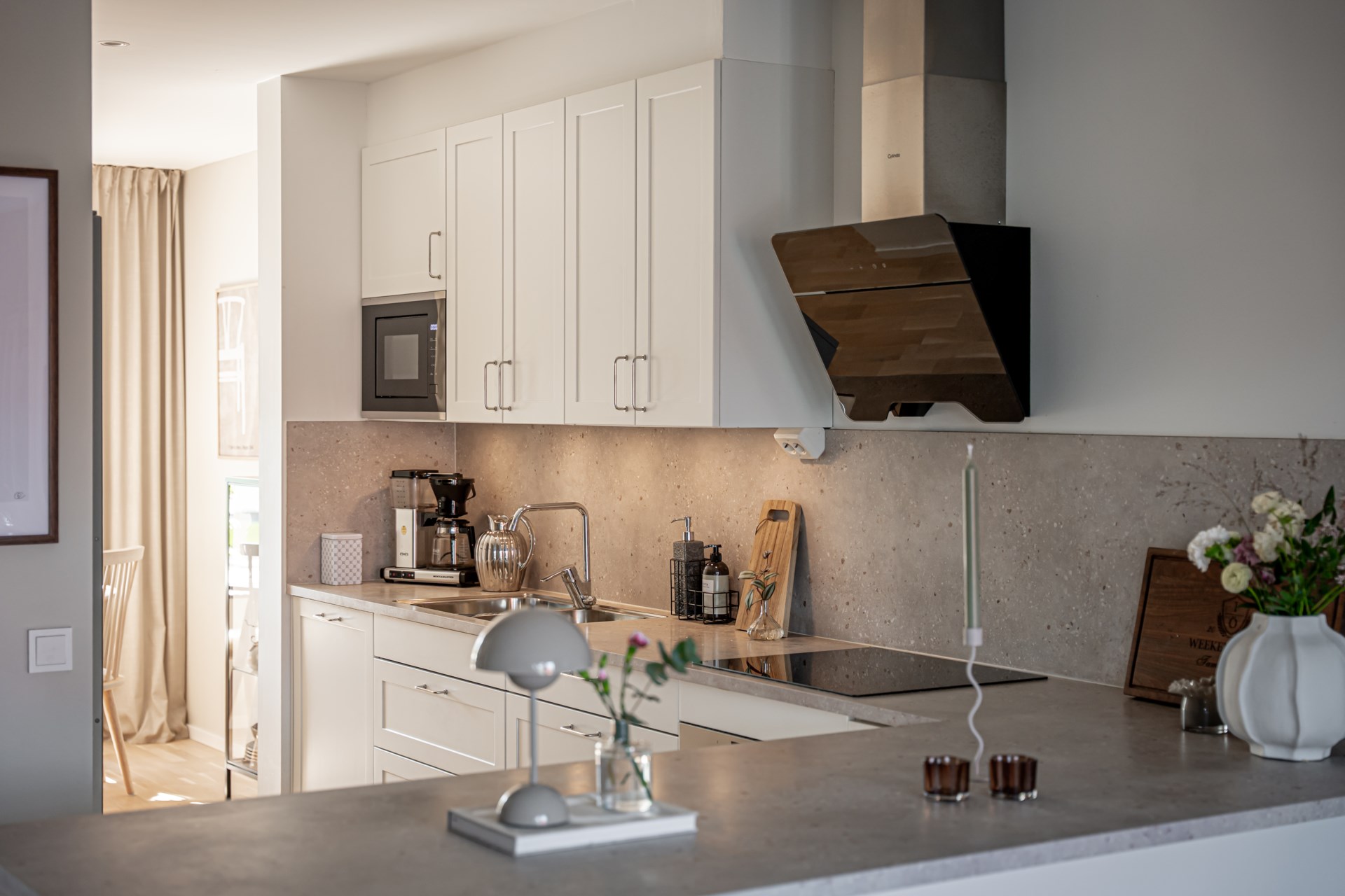 Från hallen har ni en tydlig och genomtänkt planlösning där tvättstuga och badrum ligger bekvämt placerade till höger, medan köket öppnar upp sig till vänster. Vidare leds ni in till det ljusa och inbjudande vardagsrummet där stora fönsterpartier vetter mot trädgården och fyller rummet med ett härligt ljus. Här finns gott om plats för både soffgrupp och matbord, vilket gör rummet till hemmets självklara samlingspunkt för både vardag och umgänge. Både i köket och vardagsrummet finns inbyggda spotlights i fönstren som skapar en extra stämningsfull belysning.