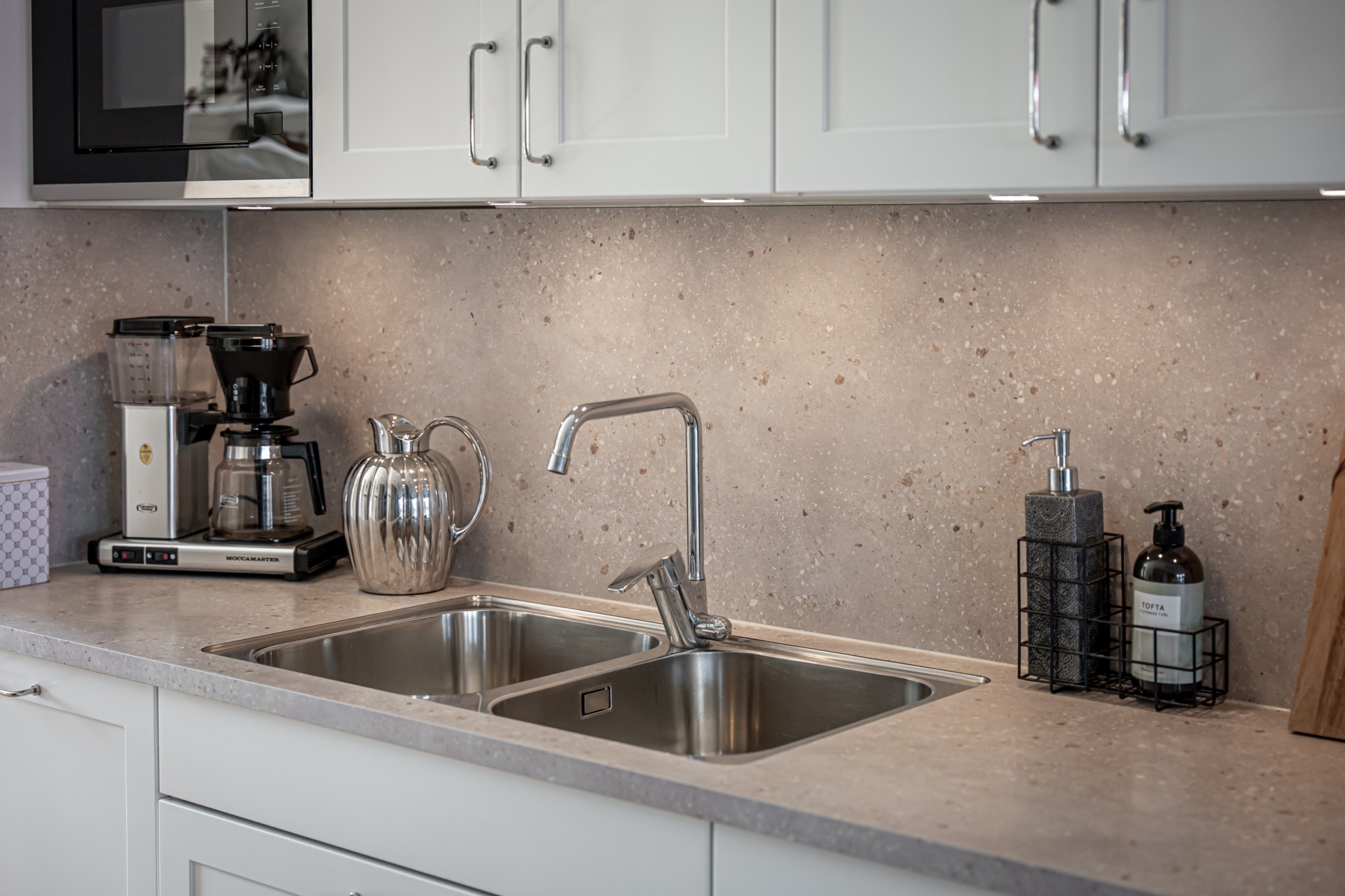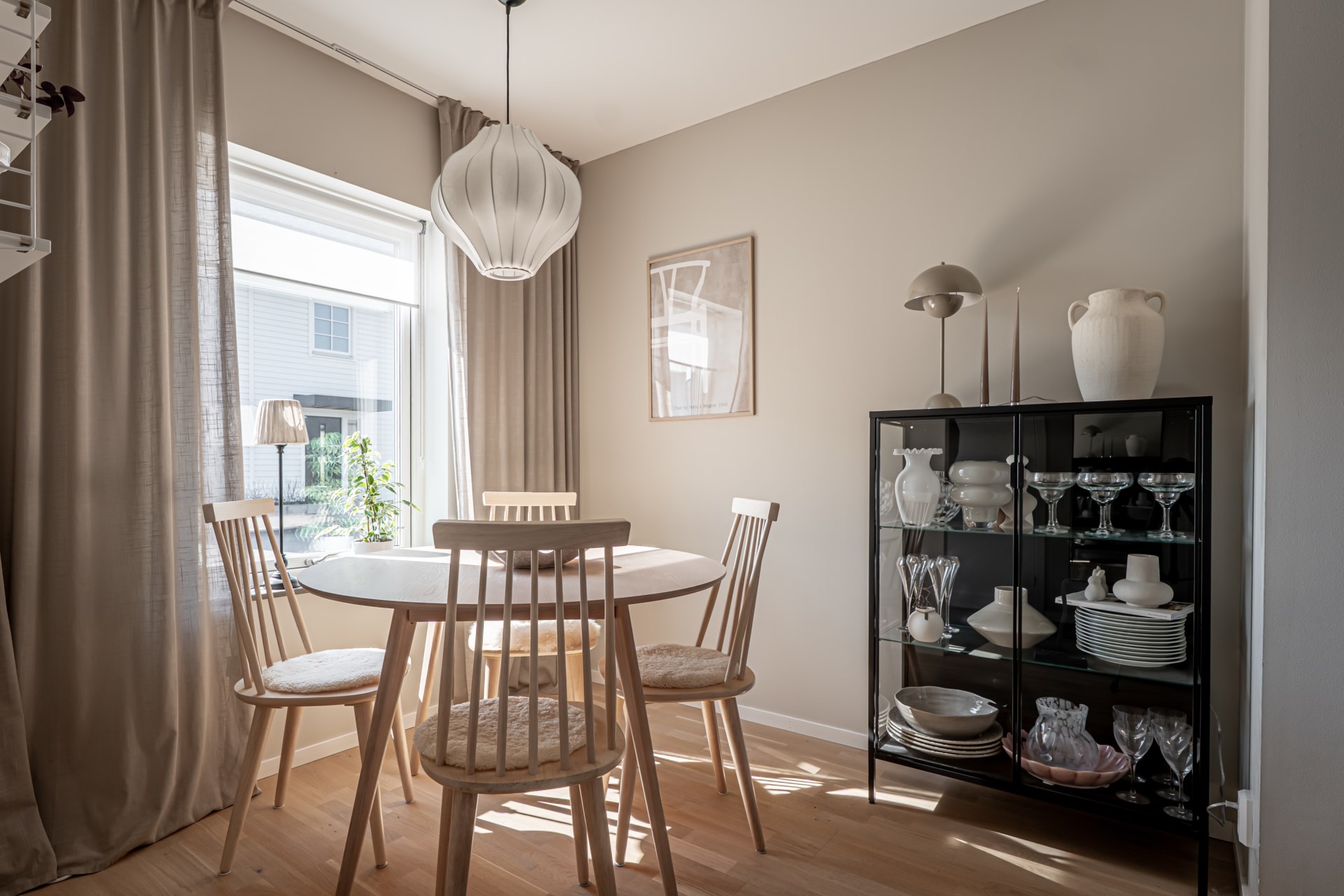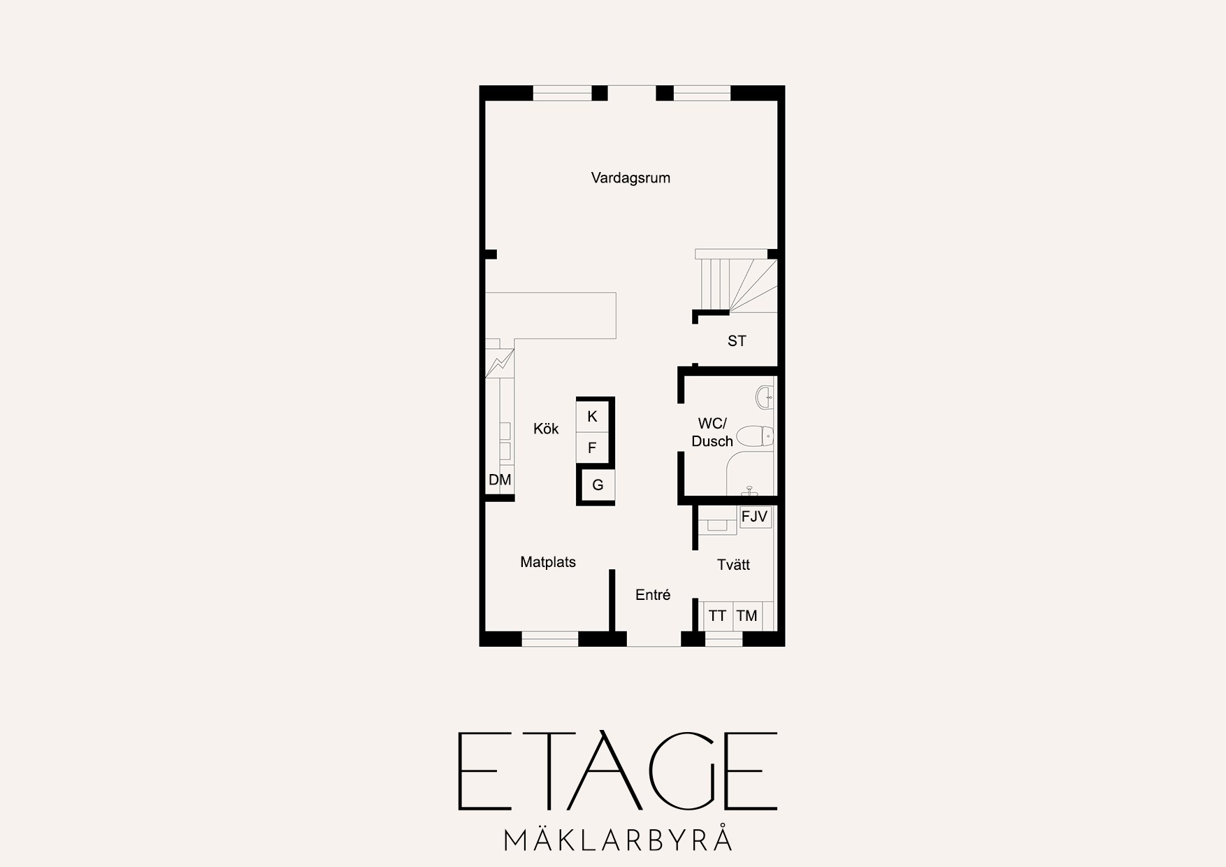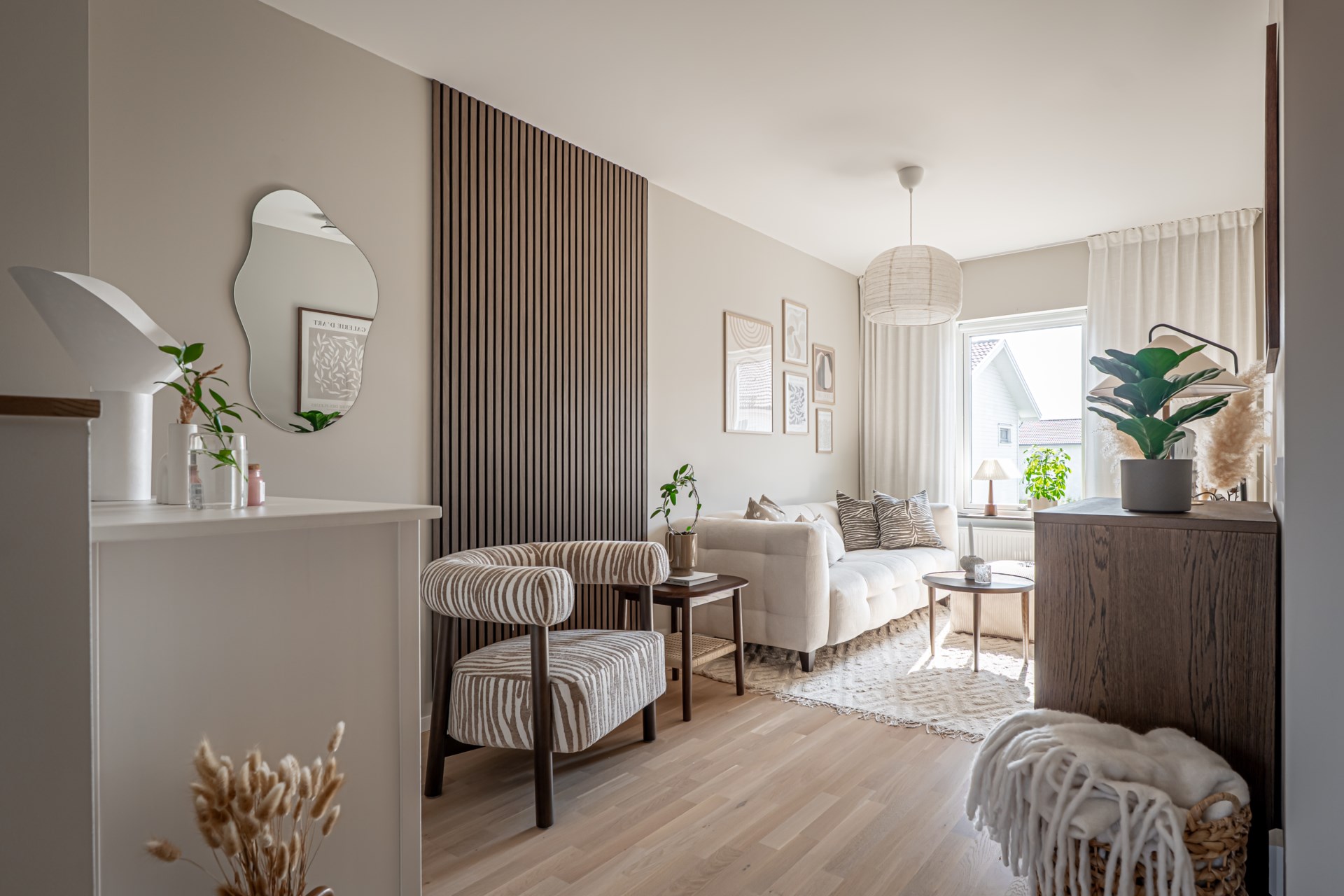 Från hallen har ni en tydlig och genomtänkt planlösning där tvättstuga och badrum ligger bekvämt placerade till höger, medan köket öppnar upp sig till vänster. Vidare leds ni in till det ljusa och inbjudande vardagsrummet där stora fönsterpartier vetter mot trädgården och fyller rummet med ett härligt ljus. Här finns gott om plats för både soffgrupp och matbord, vilket gör rummet till hemmets självklara samlingspunkt för både vardag och umgänge. Både i köket och vardagsrummet finns inbyggda spotlights i fönstren som skapar en extra stämningsfull belysning.