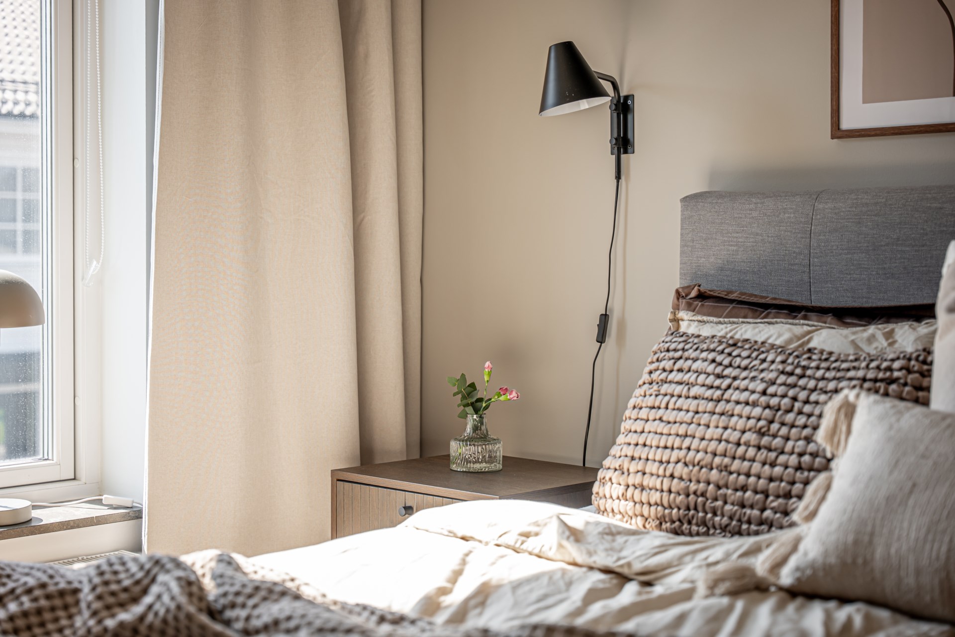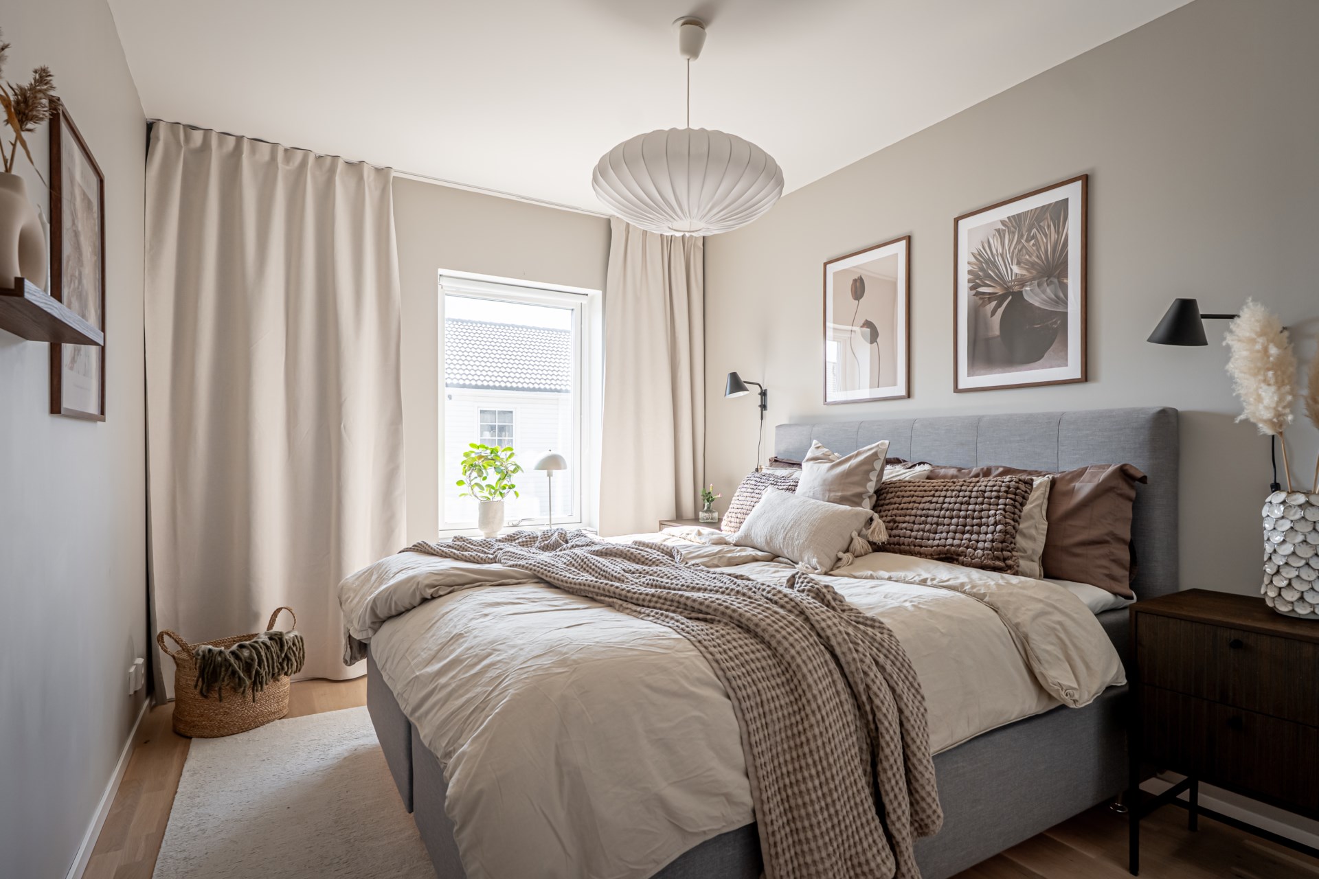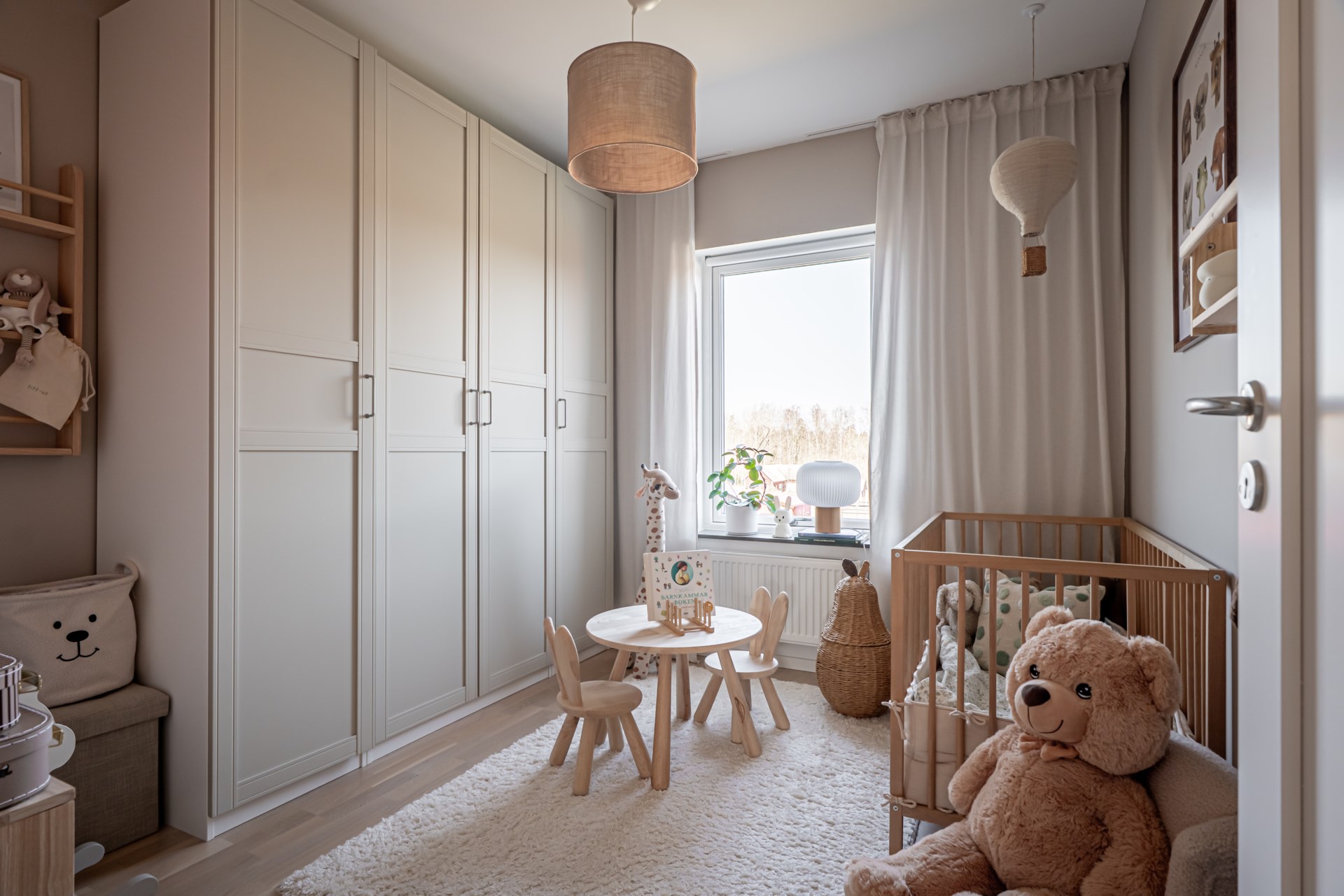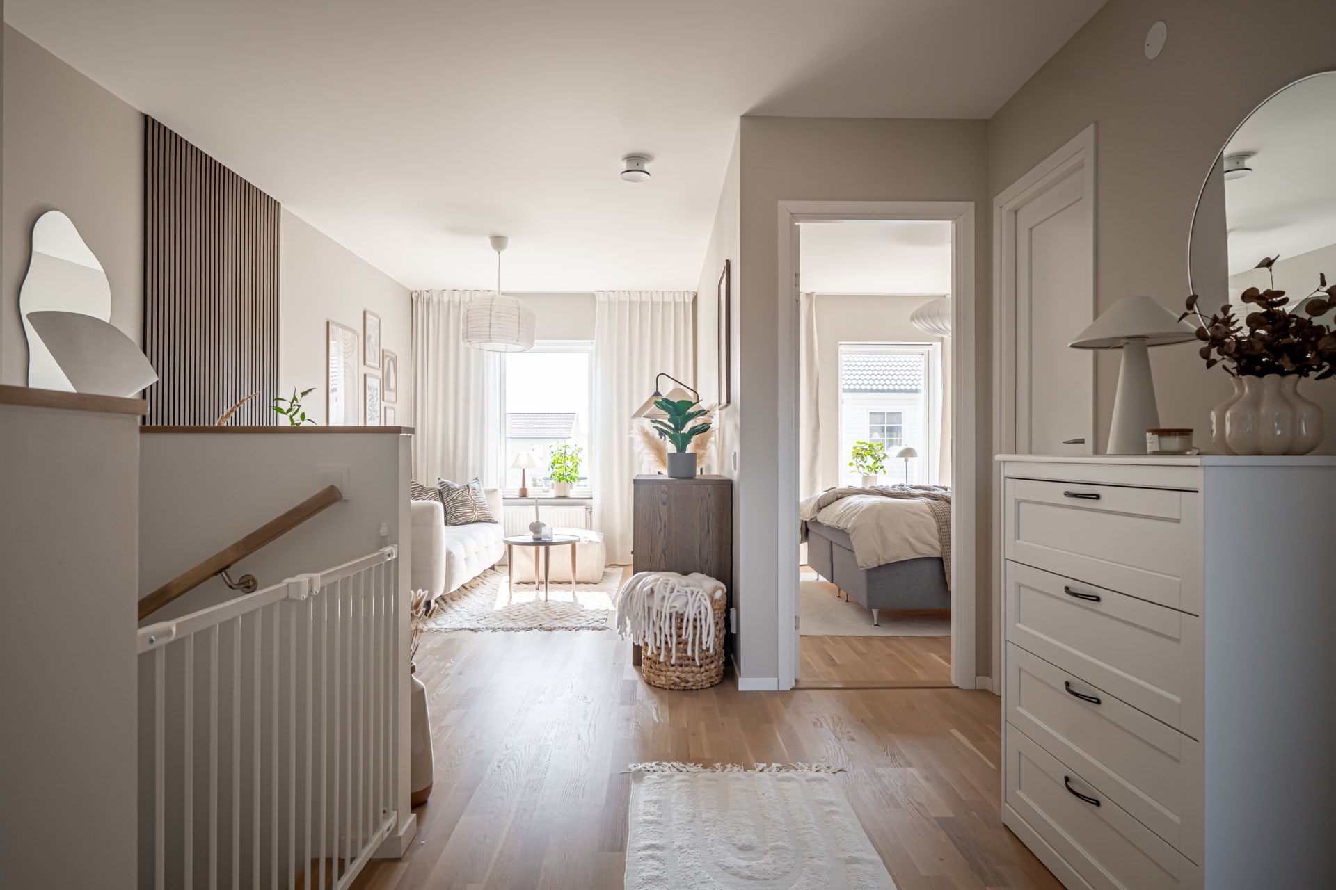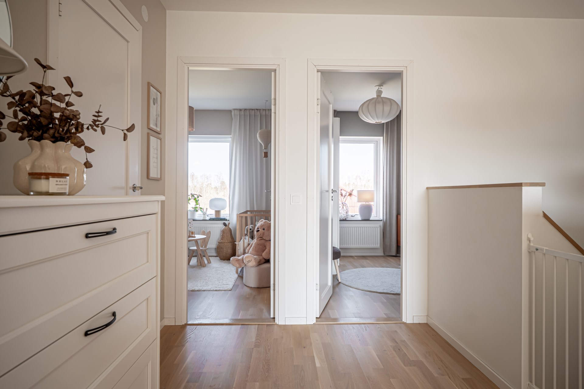 En trappa upp väntar den mer privata delen av bostaden. Här ligger tre sovrum samlade på ett trivsamt sätt. Det större sovrummet erbjuder plats för dubbelsäng och har dessutom en praktisk klädkammare. De två övriga rummen passar utmärkt som barnrum, gästrum eller hemmakontor. På övre plan finns även ett stilrent badrum samt ett mysigt allrum, perfekt för familjens filmkvällar eller som en extra yta för avkoppling. - Kök: Köket är inbjudande och modernt och är utrustat med spishäll, fläkt, ugn, inbyggd micro, integrerad diskmaskin samt kyl och frys i fullhöjd. I köket finns en matplats där det går att möblera med ett matbord med fyra stolar.
