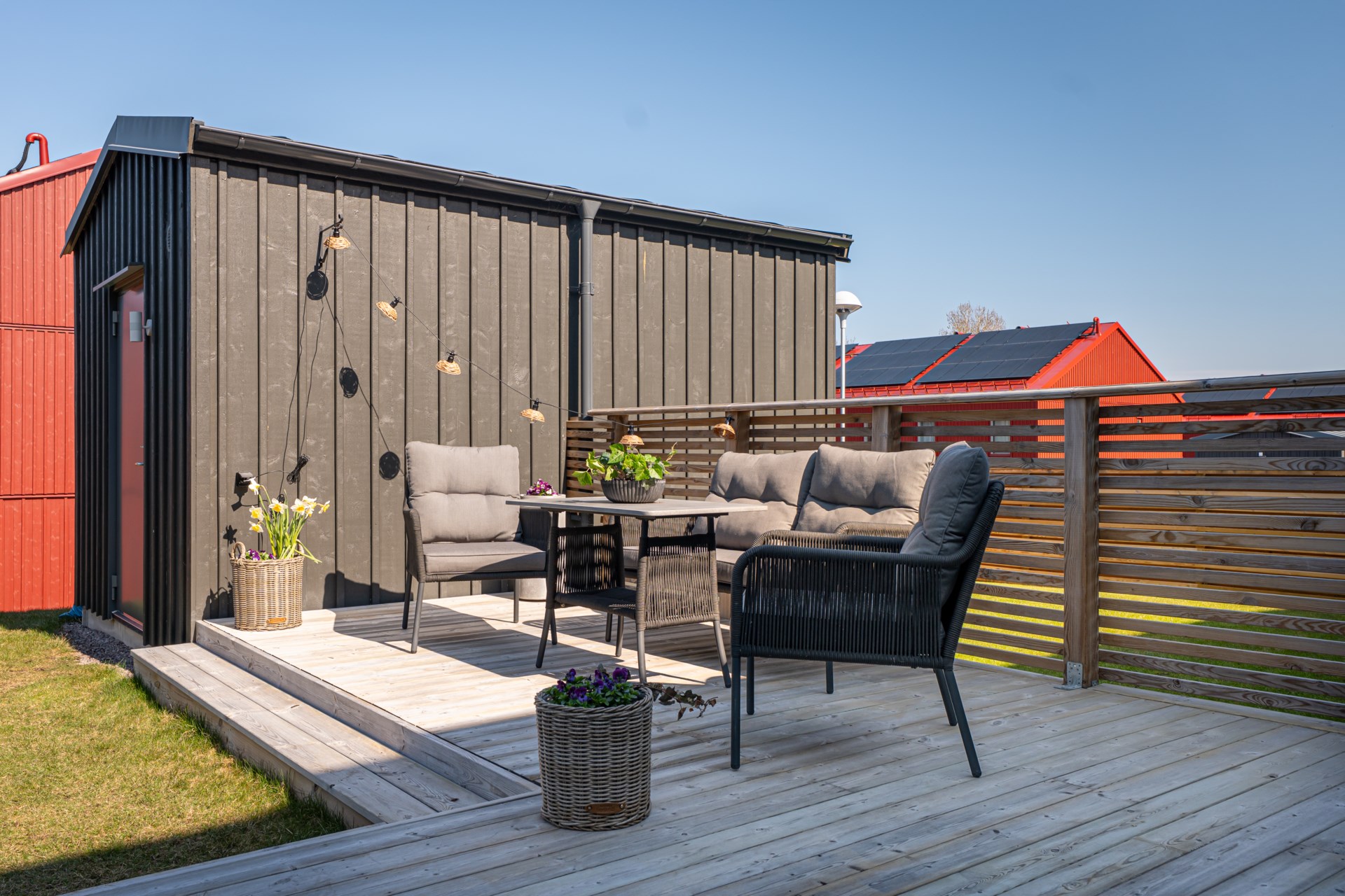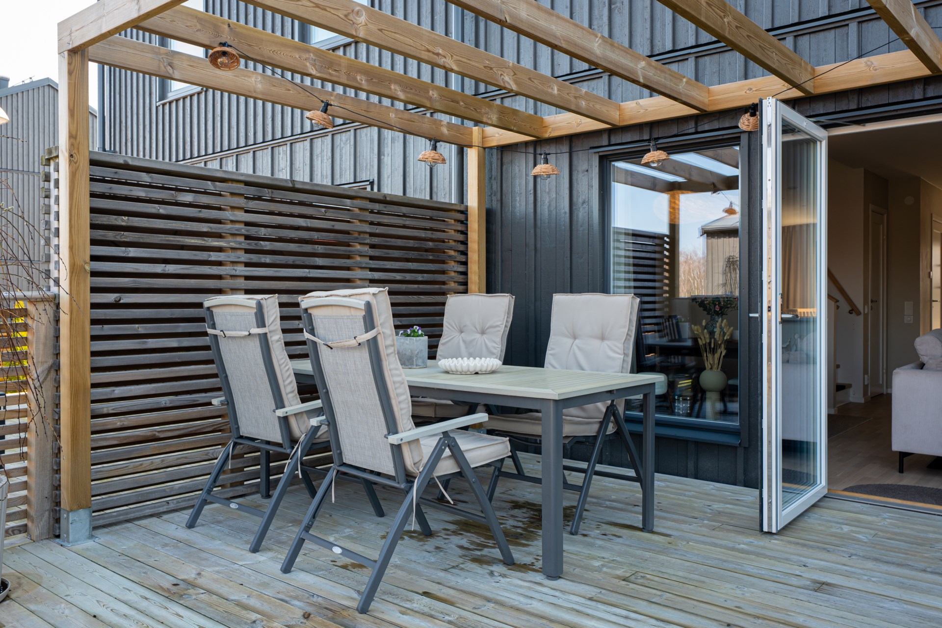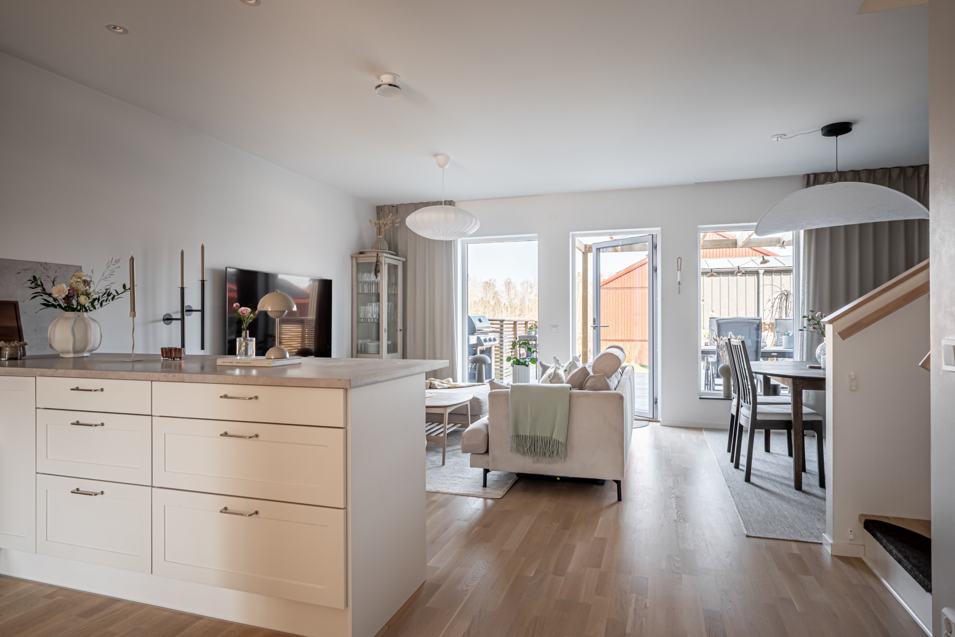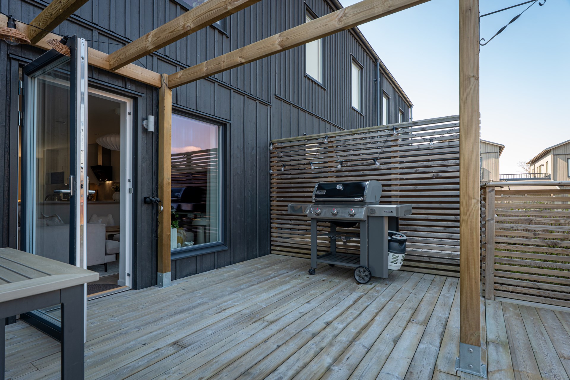 Från vardagsrummet kliver ni ut till altanen på baksidan, en perfekt plats för sommarens grillkvällar, avkoppling och stunder i solen.