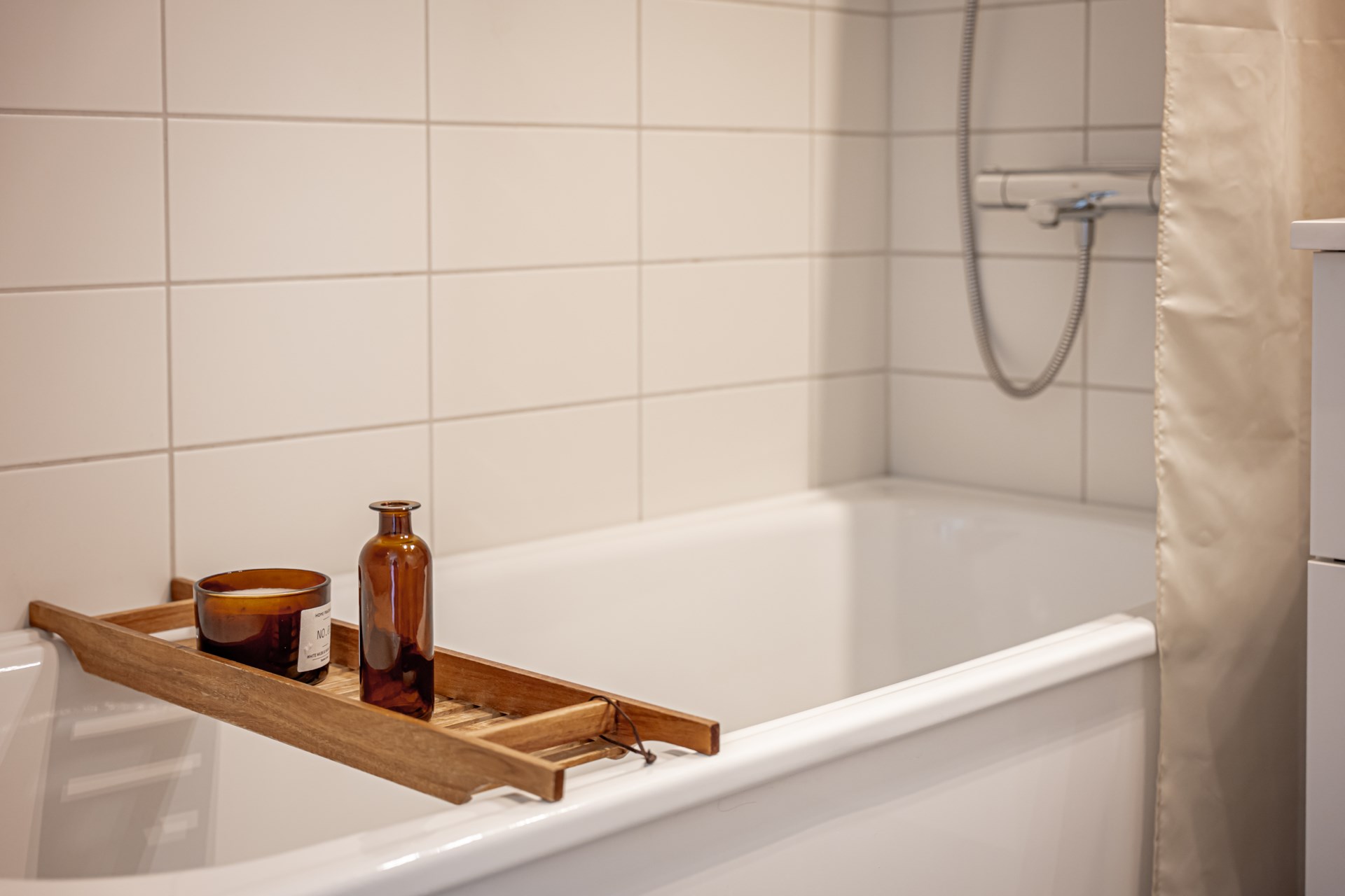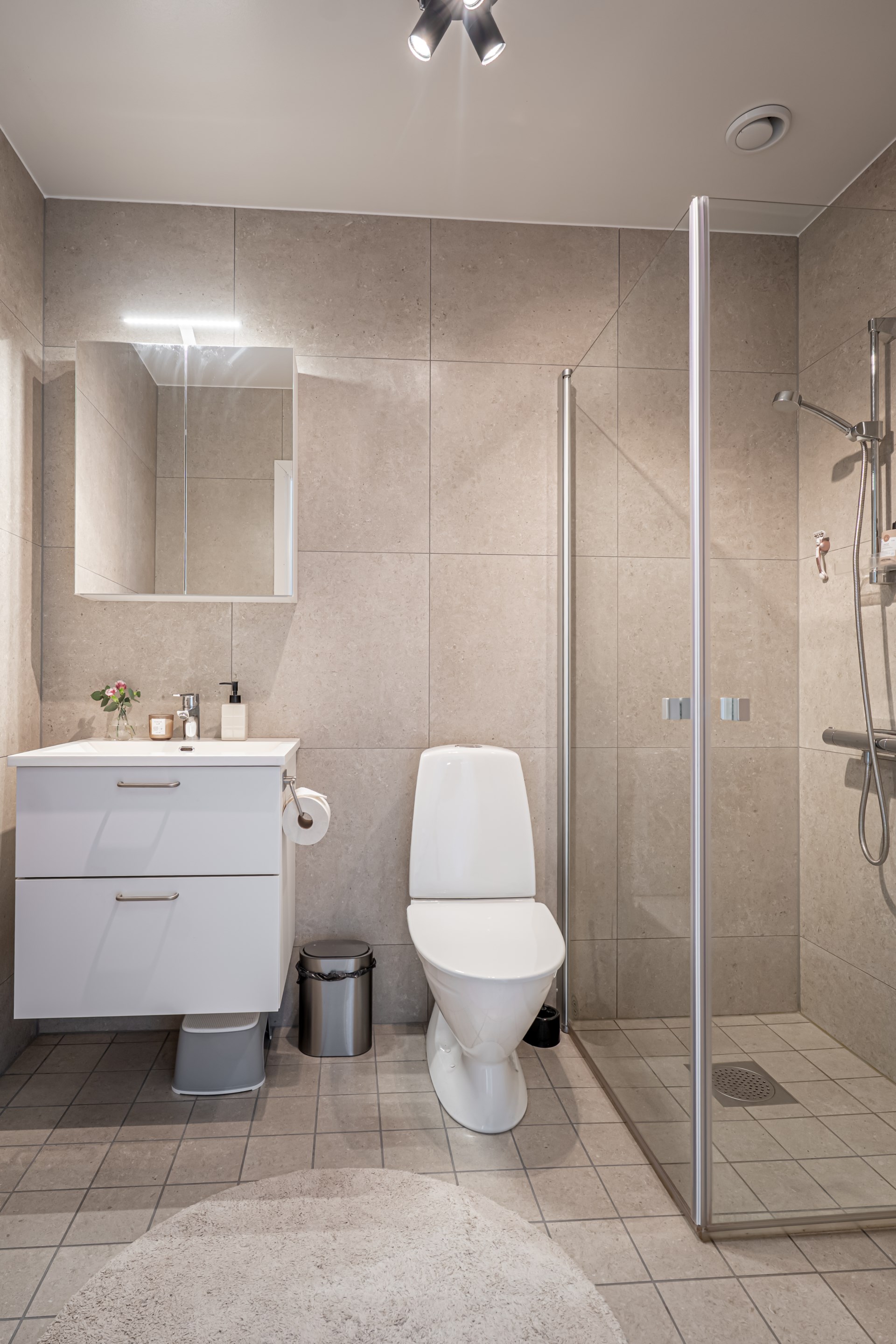 - Badrum: Badrummet på entréplan har kaklade väggar med matchande klinkergolv. I badrummet har ni kommod, spegelskåp, toalett och dusch.