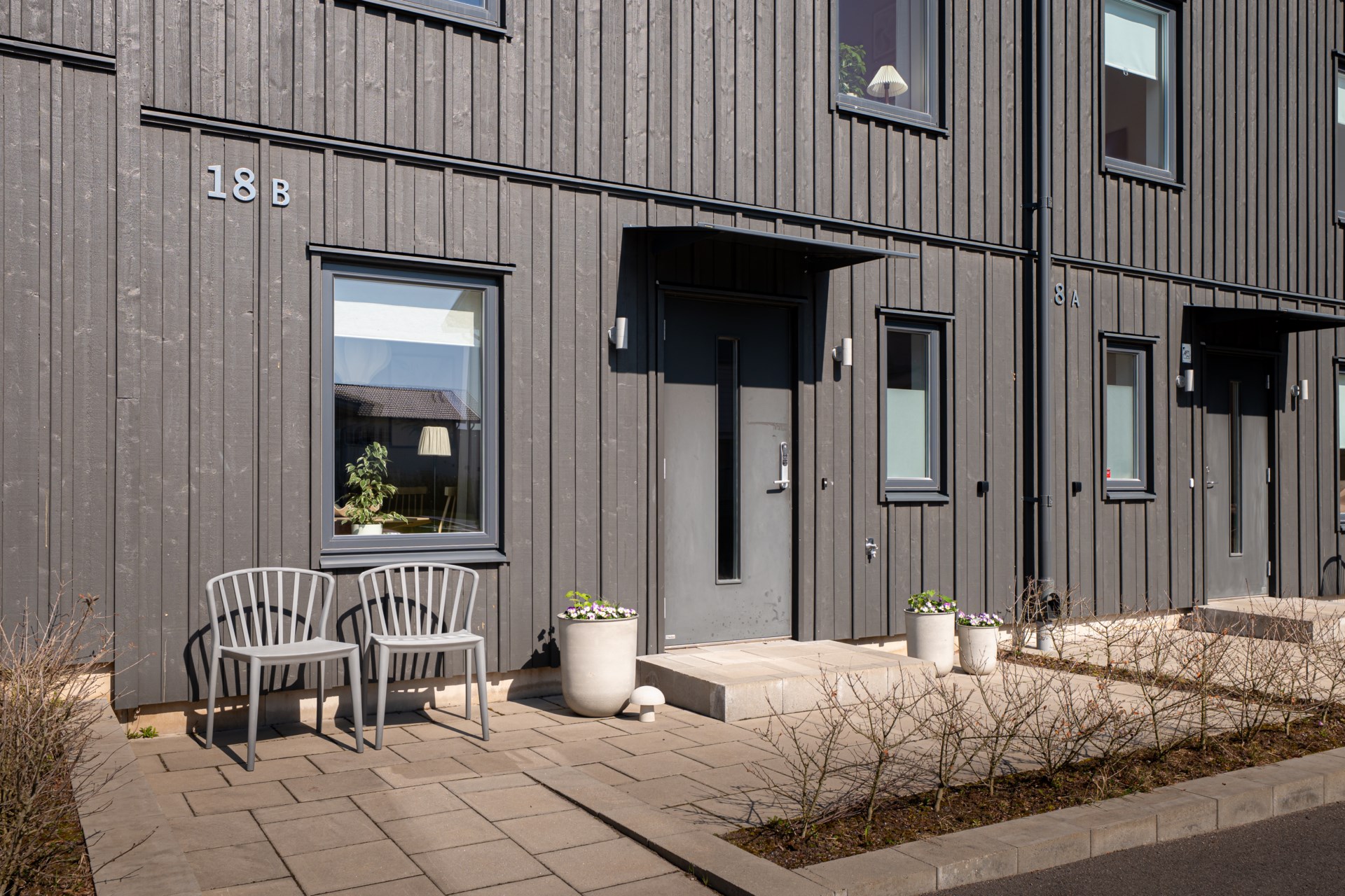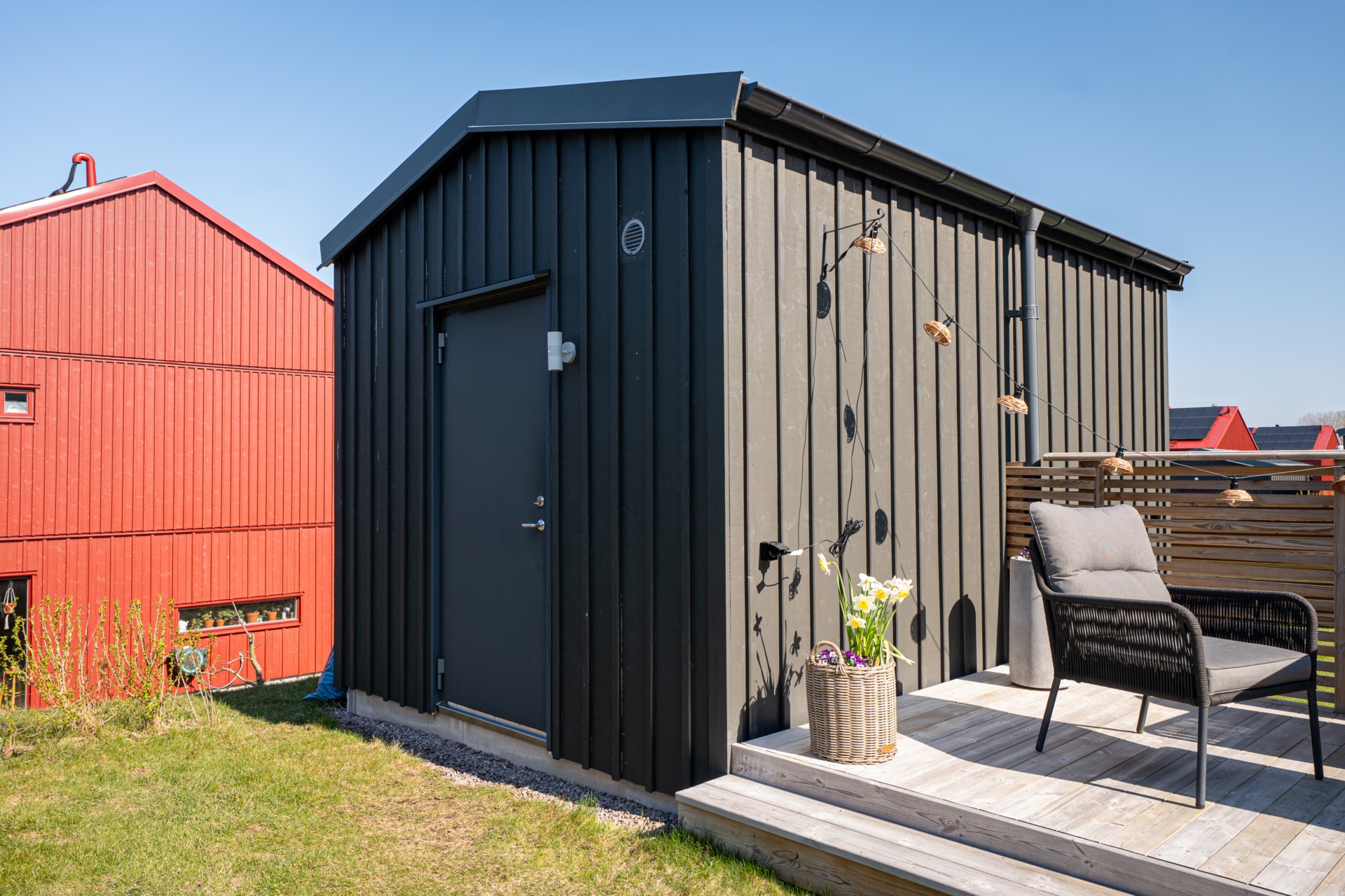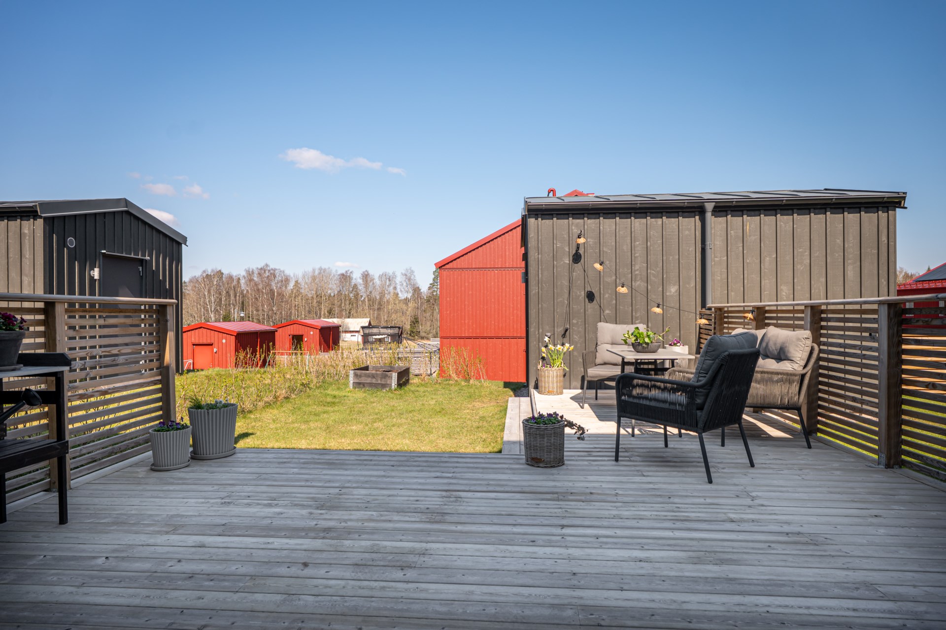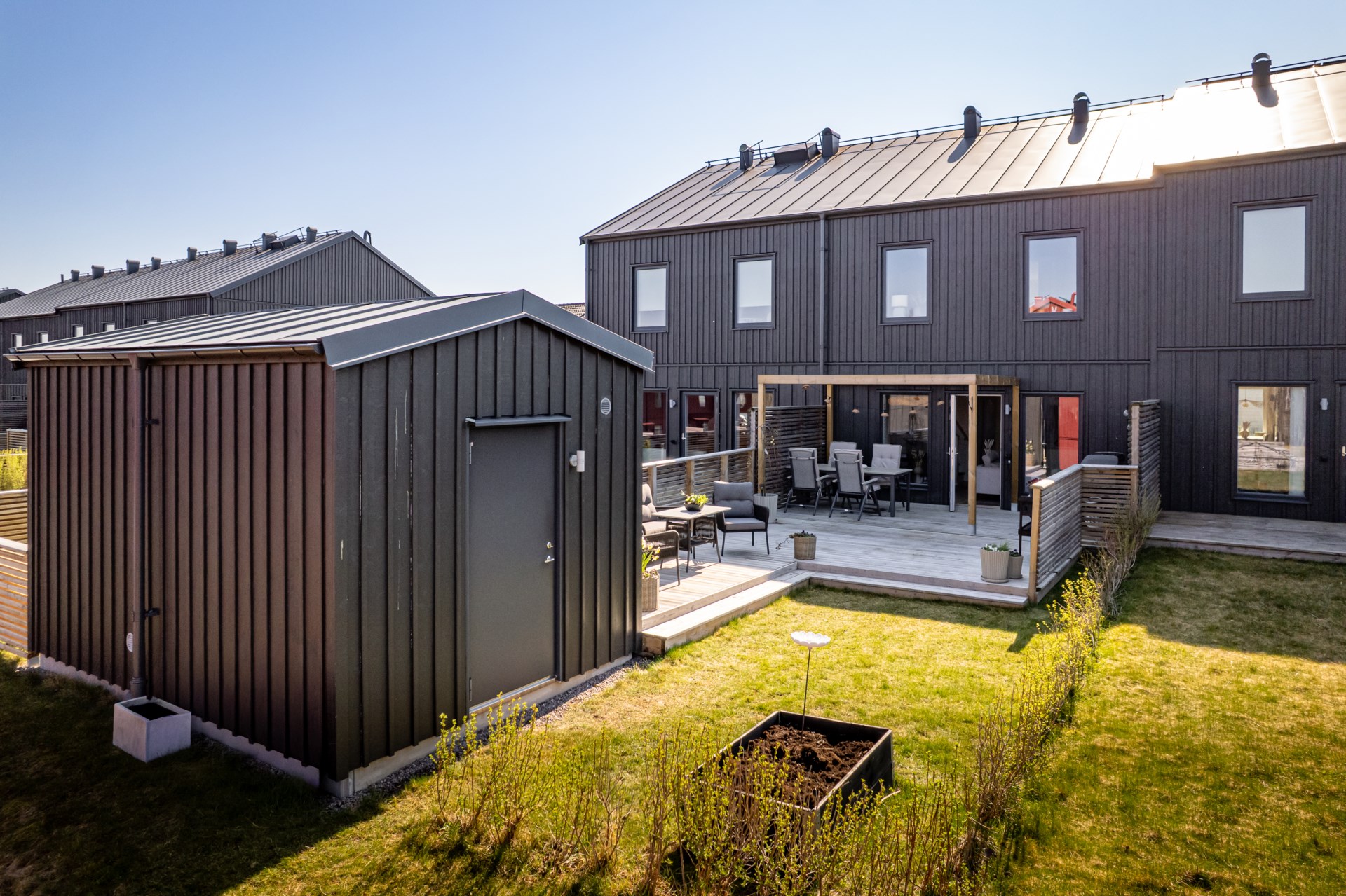 På baksidan väntar en generös uteplats med gott om utrymme för både matgrupp och sköna loungemöbler, en perfekt plats för sommarens alla måltider, avkoppling och umgänge i solen.