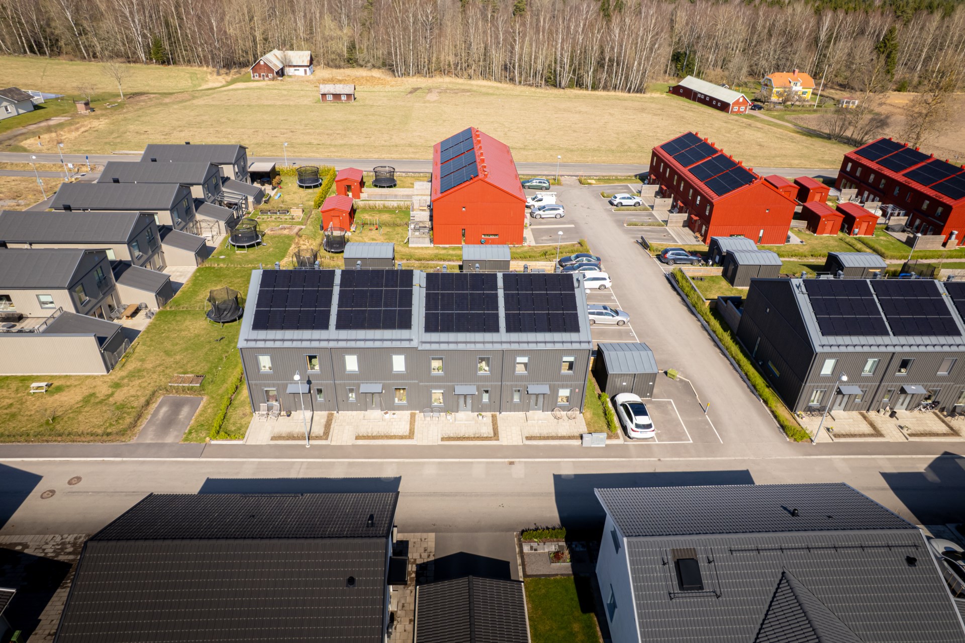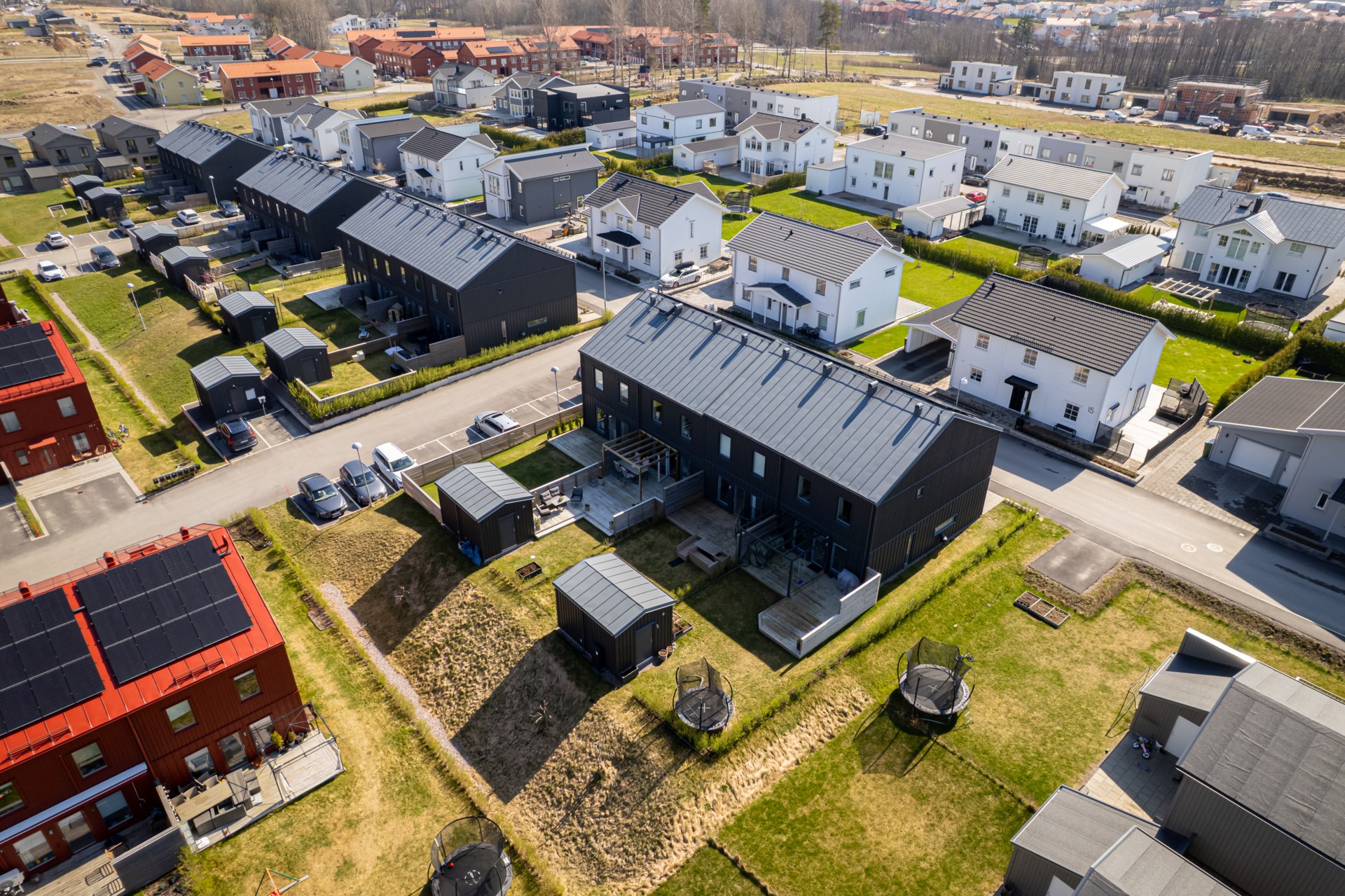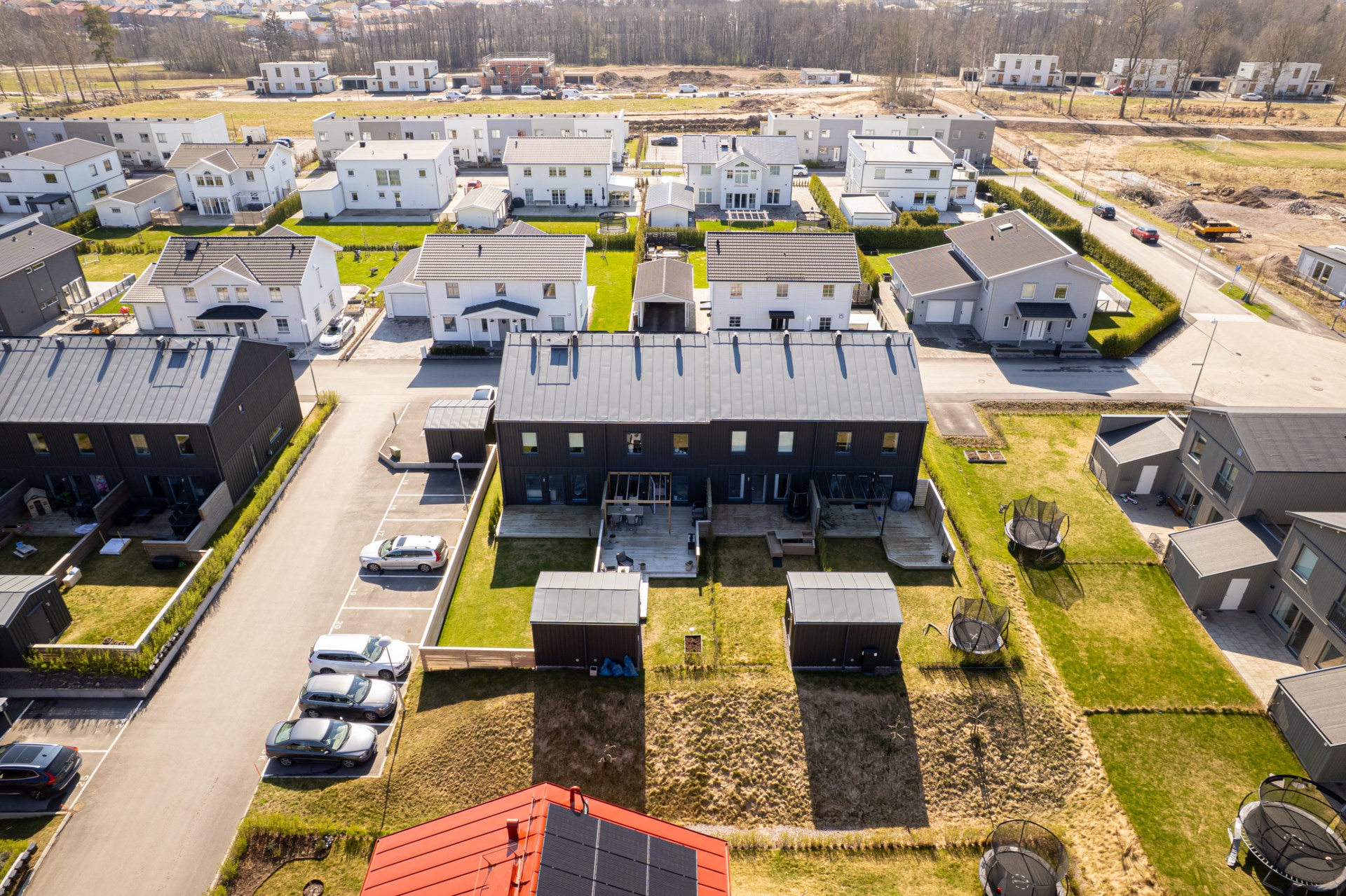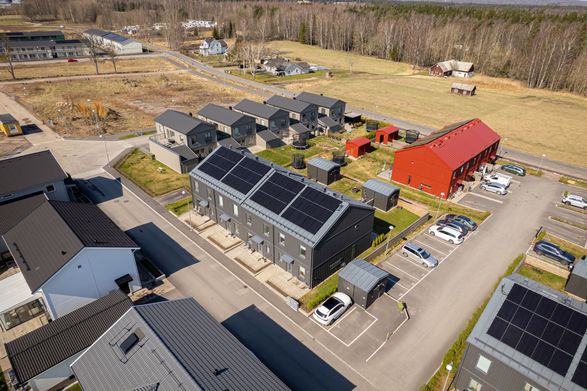 Föreningen höjde avgiften i september 2023. - Parkering: De mörka husen har en parkeringsplats var. De röda husen har två parkeringsplatser var utanför dörren.