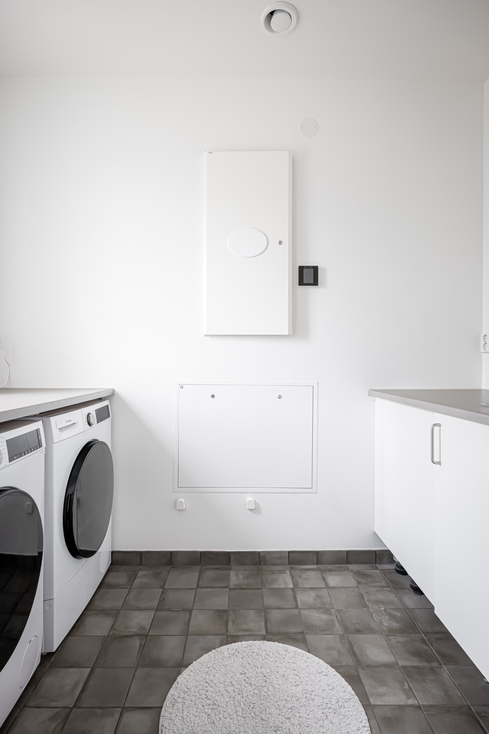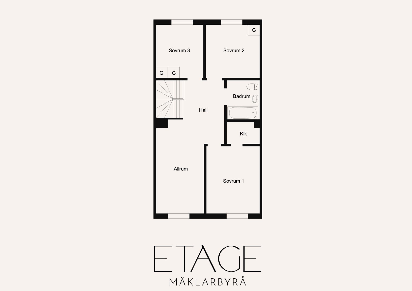 En trappa upp ligger den privata delen av huset med tre samlade sovrum. Det största rummet rymmer en dubbelsäng och har dessutom en praktisk klädkammare. De övriga sovrummen är väl tilltagna och passar utmärkt som barnrum, gästrum eller kontor. På denna våning finns även ett allrum som ger extra yta för lek, tv-hörna eller avkoppling. - Tvättstuga: Ljus tvättstuga med bra bänkyta. I tvättstugan har ni tvättmaskin, torktumlare och tvättho.
