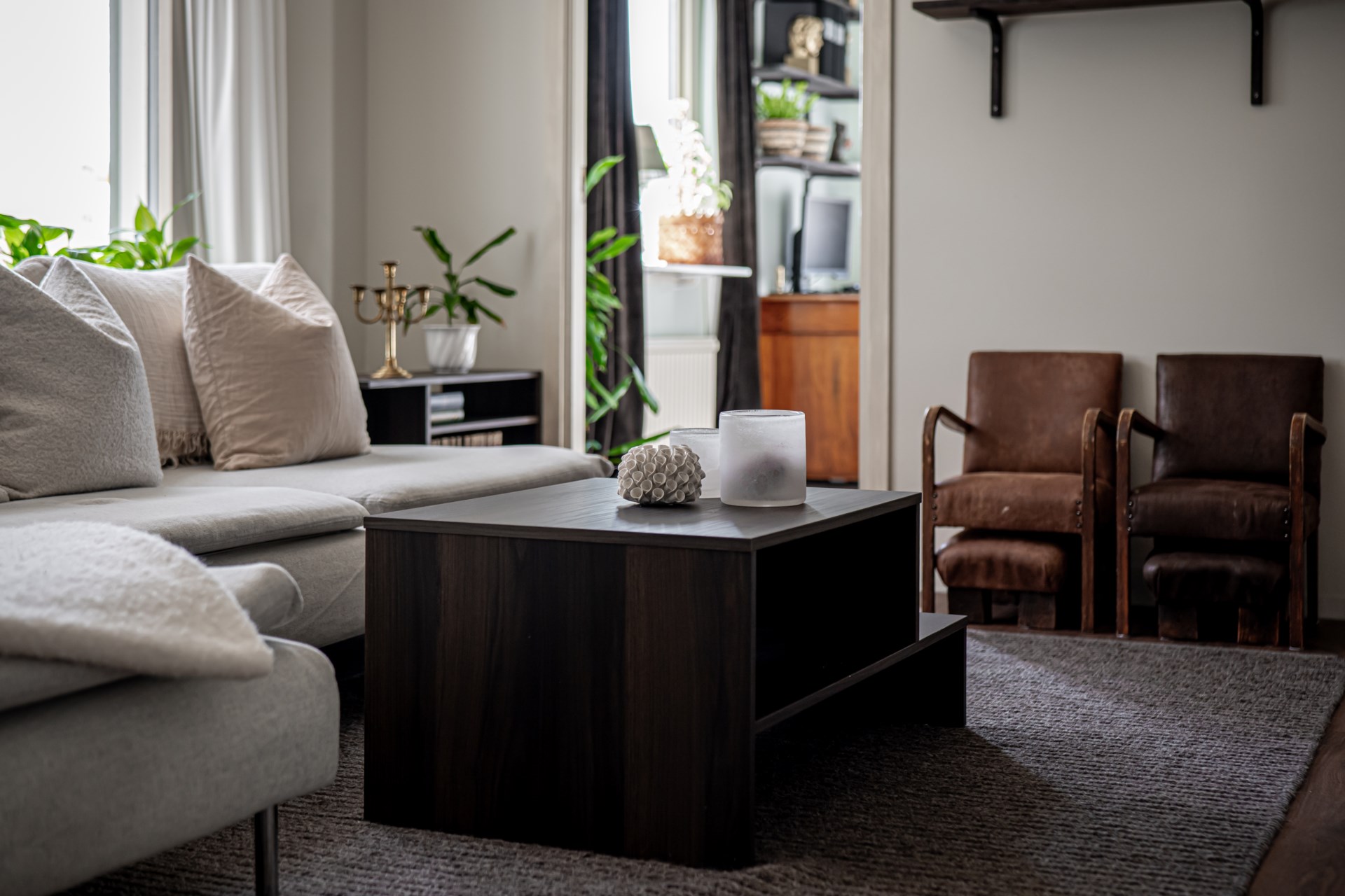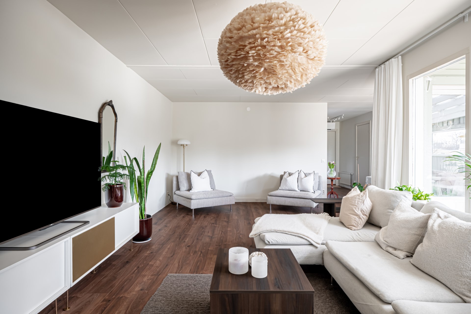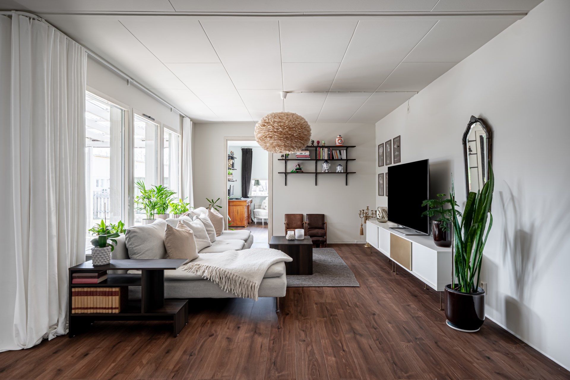 Från matplatsen leds du vidare till vardagsrummet, som ligger något mer avskilt och erbjuder en lugn och trivsam miljö för umgänge och avkoppling. Intill vardagsrummet finns även ett sovrum, vilket passar utmärkt som föräldrasovrum eller gästrum.