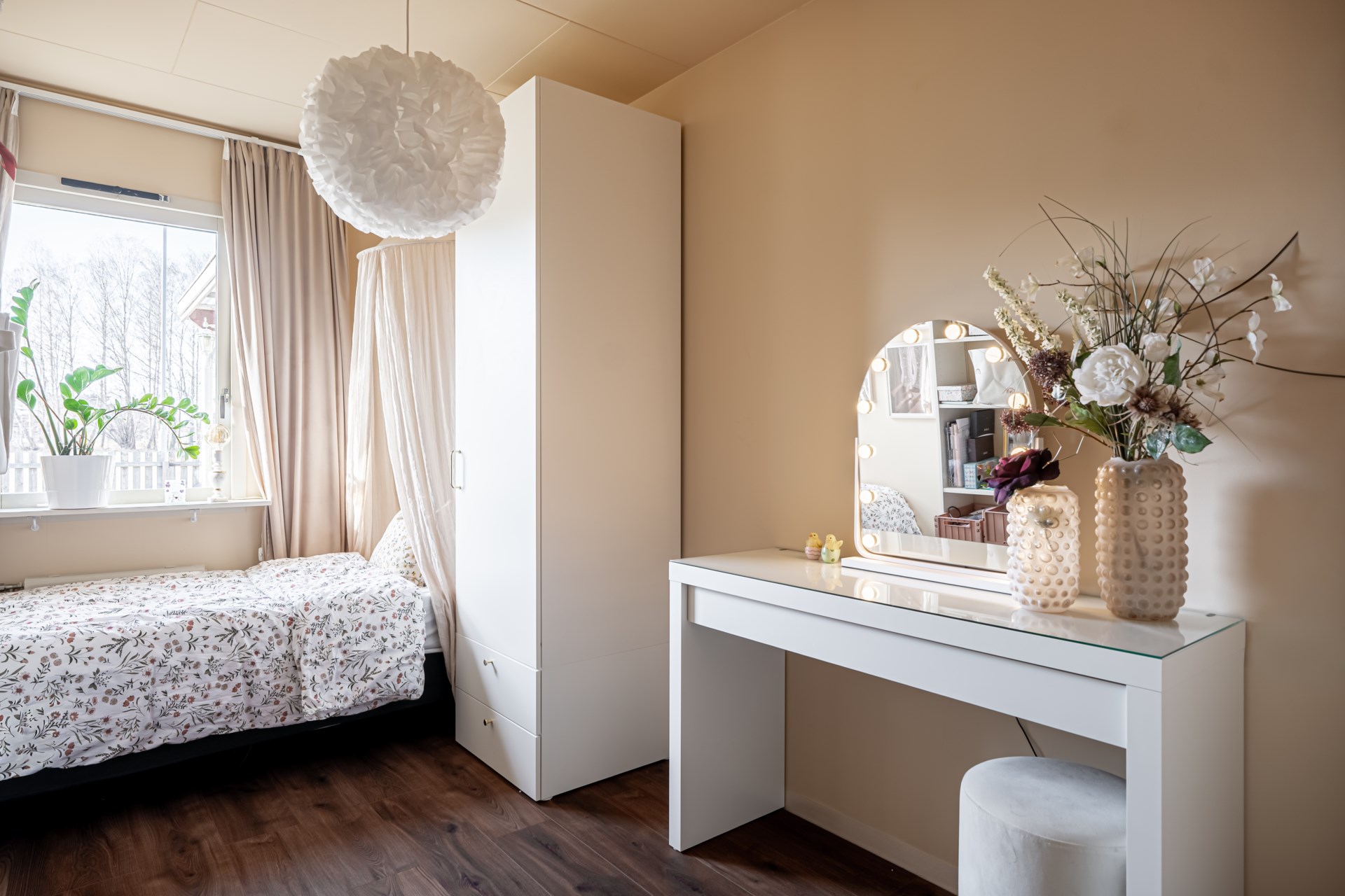 Den privata delen rymmer flera sovrum samlade tillsammans, kompletterat med ett badrum. Här finns även en praktisk tvättstuga med groventré samt tillhörande förråd som ger bra förvaringsmöjligheter.