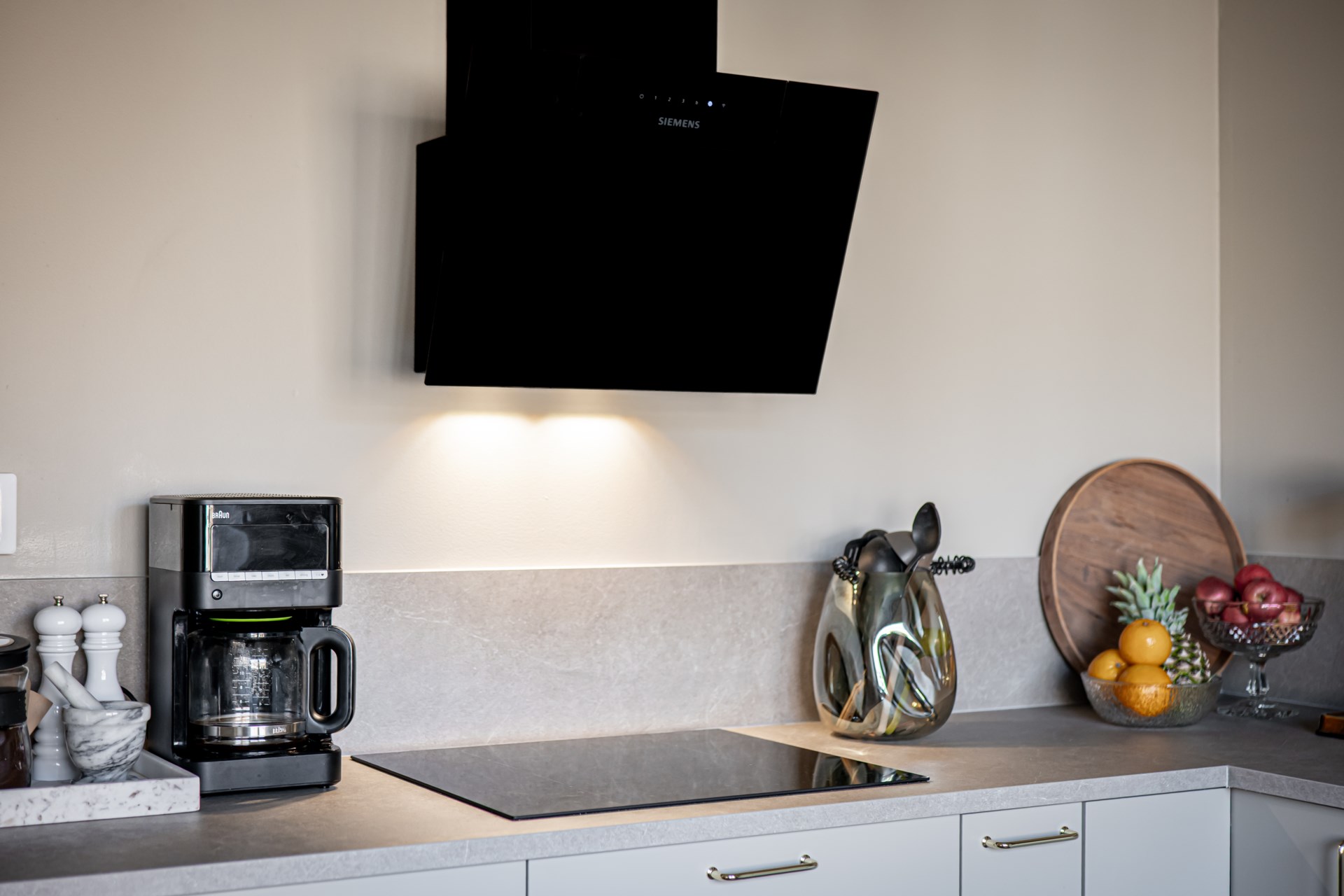 - Kök: Köket är modernt renoverat med släta luckor och fin bänkskiva med gott om plats för matlagning. Köket är utrustat med spishäll, fläkt, inbyggd ugn, integrerad diskmaskin samt integrerade kyl och frys i fullhöjd. I köket finns det plats för matbord med fyra stolar.