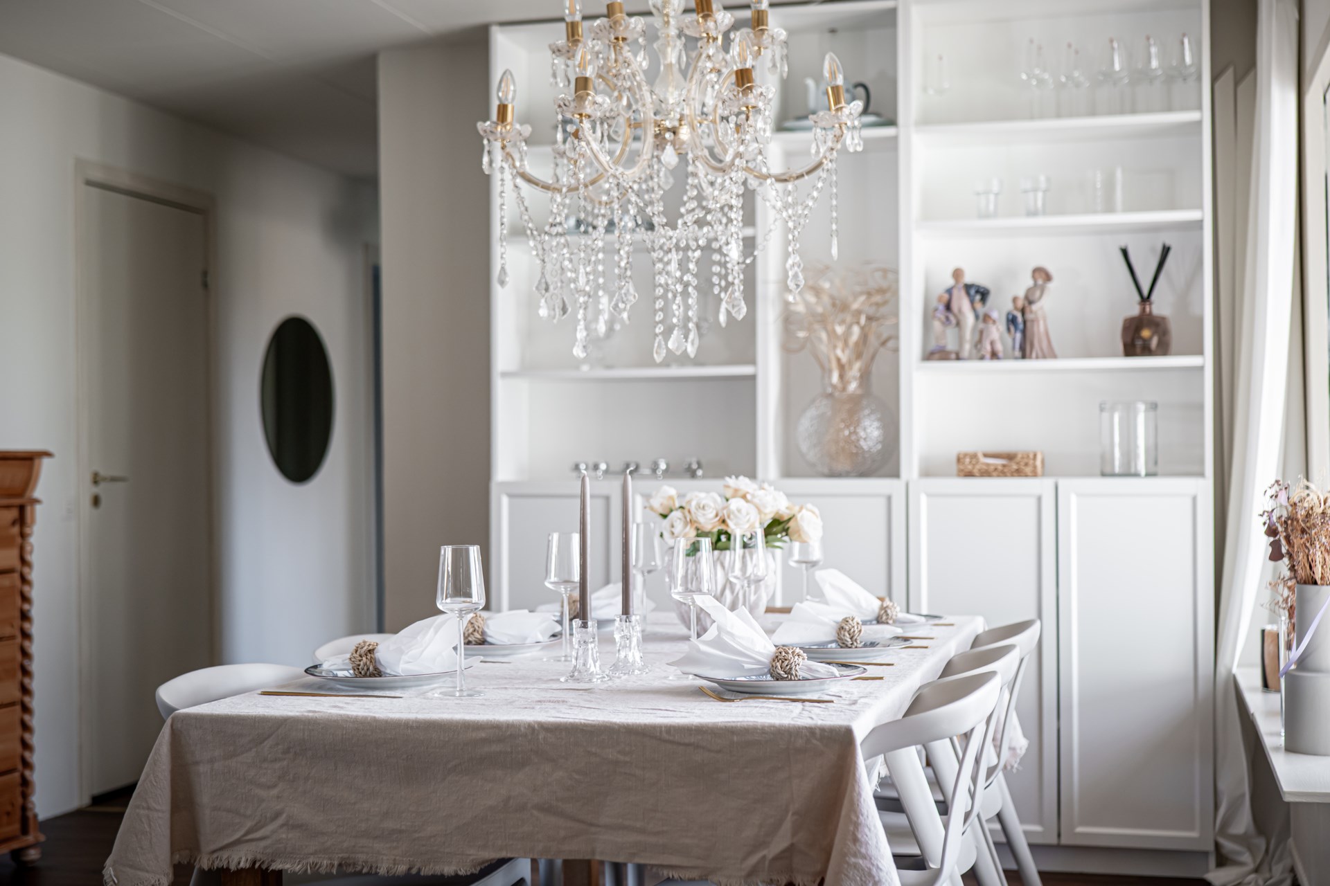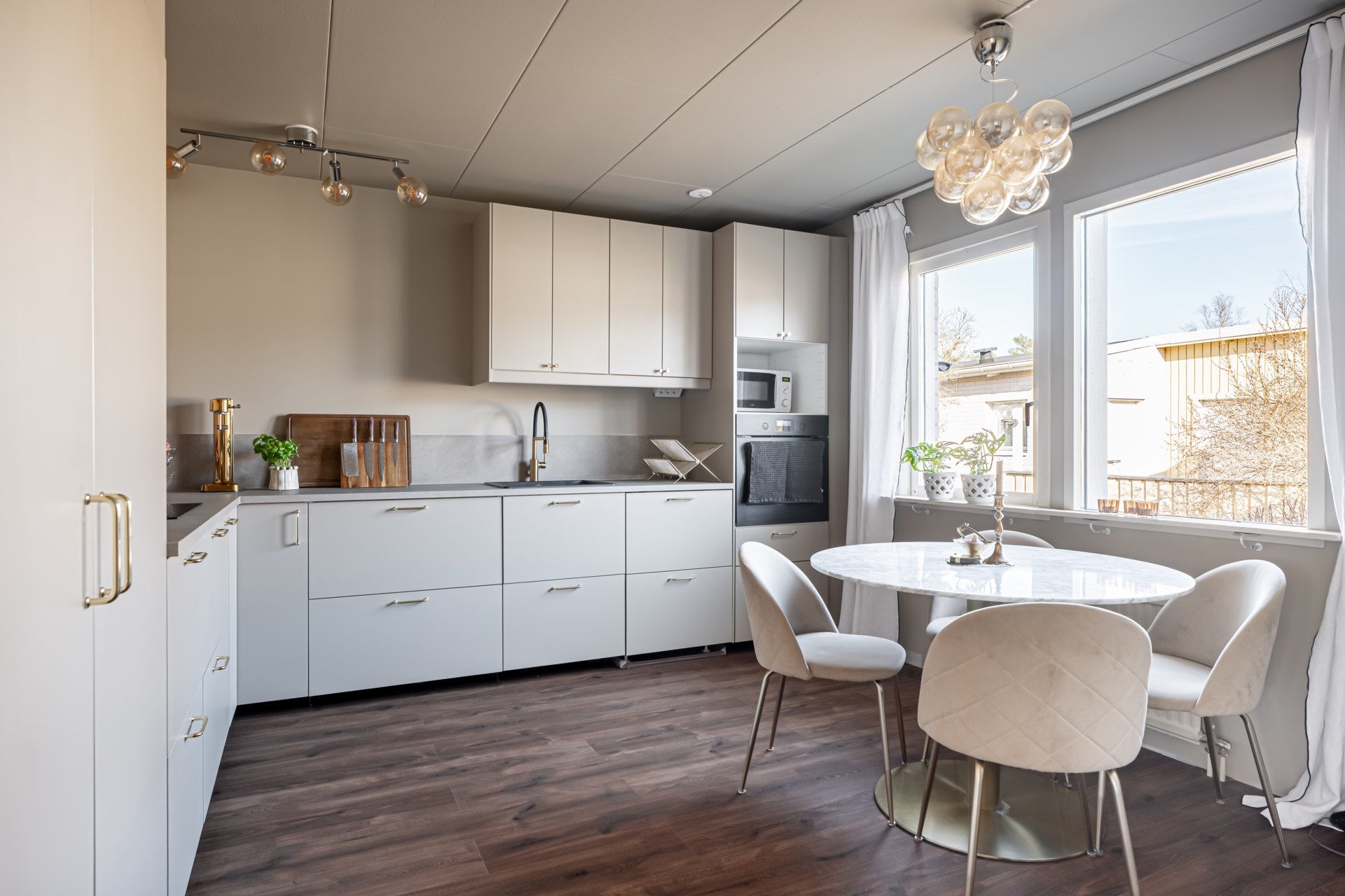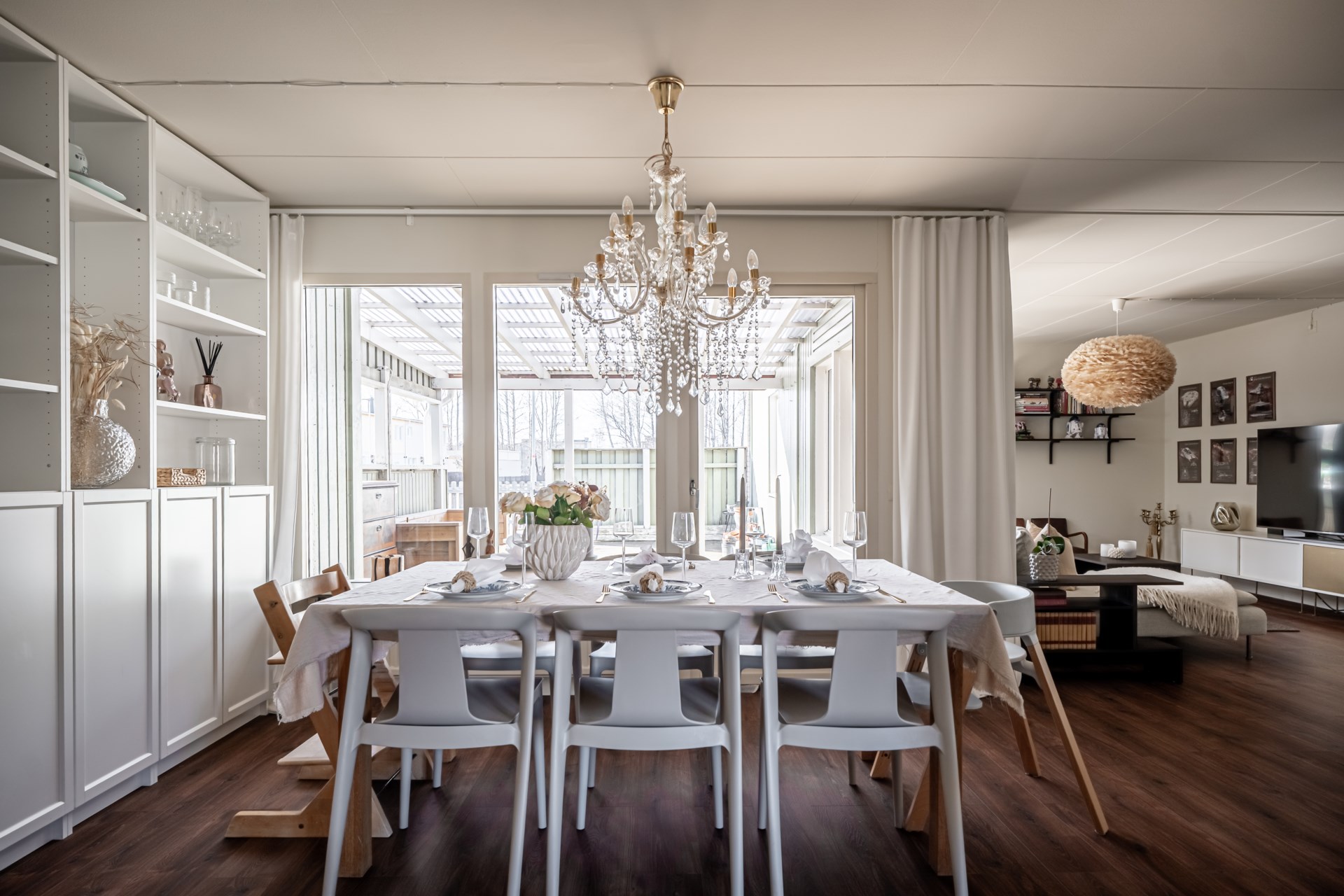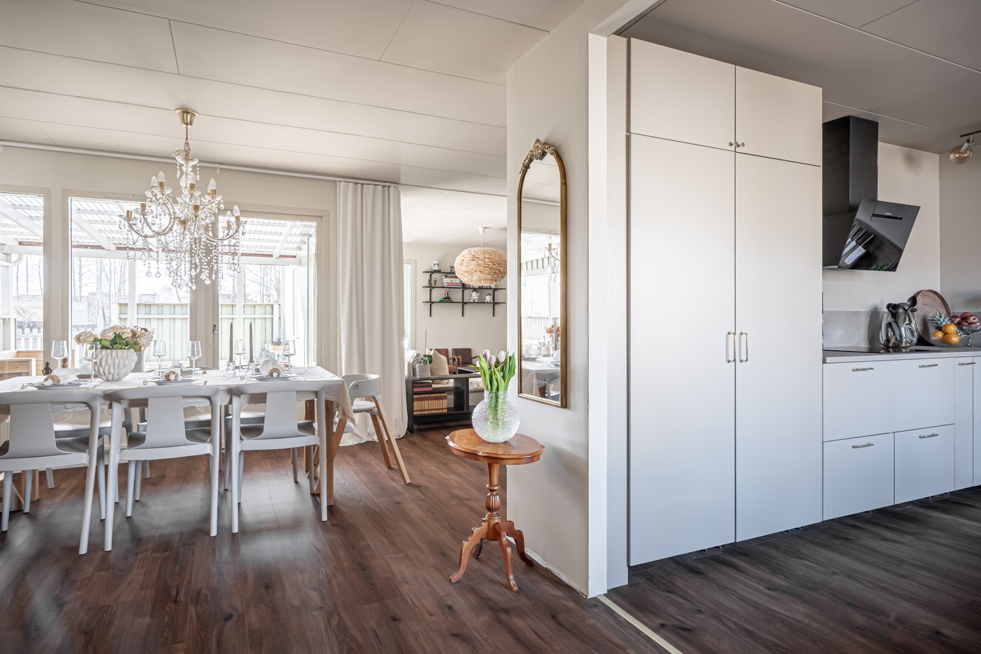 Vidare in i bostaden öppnar den centrala matplatsen upp sig, ett generöst utrymme med gott om plats för ett större matbord. Här finns det plats att samla familj och vänner, och rummet fungerar som hemmets naturliga samlingspunkt med fin kontakt till flera av bostadens rum.