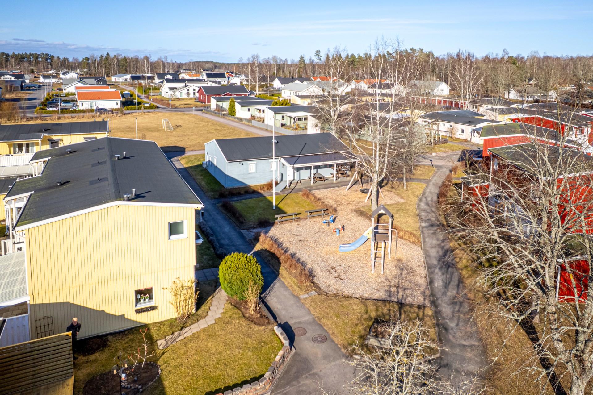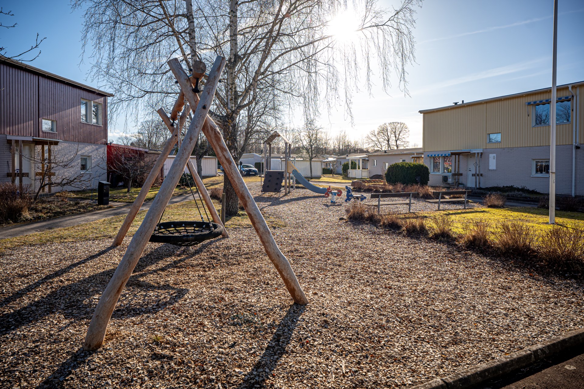 Området är lugnt och barnvänligt med fina lekplatser och grönytor i närheten , en trygg miljö där både stora och små trivs.